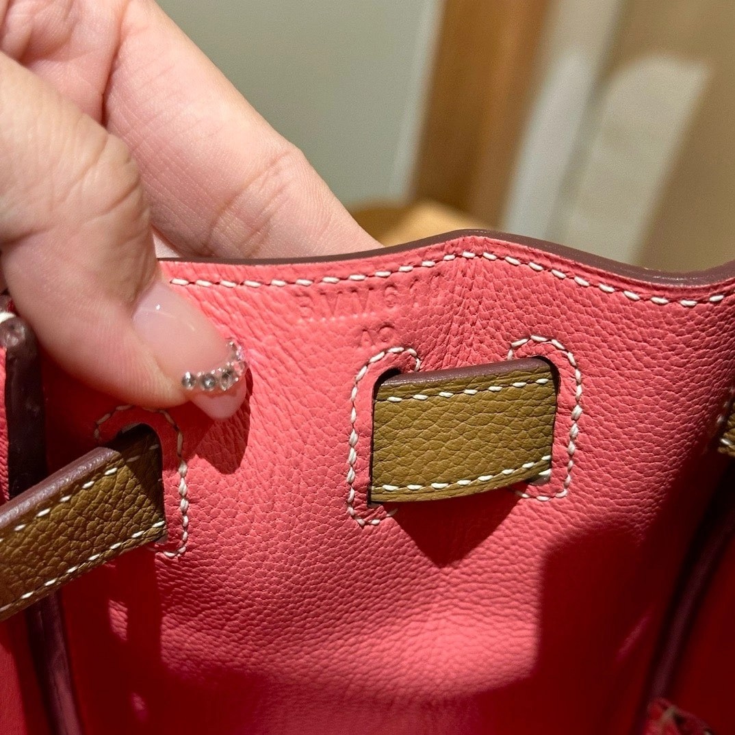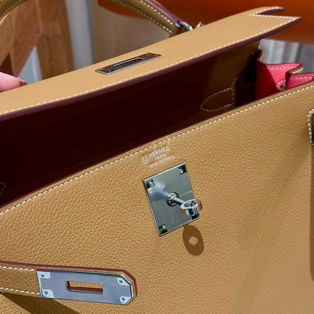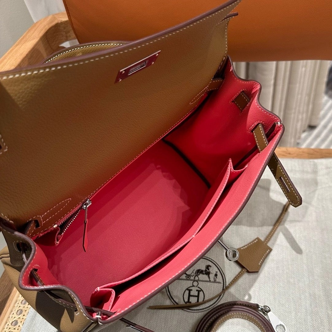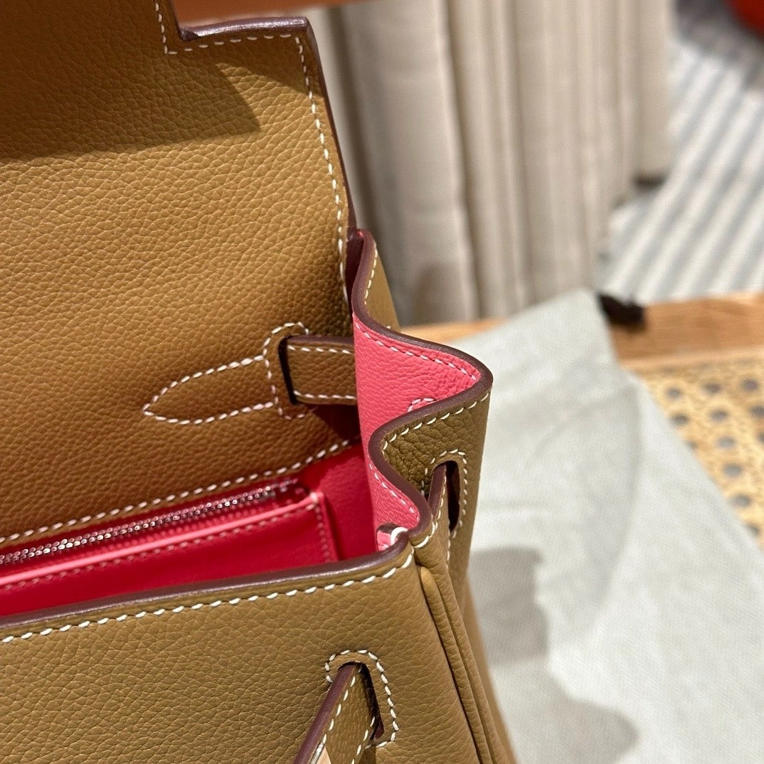 凯莉28cm,焦糖色内拼夏日粉,法国进口软牛皮,银扣,高级全手工专属定制‼️