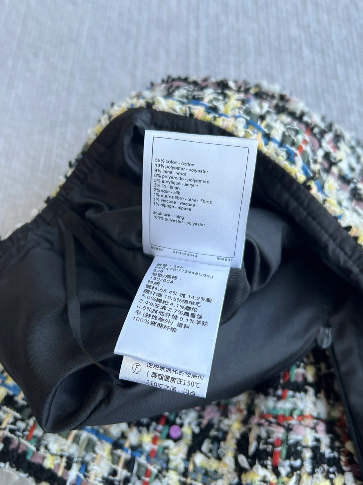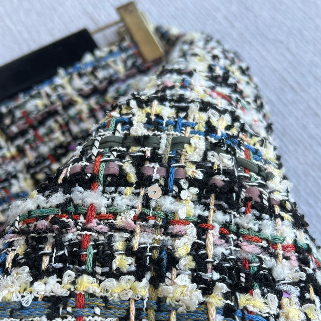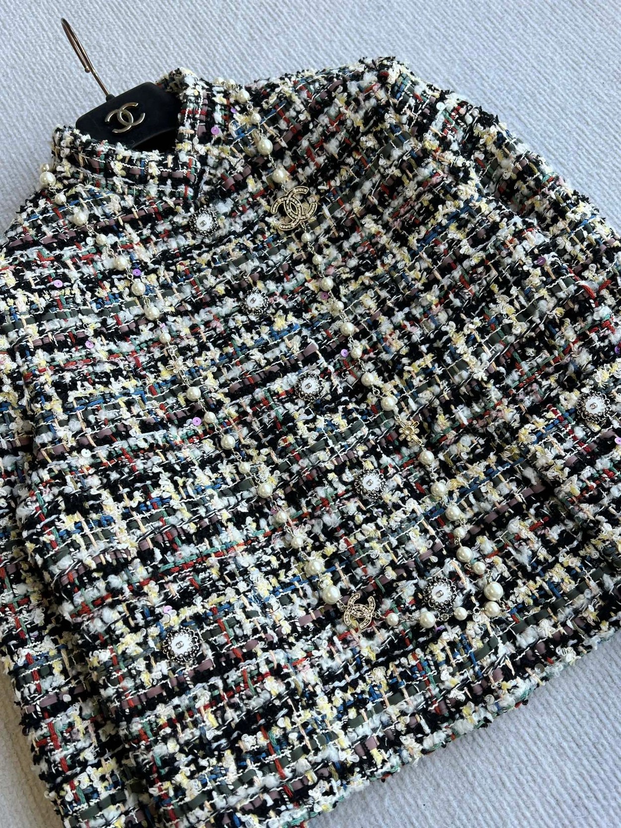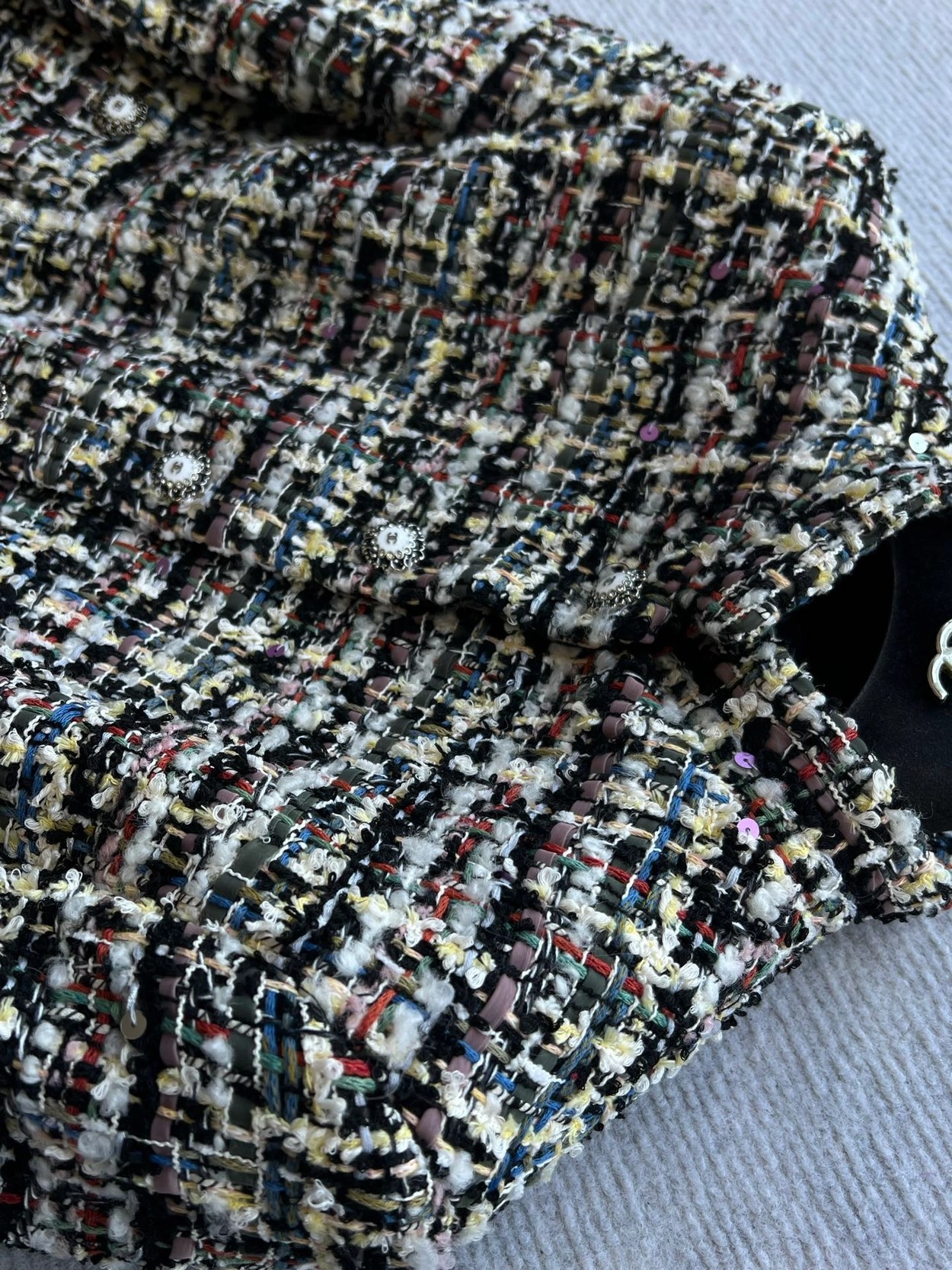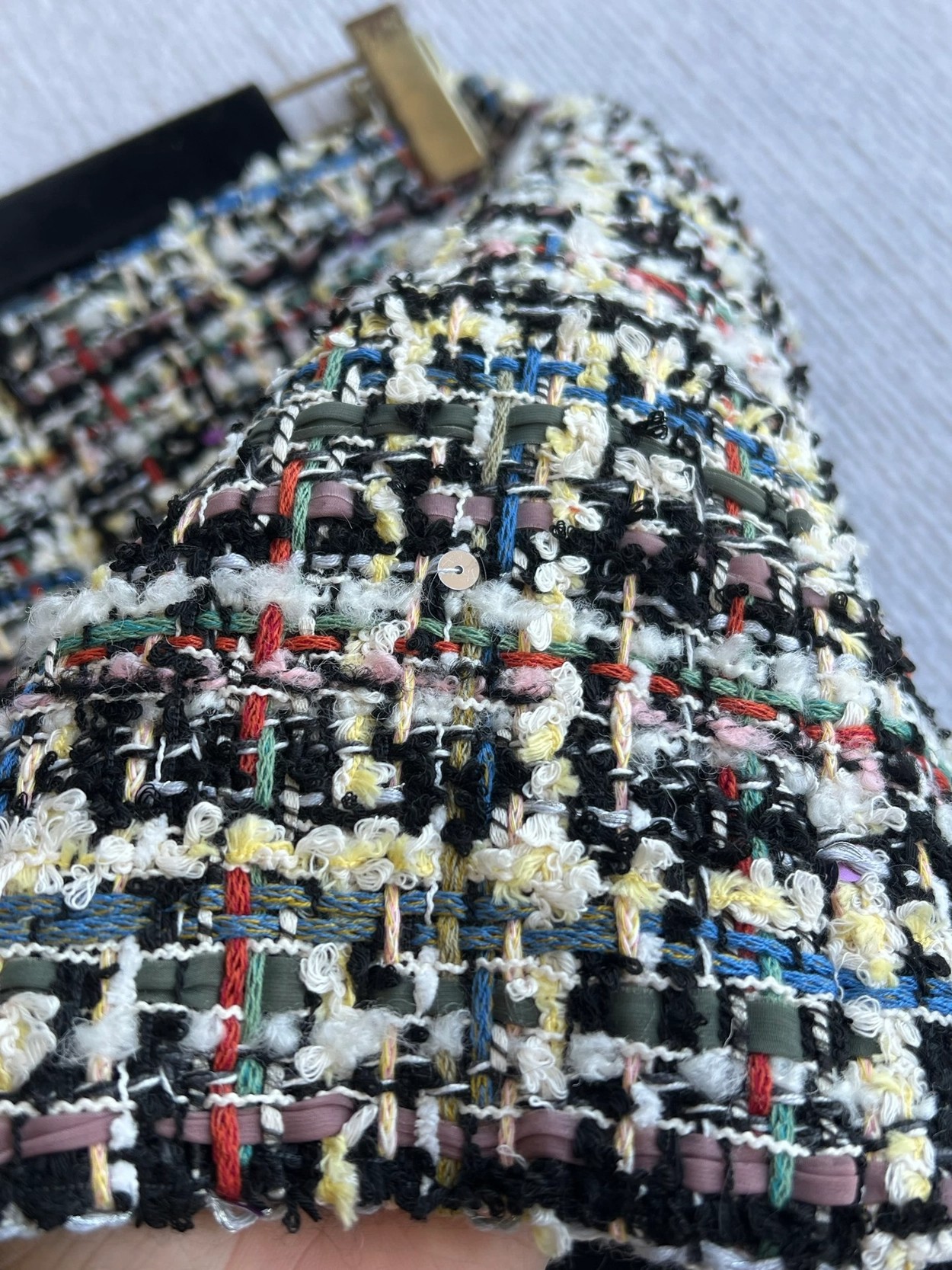 𝐜𝐡𝐚𝐧𝐞𝐥 𝟐𝟔𝐂25/26早春系列新款彩色外套+半裙套装~ 定制彩纱粗花呢小香风套装 上衣采用立领短款剪裁 彩纱混纺的粗花呢面料肌理感十足 黑白红蓝交织出丰富层次 系列半裙采用A字版型藏肉显瘦 还能拉长腿部线条 整套搭配自带高级氛围感 一套搭配不易出错 36/38/40✈️S胸围94 衣长47 肩宽39 袖长58