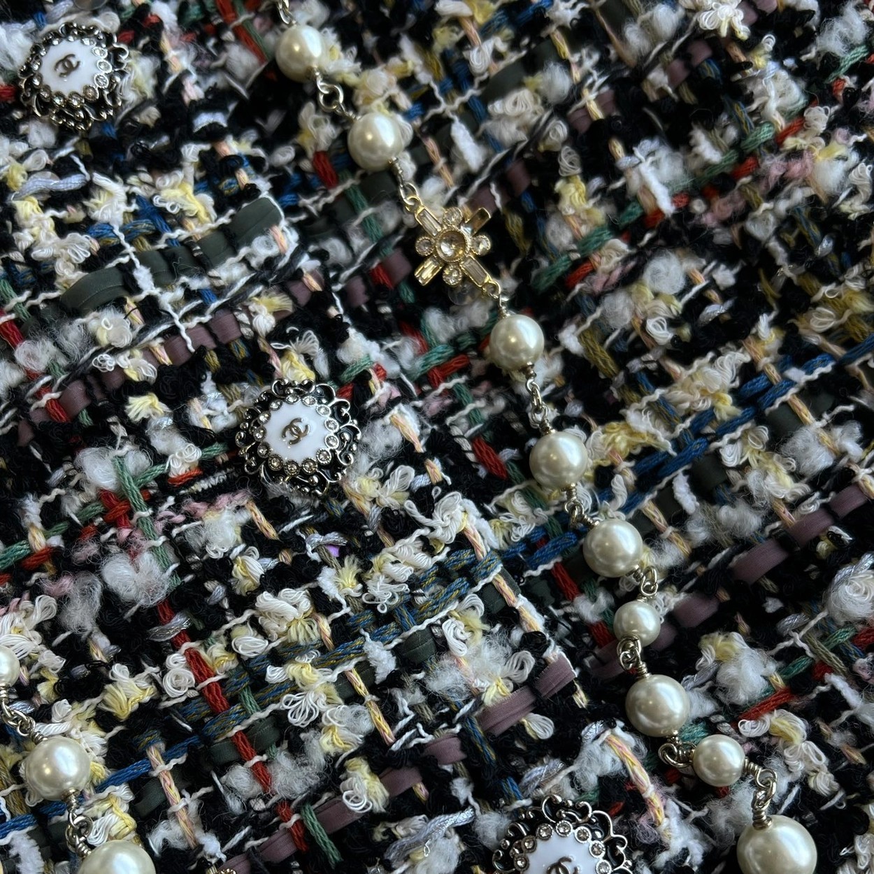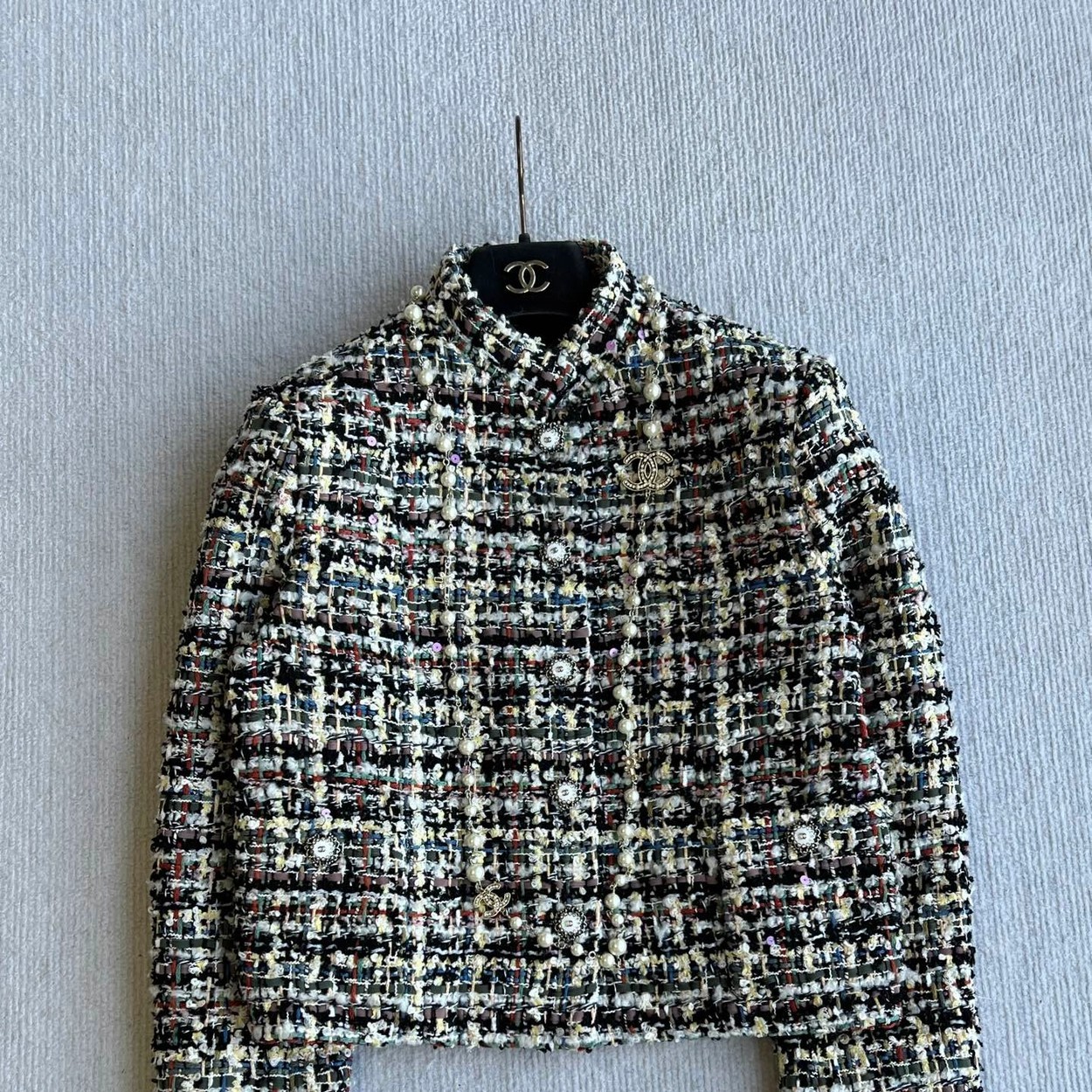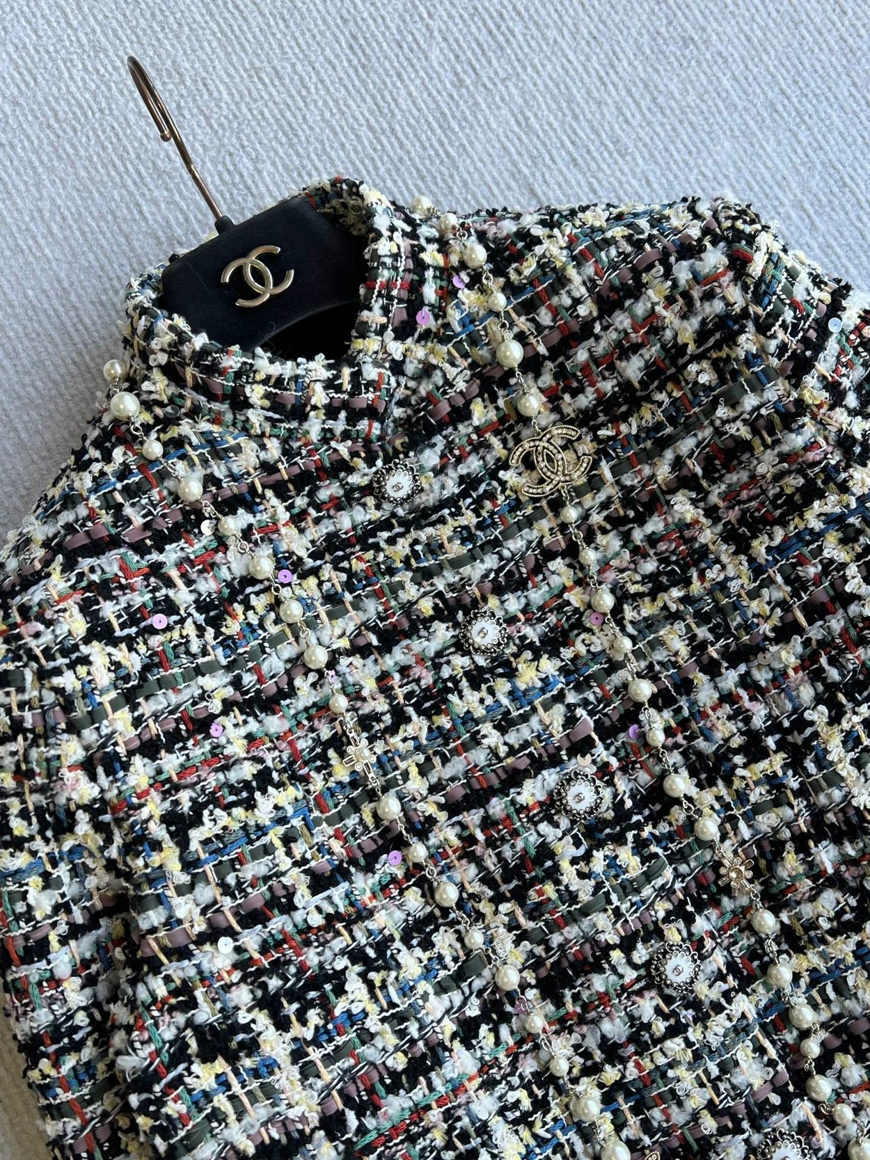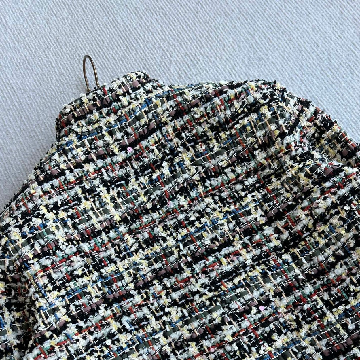 𝐜𝐡𝐚𝐧𝐞𝐥 𝟐𝟔𝐂25/26早春系列新款彩色外套+半裙套装~ 定制彩纱粗花呢小香风套装 上衣采用立领短款剪裁 彩纱混纺的粗花呢面料肌理感十足 黑白红蓝交织出丰富层次 系列半裙采用A字版型藏肉显瘦 还能拉长腿部线条 整套搭配自带高级氛围感 一套搭配不易出错 36/38/40✈️S胸围94 衣长47 肩宽39 袖长58
