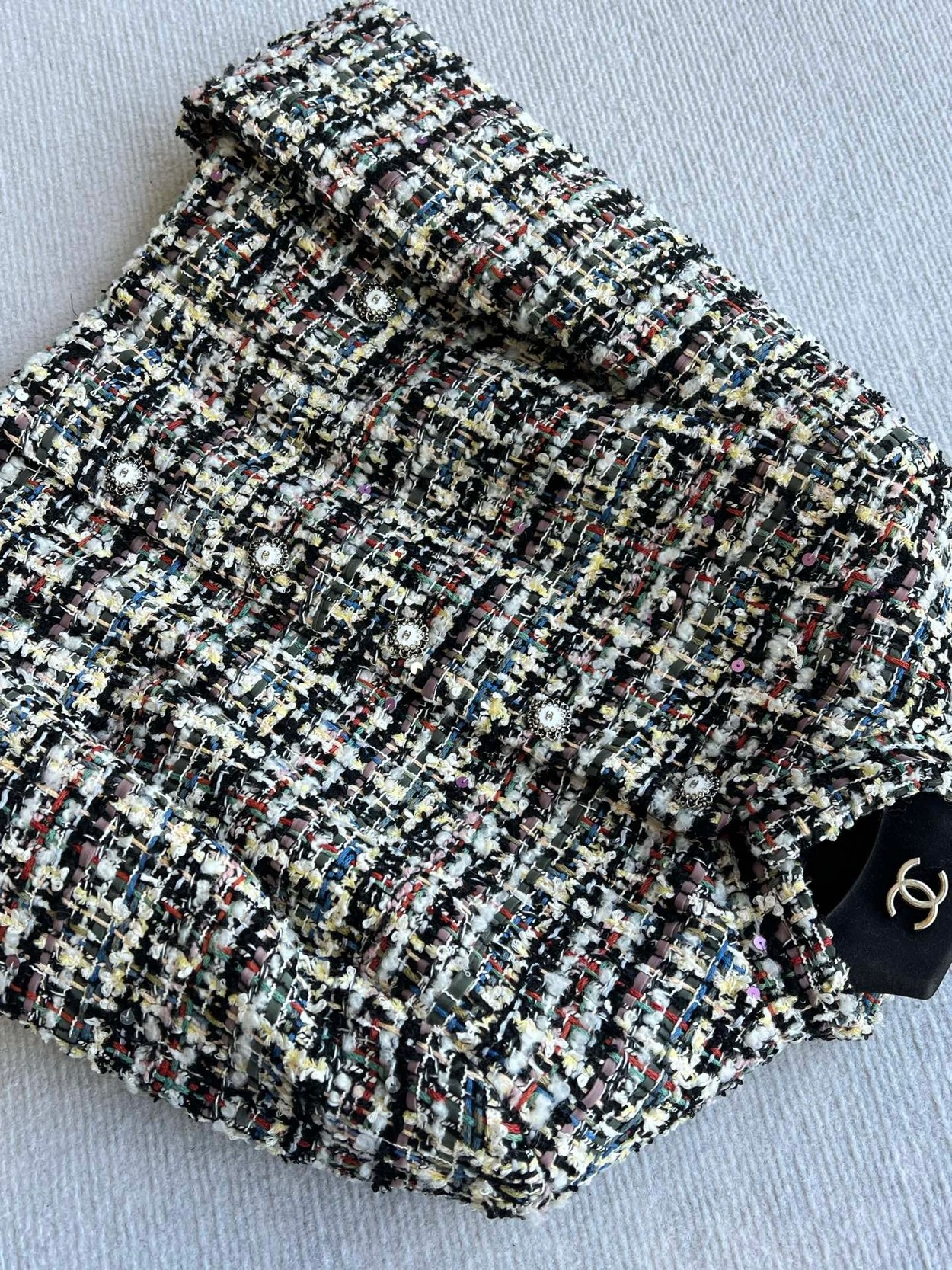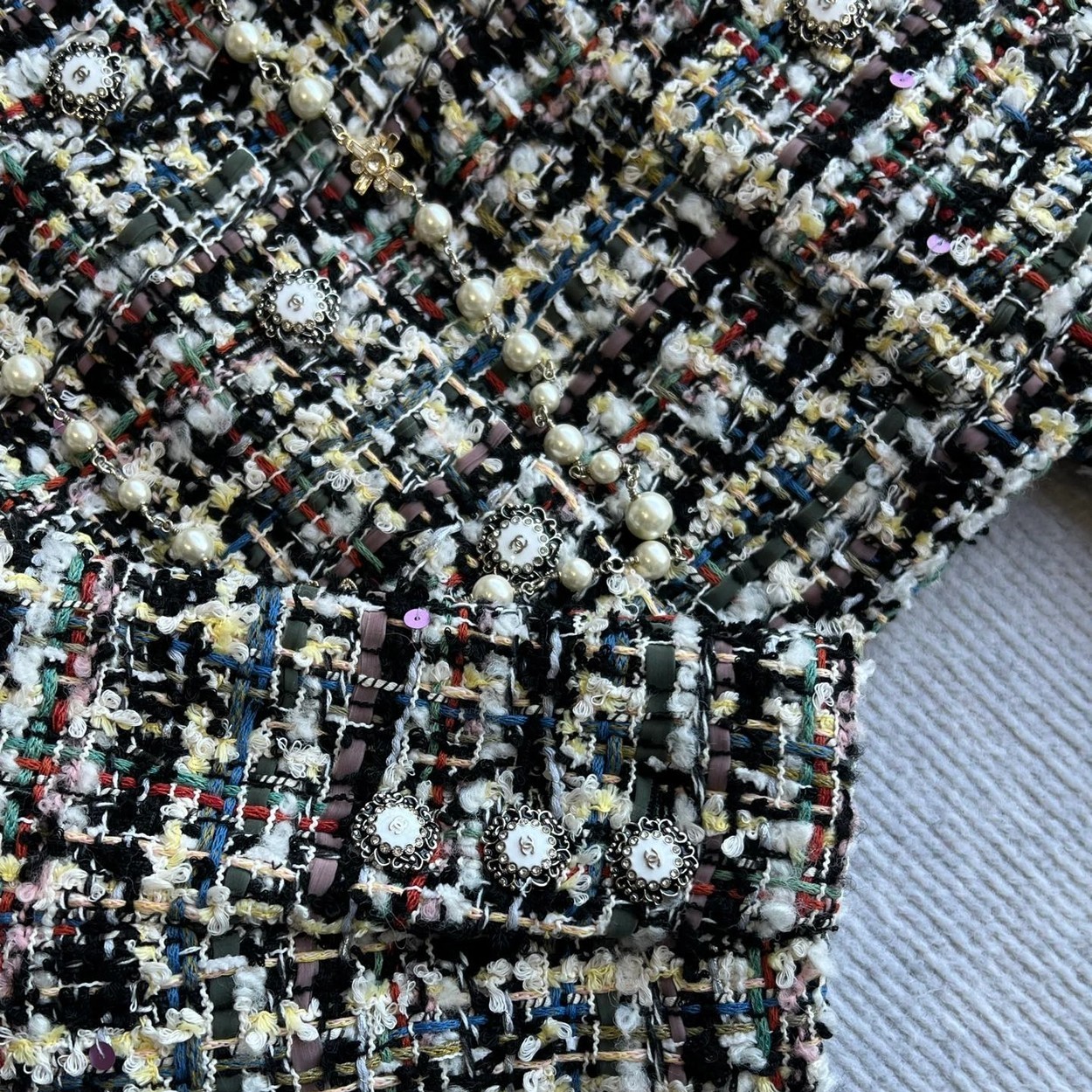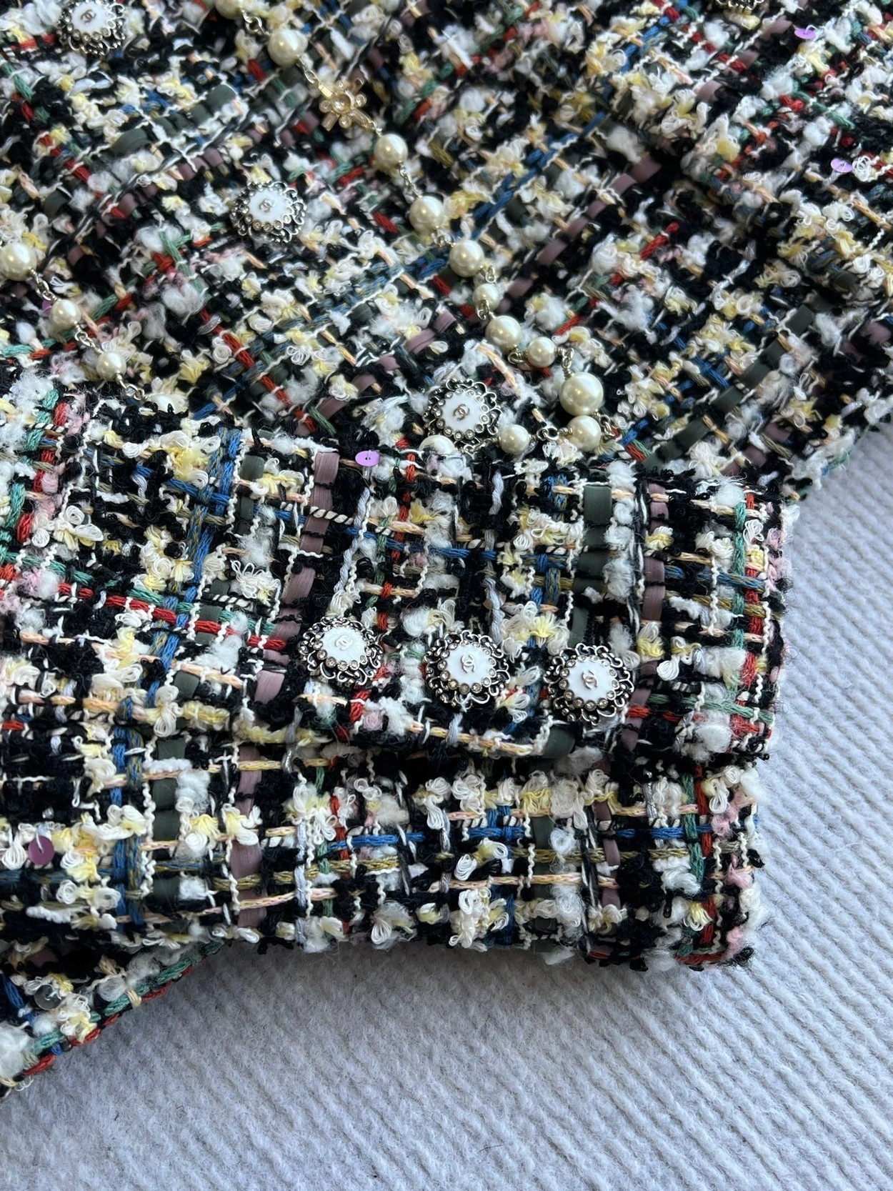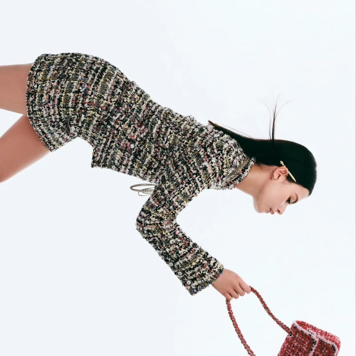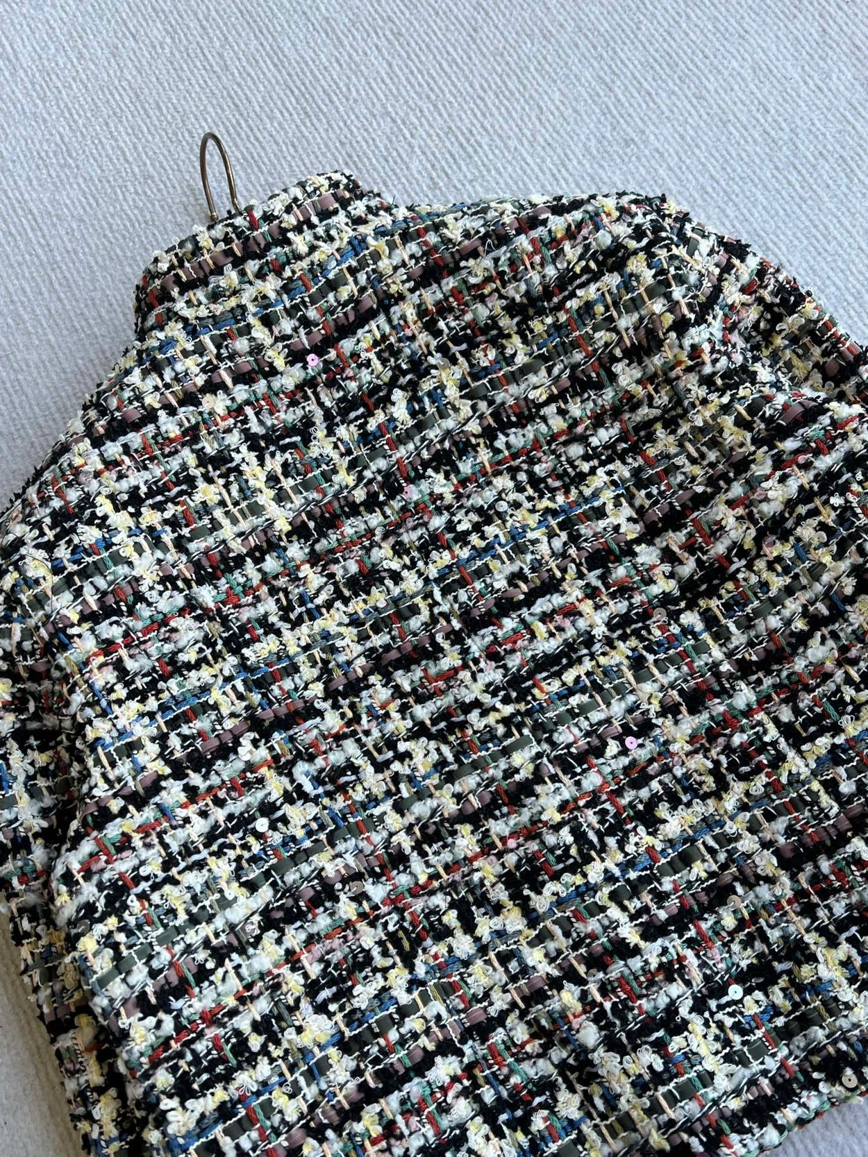 𝐜𝐡𝐚𝐧𝐞𝐥 𝟐𝟔𝐂25/26早春系列新款彩色外套+半裙套装~ 定制彩纱粗花呢小香风套装 上衣采用立领短款剪裁 彩纱混纺的粗花呢面料肌理感十足 黑白红蓝交织出丰富层次 系列半裙采用A字版型藏肉显瘦 还能拉长腿部线条 整套搭配自带高级氛围感 一套搭配不易出错 36/38/40✈️ S腰围70 裙长37~