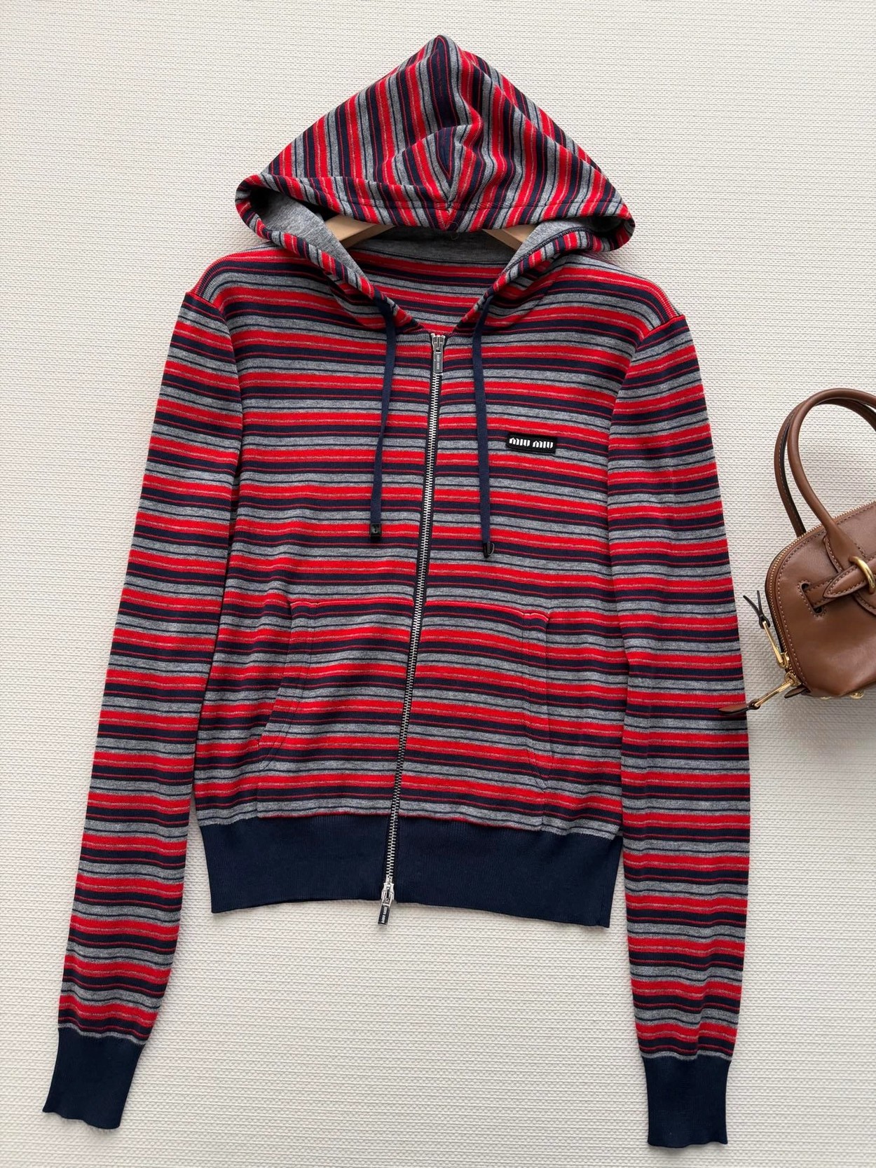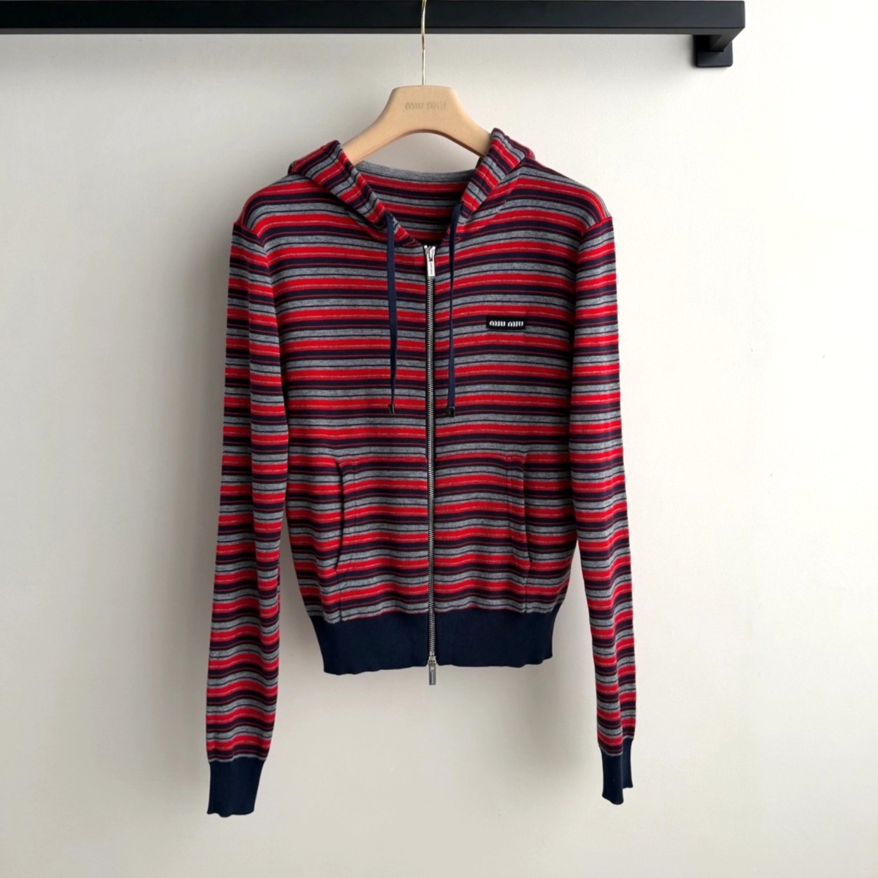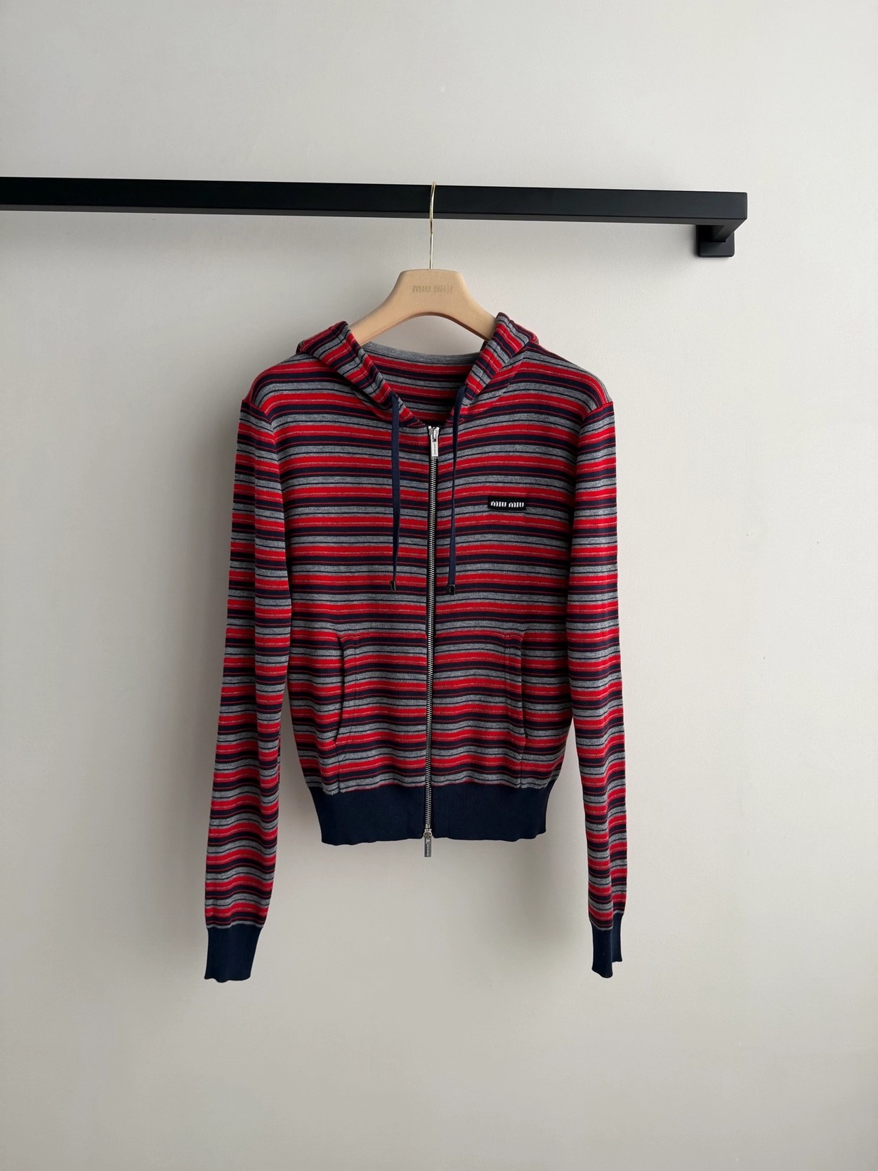 Miumi*🆕徽标字母条纹连帽外套经典的条纹元素上身将复古时尚完美演绎!叠穿单穿百搭款😁红灰藏青配色搭配拖衬的人更加甜美又清纯~常规收身版型上身修饰脖颈比例,胸前徽标字母图案点缀,低调又不失时尚~学院减龄风搭配必入!1:1超赞版型,早春最新单品,认准独家高版本 SML.AE0666520