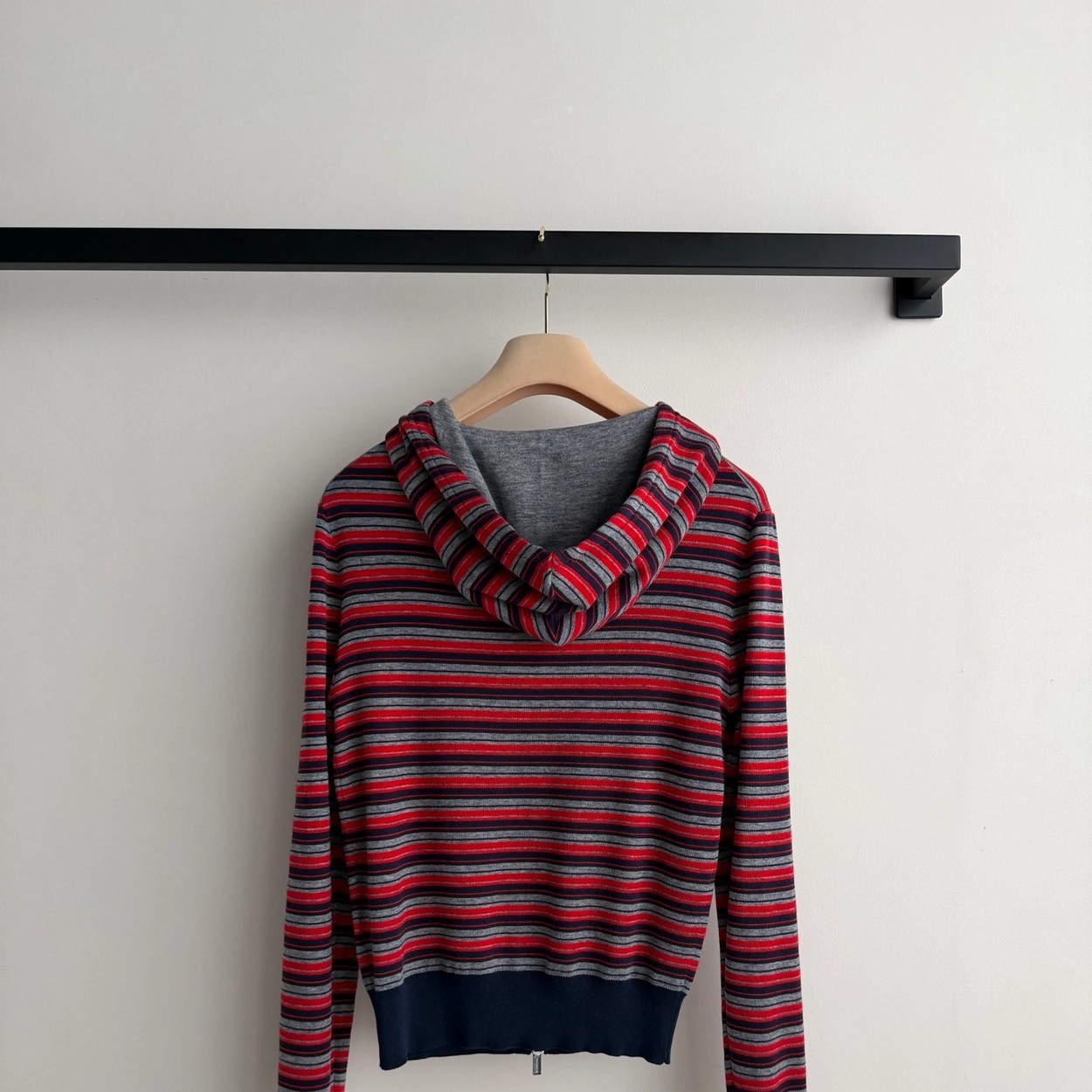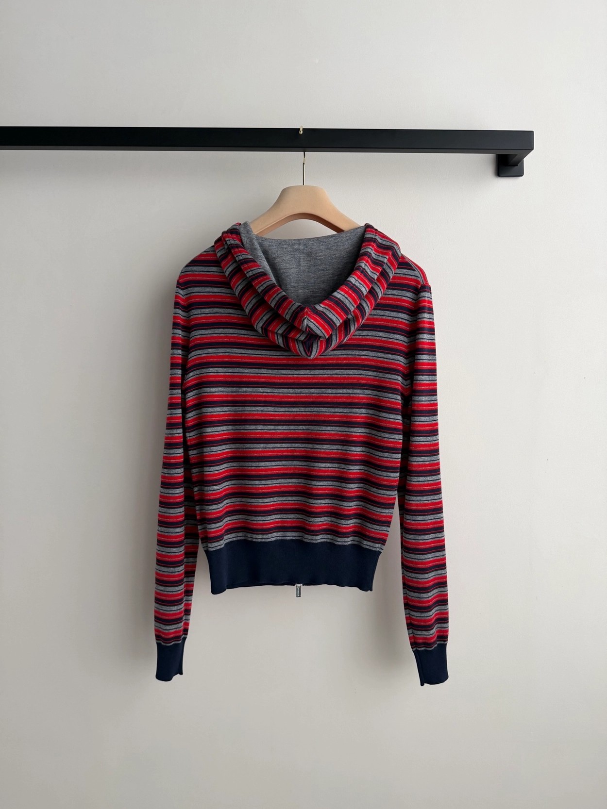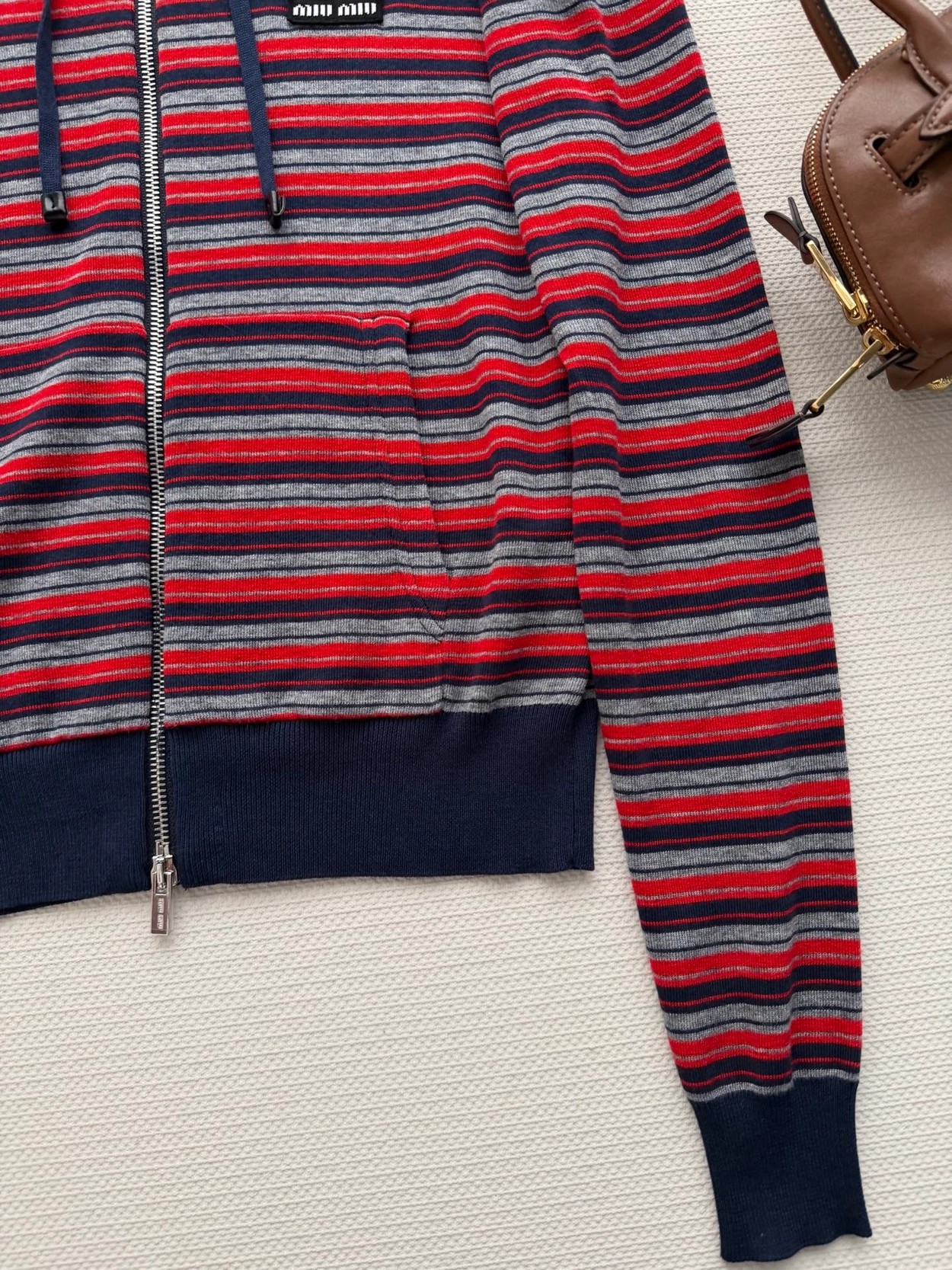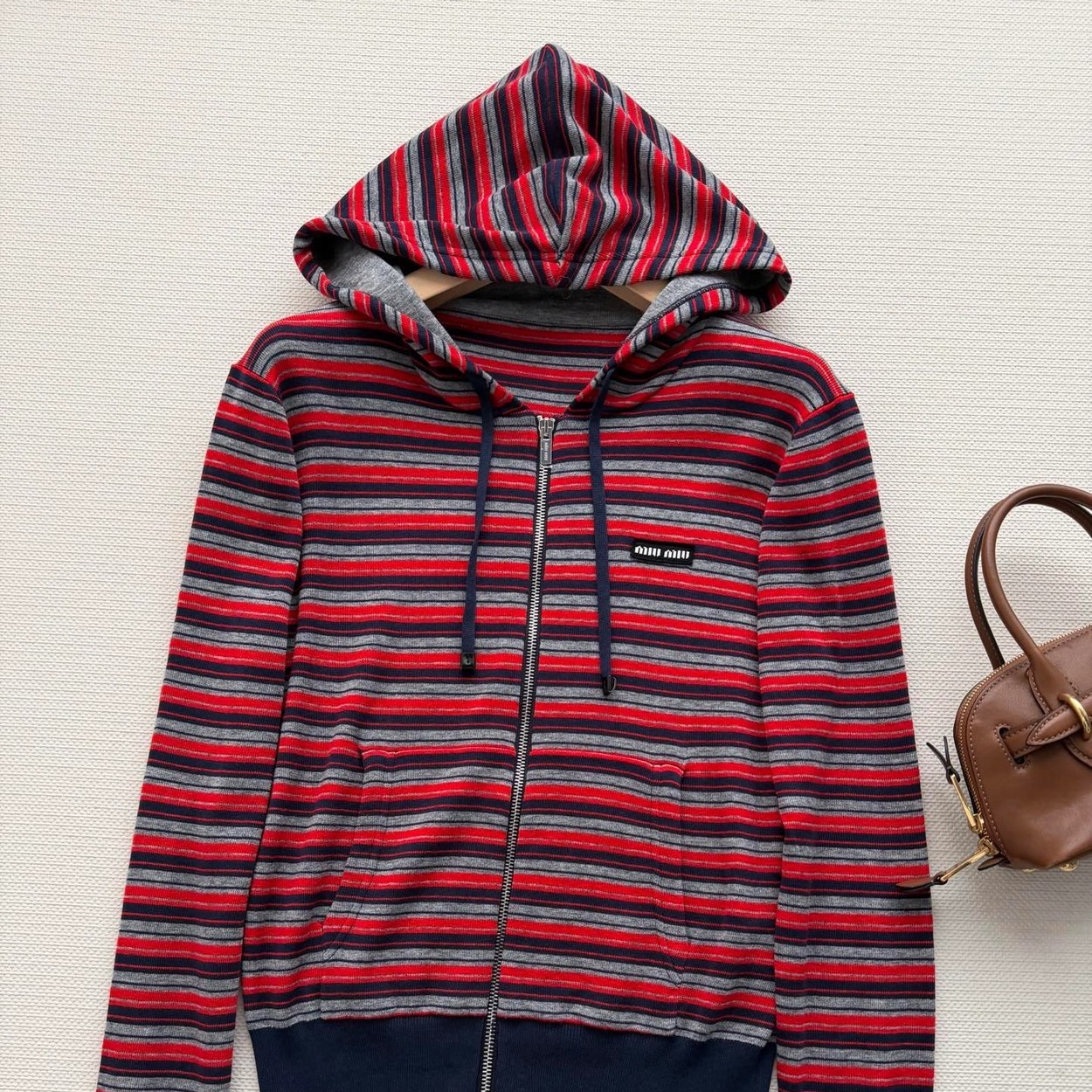 Miumi*🆕徽标字母条纹连帽外套经典的条纹元素上身将复古时尚完美演绎!叠穿单穿百搭款😁红灰藏青配色搭配拖衬的人更加甜美又清纯~常规收身版型上身修饰脖颈比例,胸前徽标字母图案点缀,低调又不失时尚~学院减龄风搭配必入!1:1超赞版型,早春最新单品,认准独家高版本 SML.AE0666520