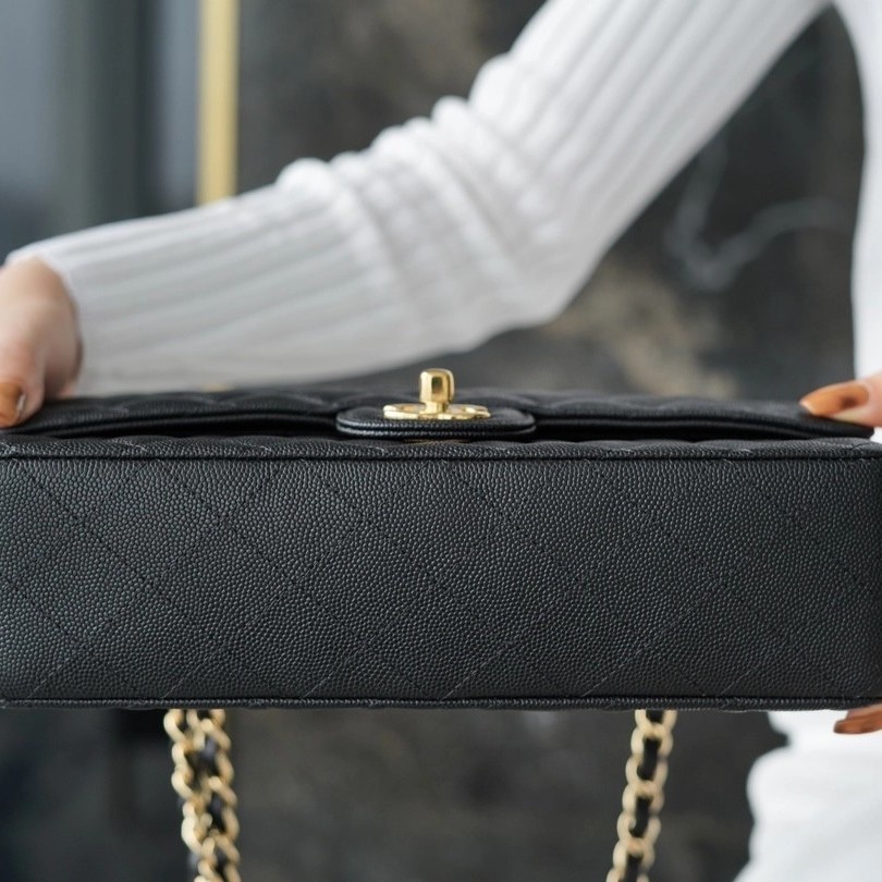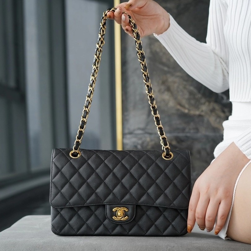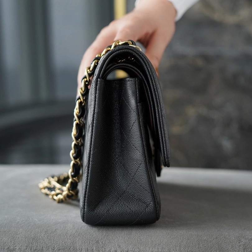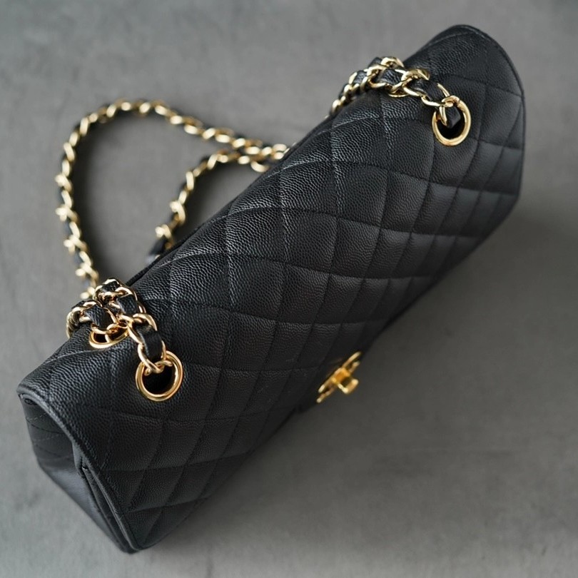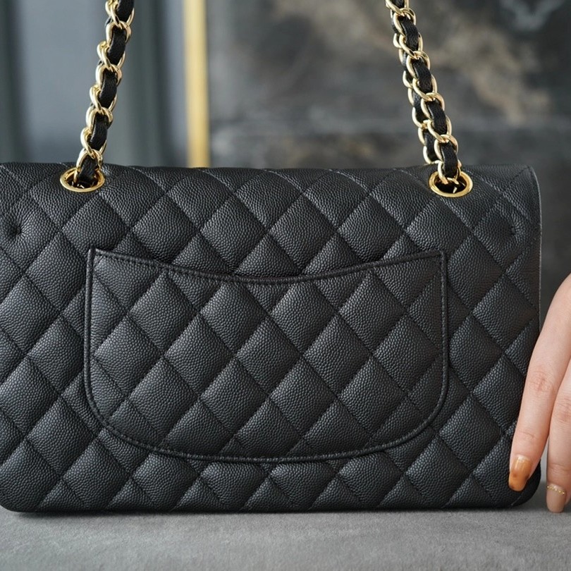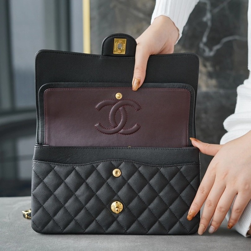 ℂ𝔽 𝗖𝗹𝗮𝘀𝘀𝗶𝗰 𝗙𝗹𝗮𝗽 |原厂鱼子酱🐂 中号 黑金🖤 法国🇫🇷 𝐇𝐚𝐚𝐬原厂鱼子酱🐂,颗粒手感色泽堪称人间极品,十一年纯手工主打经典款,正面翻盖与包身走线完美契合,包边菱格正好为1/2,精益求精为您呈现正品的神韵! 尺寸:𝟐𝟓𝐜𝐦  🔍:11120802