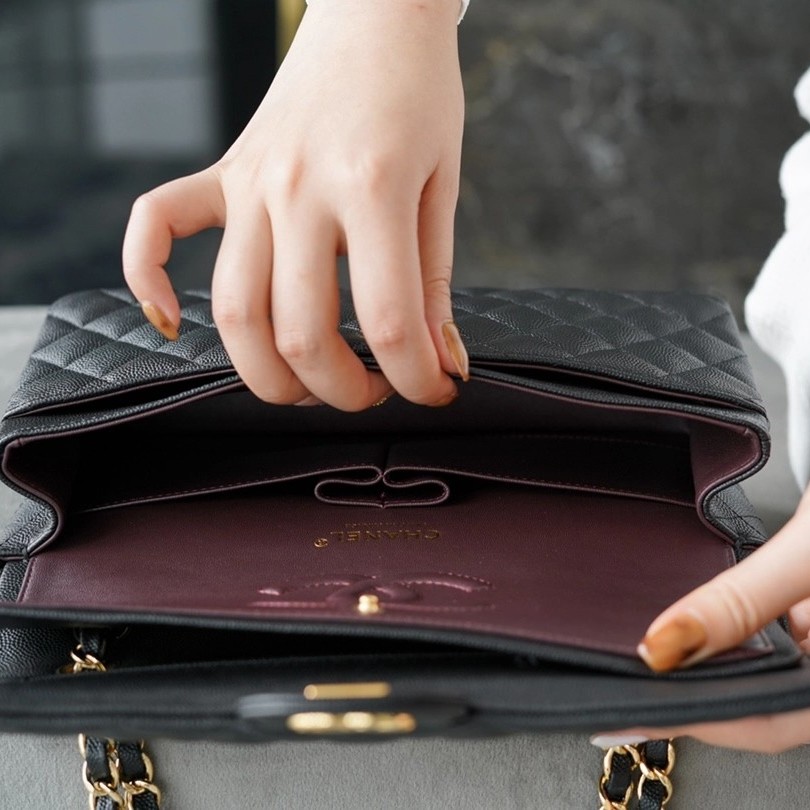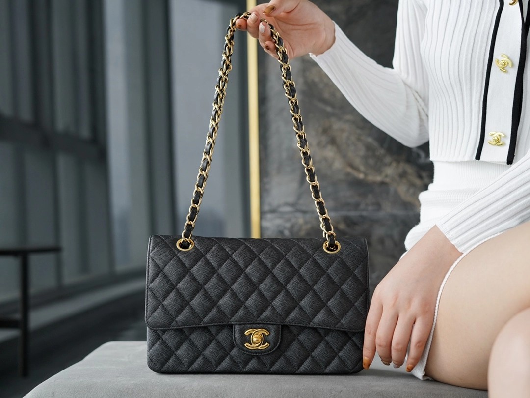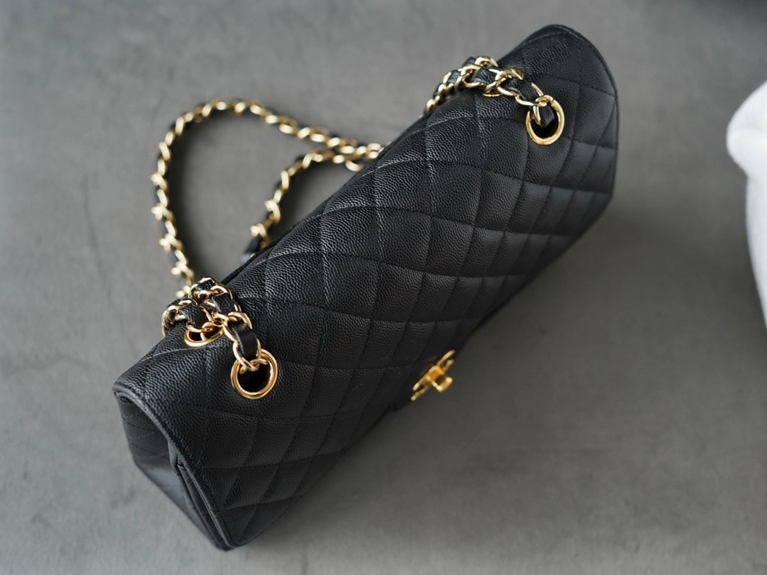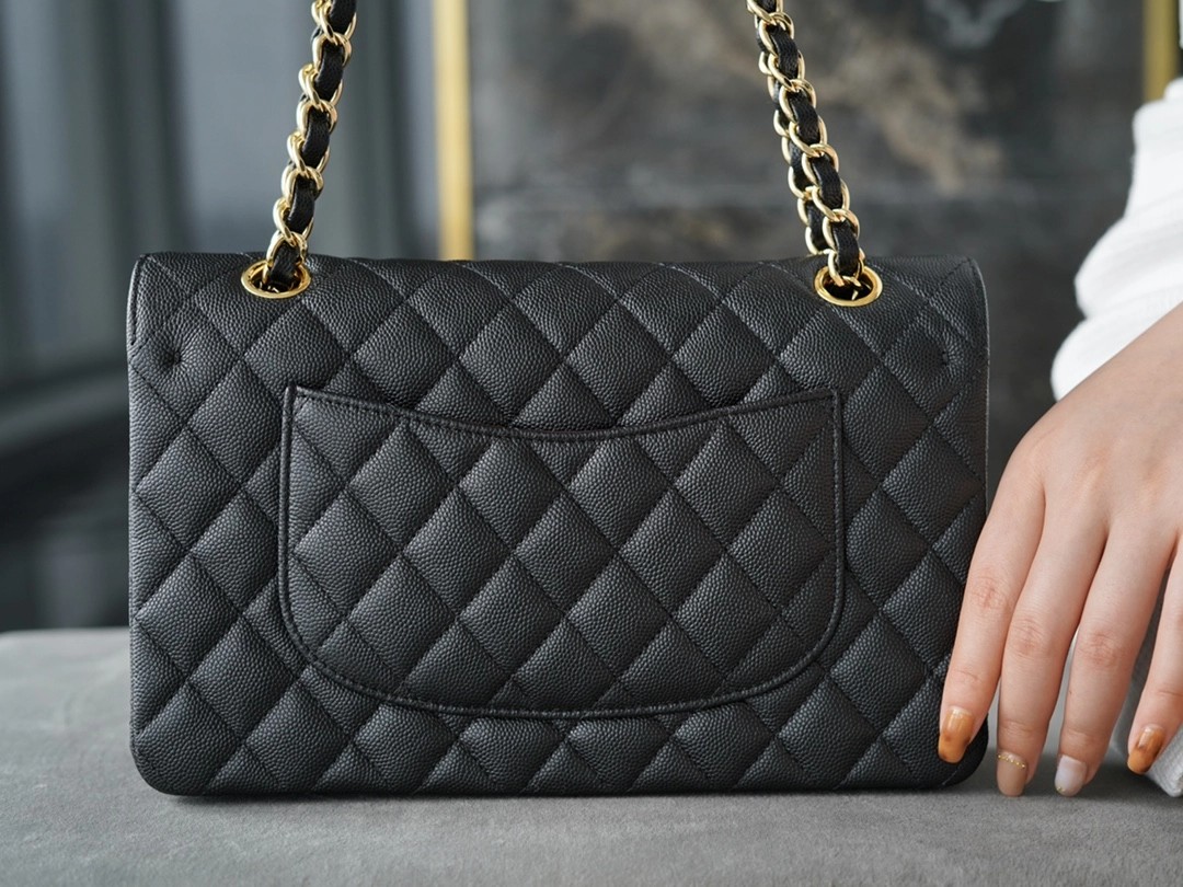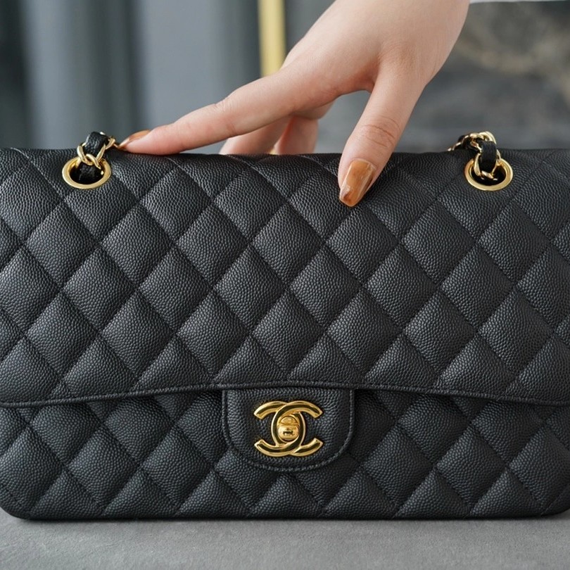 ℂ𝔽 𝗖𝗹𝗮𝘀𝘀𝗶𝗰 𝗙𝗹𝗮𝗽 |原厂鱼子酱🐂 中号 黑金🖤 法国🇫🇷 𝐇𝐚𝐚𝐬原厂鱼子酱🐂,颗粒手感色泽堪称人间极品,十一年纯手工主打经典款,正面翻盖与包身走线完美契合,包边菱格正好为1/2,精益求精为您呈现正品的神韵! 尺寸:𝟐𝟓𝐜𝐦  🔍:11120802
