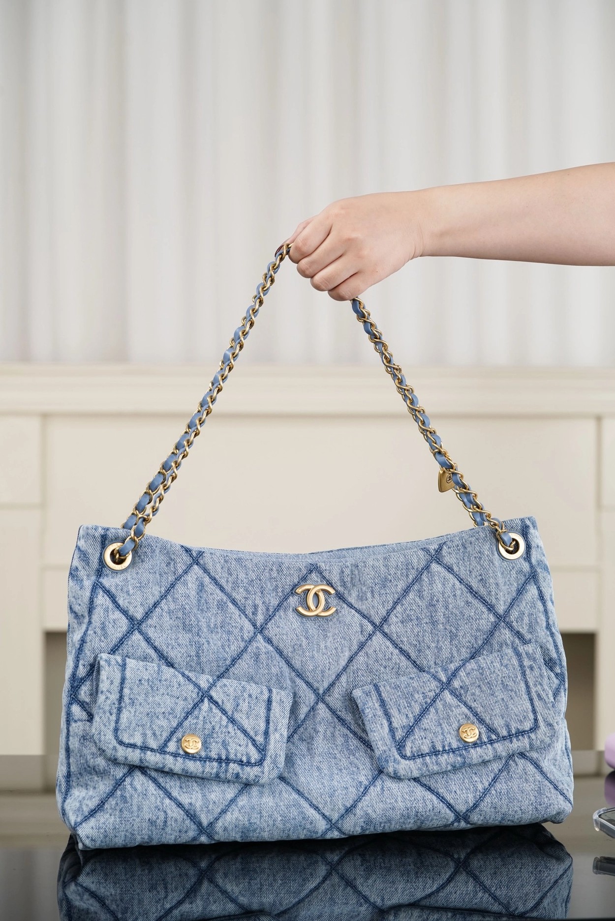 𝐂𝐡𝐚𝐧𝐞𝐥 𝟐𝟓𝐤 𝐇𝐨𝐛𝐨购物袋 浅蓝牛仔👜 秋冬必备大包🎊慵懒随性的水洗牛仔👏🏻 经典菱格纹与双𝐂五金、链条上的小金牌更是吸睛🤩 复古腔调拉满的同时、又因为𝐇𝐨𝐛𝐨的随性慵懒,让这只包成为“颜值硬通货” 👜 把“优雅”跟“松弛”柔和的恰到好处~  包型软乎乎、随手一挎就很有范😎  前后都有口袋夹层、收纳的一把好手👏🏻  你绝对会为这只包包的所有细节心动!!   尺寸:𝟑𝟖𝐱𝟐𝟔𝐱𝟏𝟏𝐜𝐦   🔍:25610861
