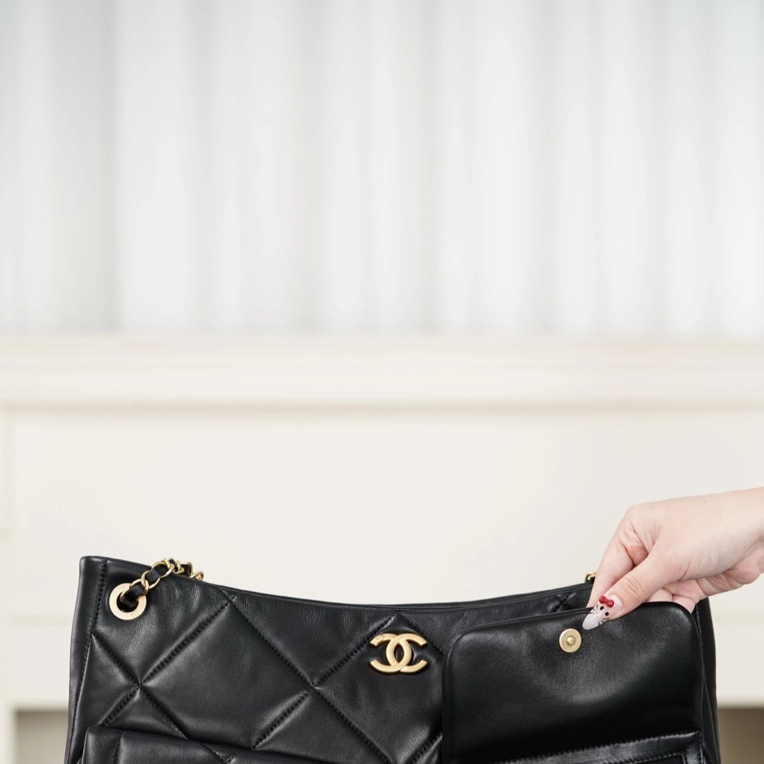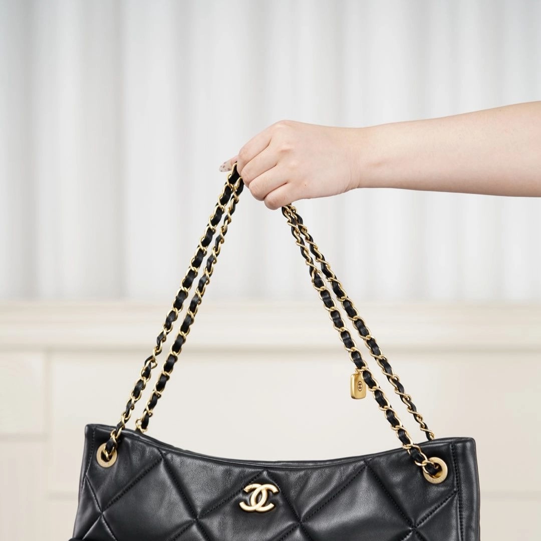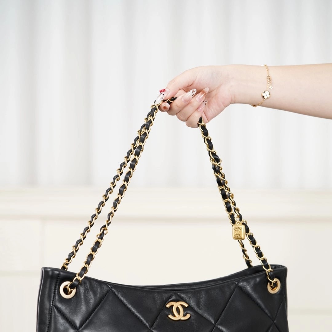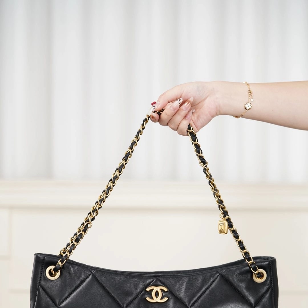 𝐂𝐡𝐚𝐧𝐞𝐥 𝟐𝟓𝐤 𝐇𝐨𝐛𝐨购物袋👜 黑金羊皮🐑 秋冬必备大包🎊巧克力般丝滑的黑色山羊皮🐑 手感细腻绵软!经典菱格纹与双𝐂五金、链条上的小金牌更是吸睛🤩 复古腔调拉满的同时、又因为𝐇𝐨𝐛𝐨的随性慵懒,让这只包成为“颜值硬通货” 👜 把“优雅”跟“松弛”柔和的恰到好处~  包型软乎乎、随手一挎就很有范😎  前后都有口袋夹层、收纳的一把好手👏🏻  你绝对会为这只包包的所有细节心动!!   尺寸:𝟑𝟖𝐱𝟐𝟔𝐱𝟏𝟏𝐜𝐦   🔍:25610861