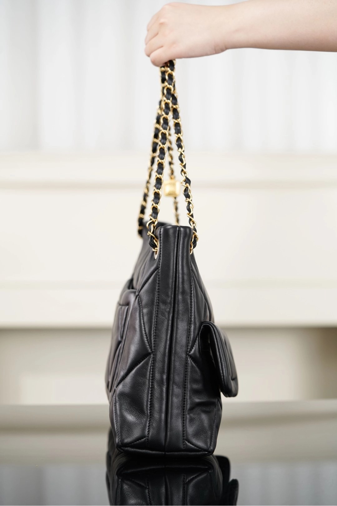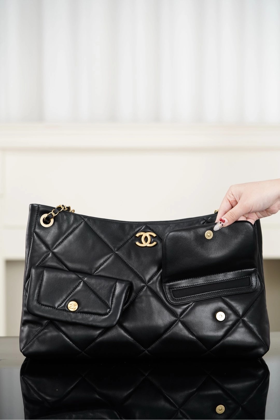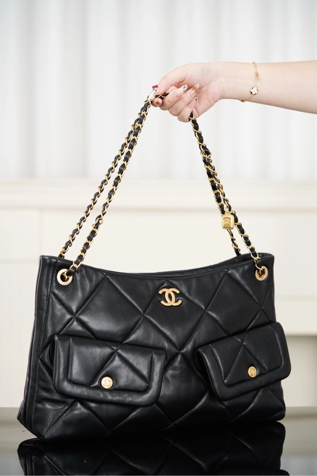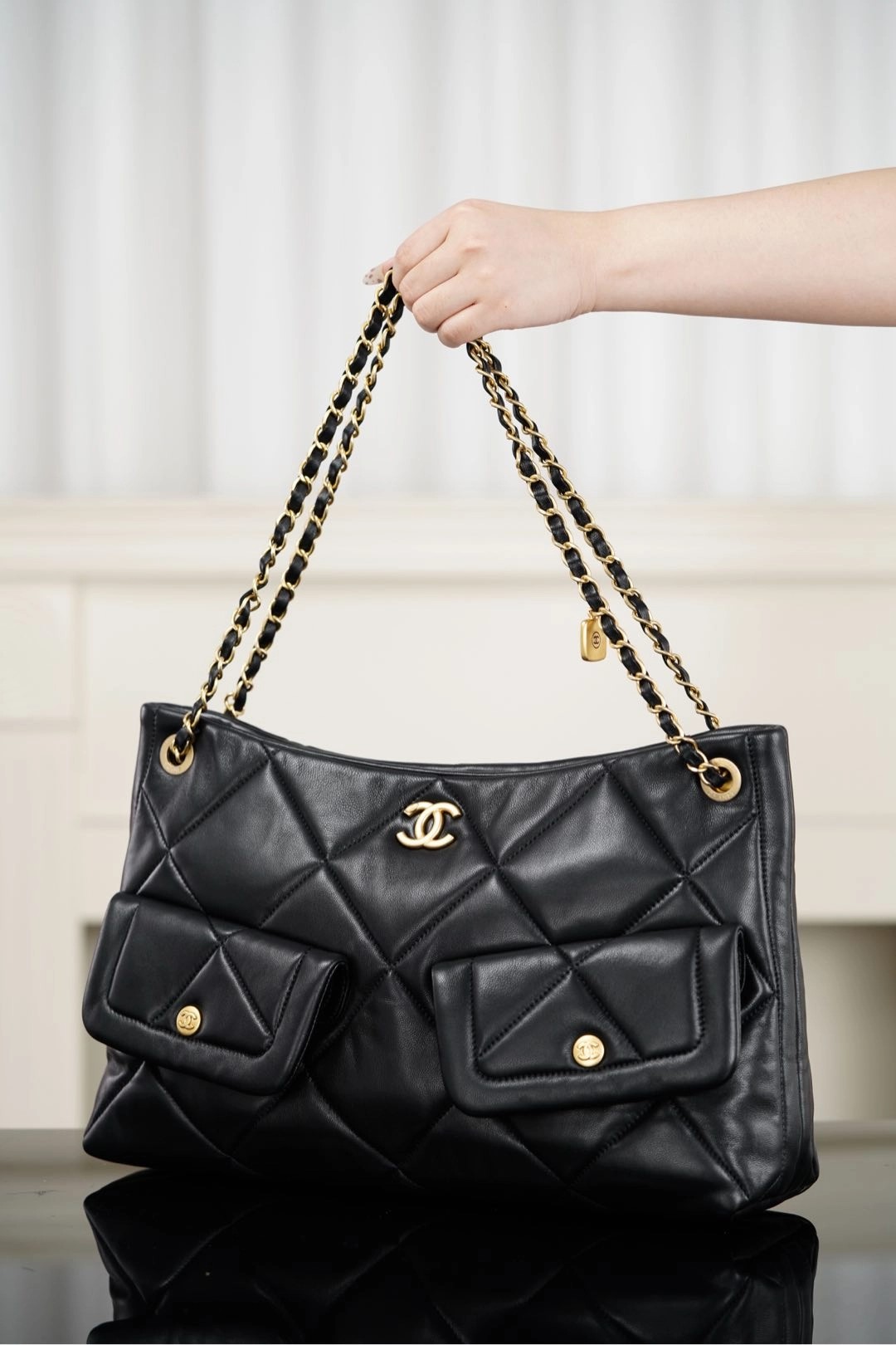𝐂𝐡𝐚𝐧𝐞𝐥 𝟐𝟓𝐤 𝐇𝐨𝐛𝐨购物袋👜 黑金羊皮🐑 秋冬必备大包🎊巧克力般丝滑的黑色山羊皮🐑 手感细腻绵软!经典菱格纹与双𝐂五金、链条上的小金牌更是吸睛🤩 复古腔调拉满的同时、又因为𝐇𝐨𝐛𝐨的随性慵懒,让这只包成为“颜值硬通货” 👜 把“优雅”跟“松弛”柔和的恰到好处~  包型软乎乎、随手一挎就很有范😎  前后都有口袋夹层、收纳的一把好手👏🏻  你绝对会为这只包包的所有细节心动!!   尺寸:𝟑𝟖𝐱𝟐𝟔𝐱𝟏𝟏𝐜𝐦   🔍:25610861