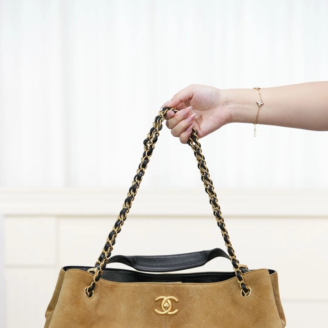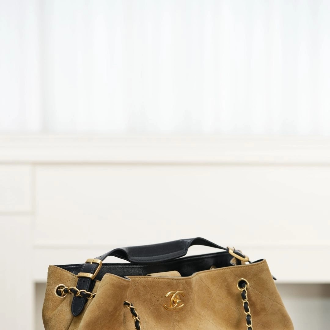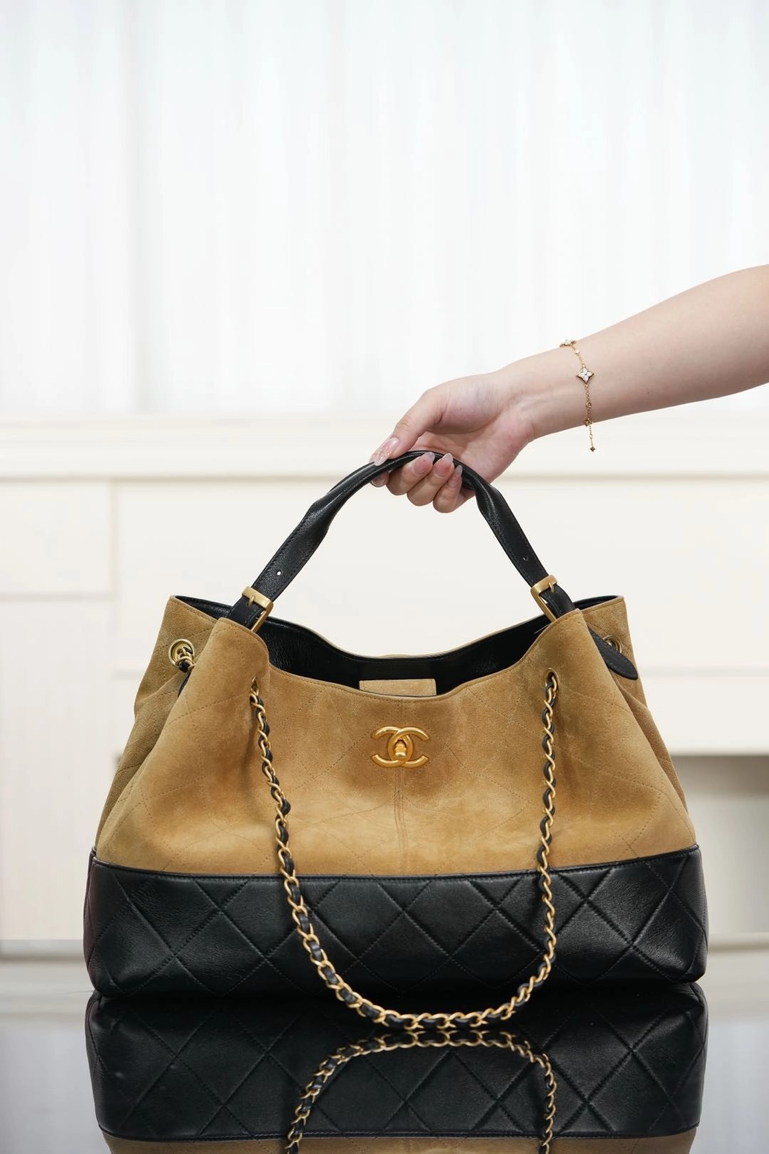 𝐂𝐡𝐚𝐧𝐞𝐥 𝟐𝟓𝐀 高级手工坊 麂皮购物袋 大号🏖️     𝟐𝟓𝐀手工坊杭州大秀的焦点爆款🔥经典与创新交织的杰作👏🏻 灵感来自香奈儿女士的乌木漆面屏风;标志性菱格纹 、邂逅独特拼色的设计 材质的碰撞💥 尽显奢华;  包身很大自重意外的很轻!横版小个子背都毫无压力✔️ 可手提可单肩!通勤也很实用✨ 一包背出多种风格🤩 松弛感真的拉满了~   尺寸:𝟒𝟎𝐱𝟐𝟖𝐱𝟏𝟓𝐜𝐦   🔍:25470581
