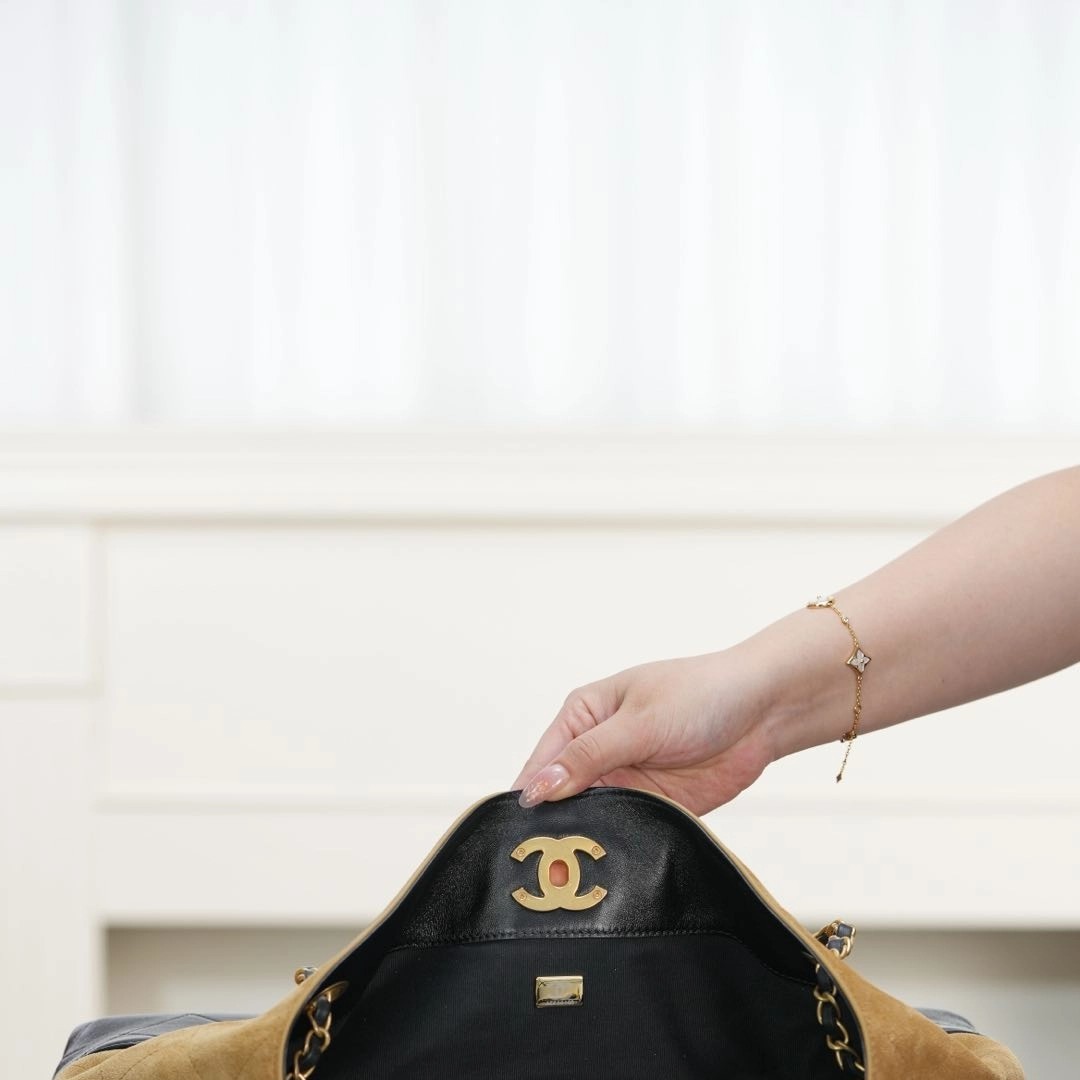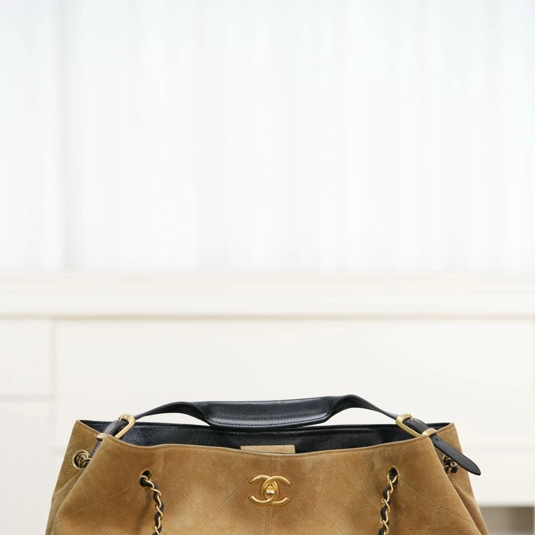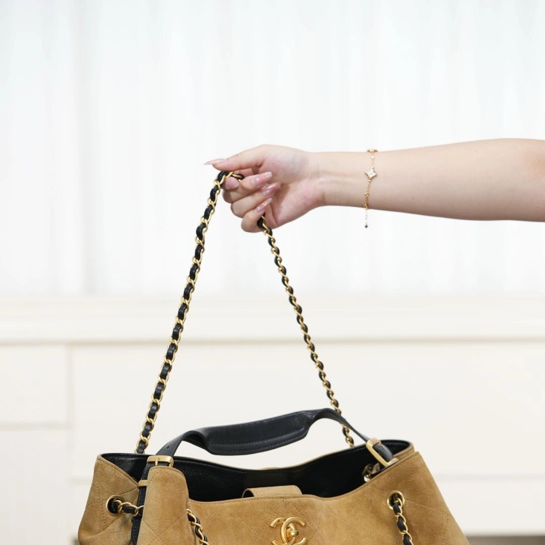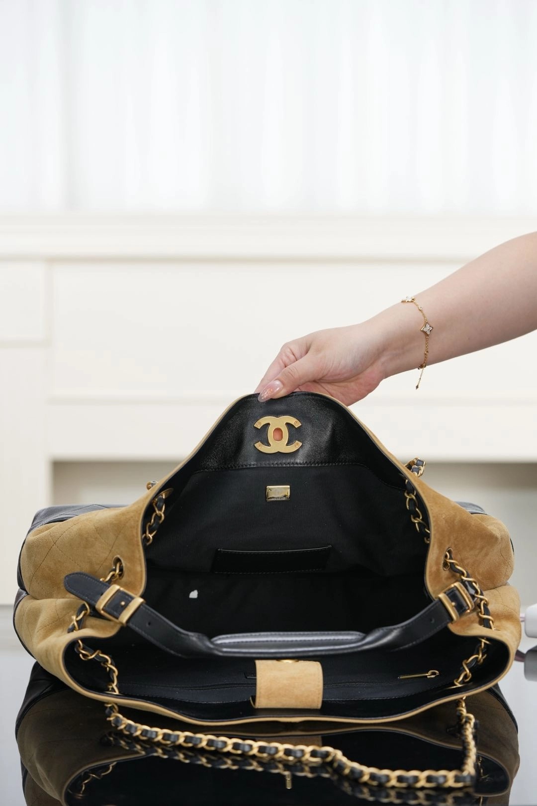 𝐂𝐡𝐚𝐧𝐞𝐥 𝟐𝟓𝐀 高级手工坊 麂皮购物袋 大号🏖️     𝟐𝟓𝐀手工坊杭州大秀的焦点爆款🔥经典与创新交织的杰作👏🏻 灵感来自香奈儿女士的乌木漆面屏风;标志性菱格纹 、邂逅独特拼色的设计 材质的碰撞💥 尽显奢华;  包身很大自重意外的很轻!横版小个子背都毫无压力✔️ 可手提可单肩!通勤也很实用✨ 一包背出多种风格🤩 松弛感真的拉满了~   尺寸:𝟒𝟎𝐱𝟐𝟖𝐱𝟏𝟓𝐜𝐦   🔍:25470581