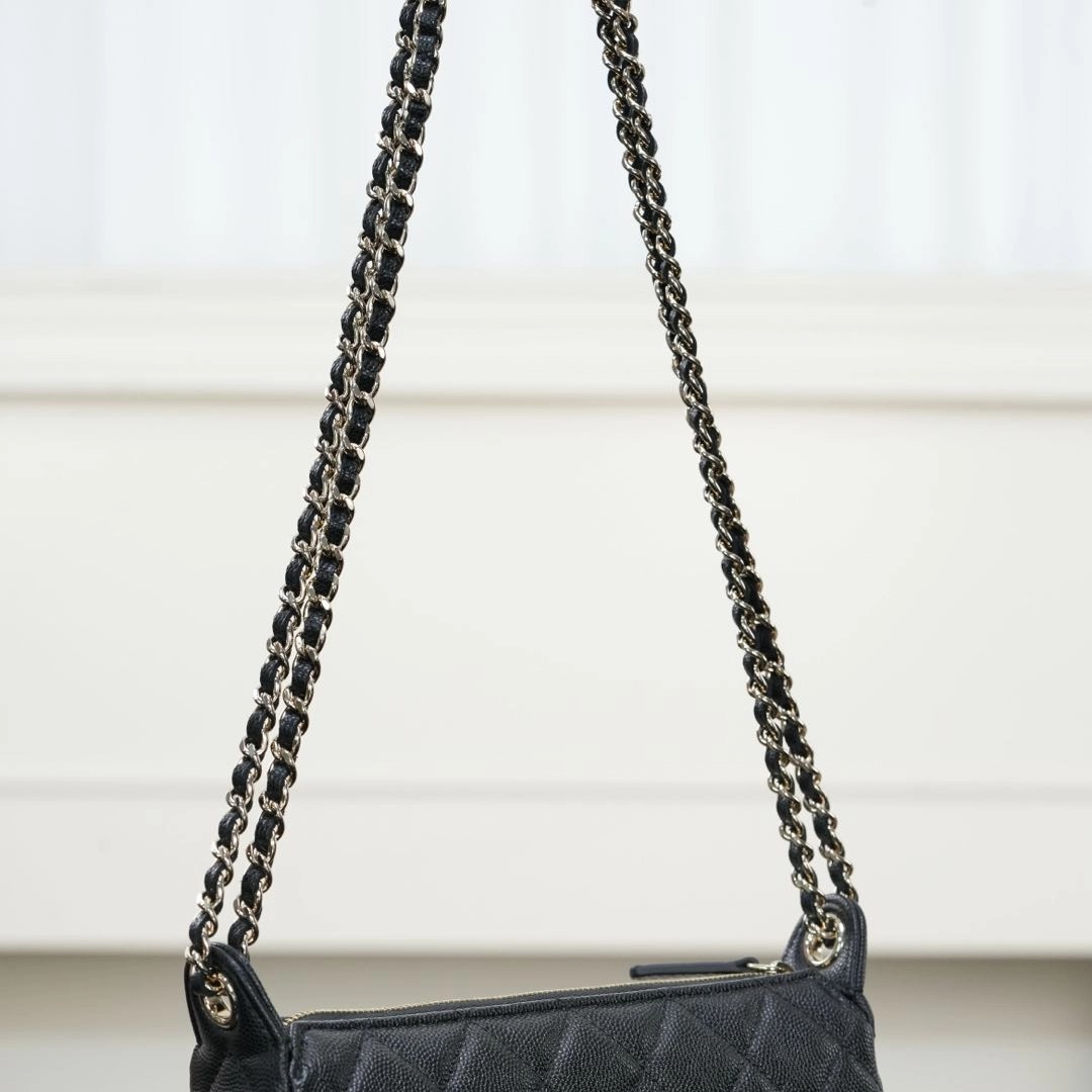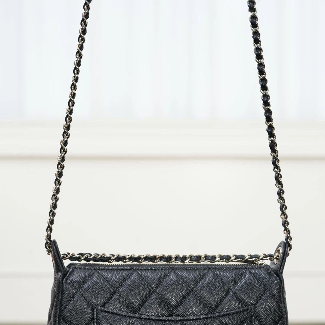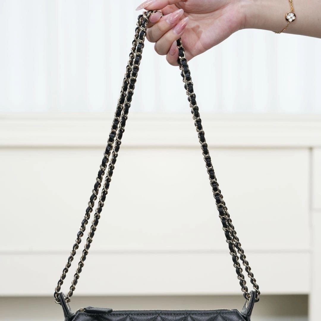 𝐂𝐡𝐚𝐧𝐞𝐥 𝟐𝟓𝐀隐藏款 麻将包 黑金 ✨ 又是一只隐藏款小皮具👏🏻性价比太高了!比𝐰𝐨𝐜能装、上身好看精致🤩 荔枝牛皮的加持、简直是今年的神仙款!耐用又美丽! 链条⛓️随意调节,单肩、斜跨、手拎、腋下均🉑!多种背法赚翻了好吗!! 自重非常轻、可以放得下𝐩𝐫𝐨𝐦𝐚𝐱手机📱 这么实用百搭的包包谁能不心动💓   尺寸:12x5.5x21cm  🔍:25330801