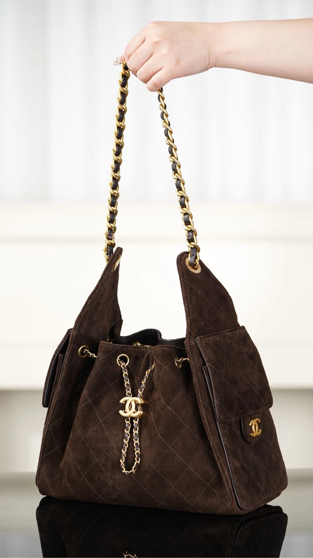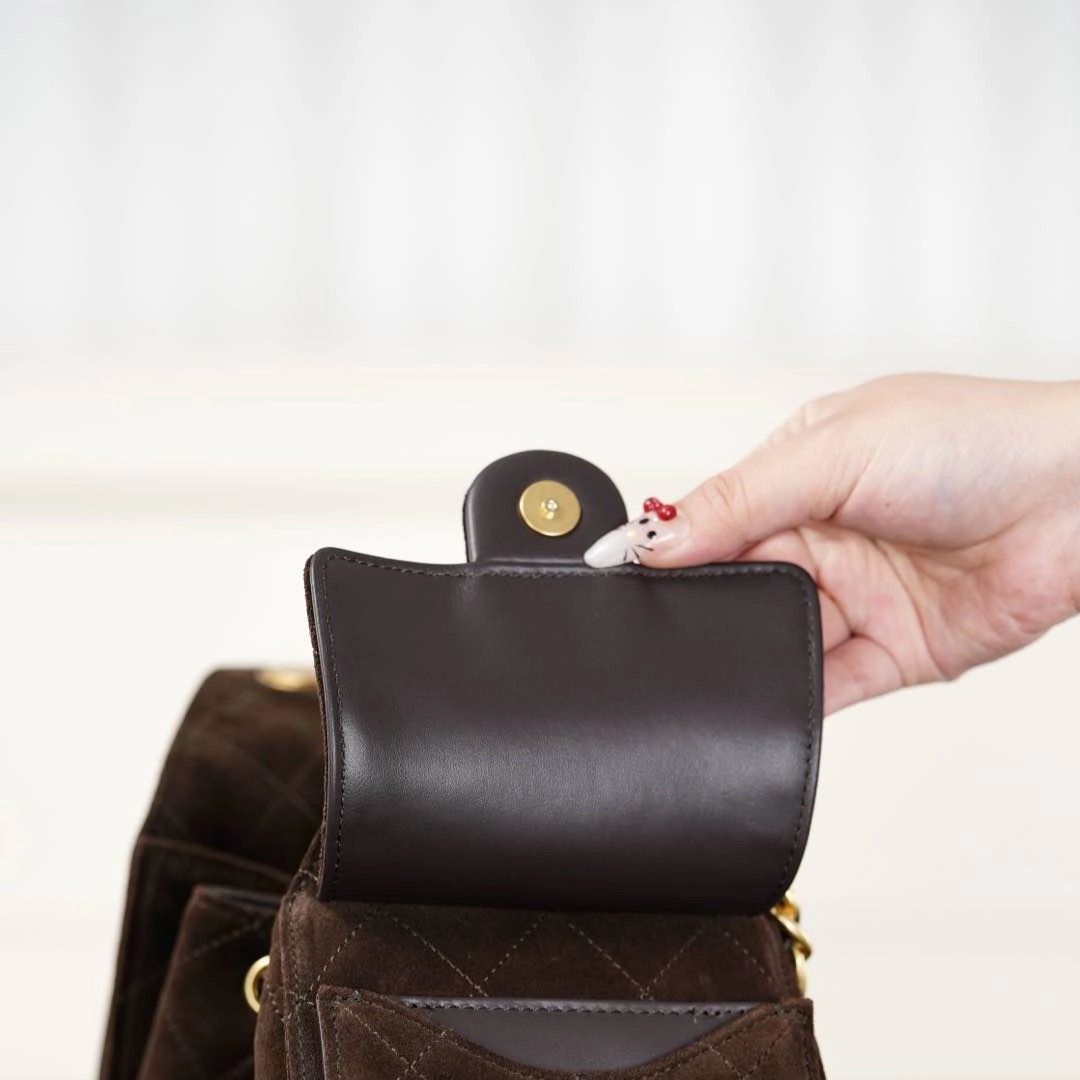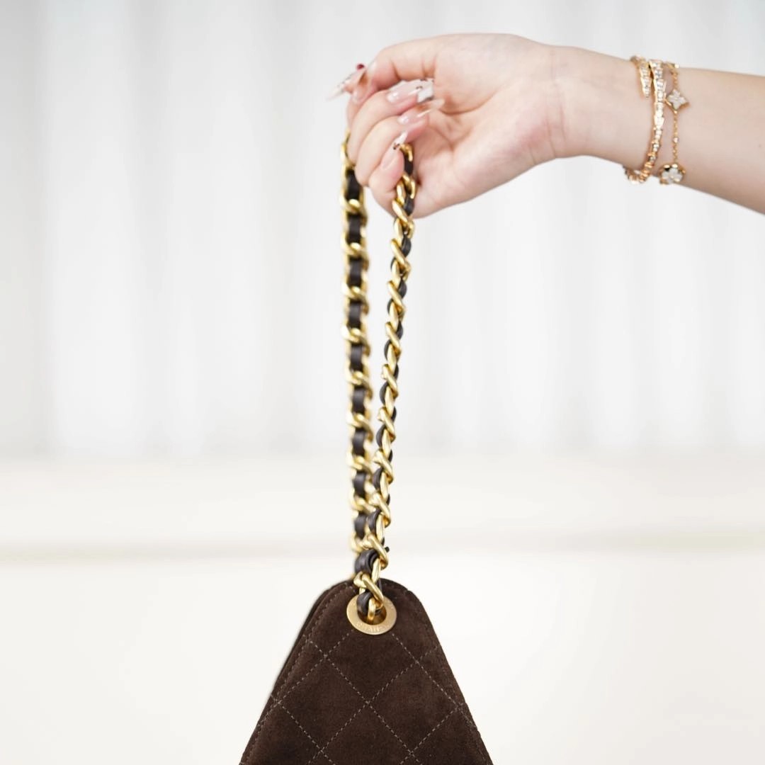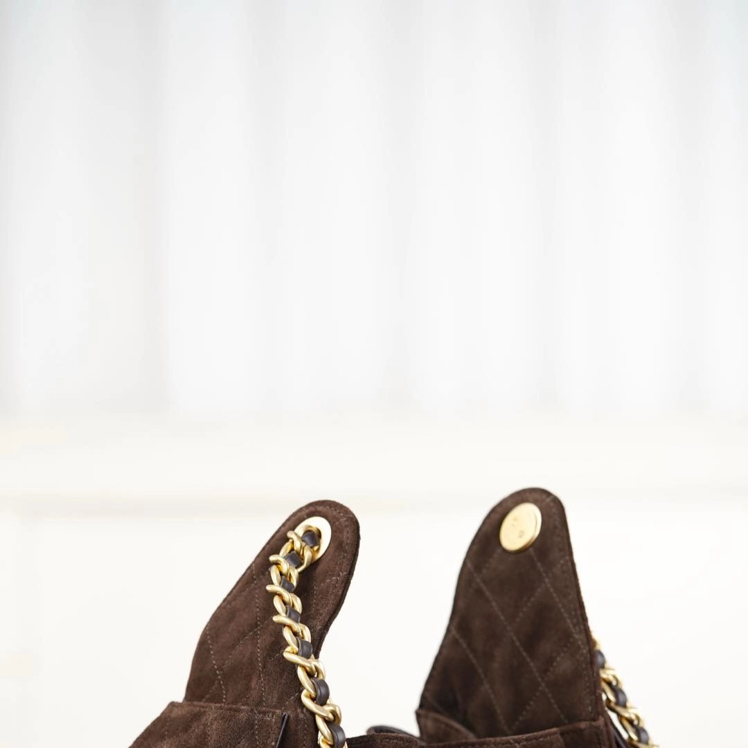 𝐂𝐡𝐚𝐧𝐞𝐥 𝟐𝟓𝐤  棕色麂皮𝐡𝐨𝐛𝐨 抽绳水桶包 小号🌟   秋冬黑马🐎𝟐𝟓 𝐛𝐚𝐠麂皮款再次回归🥳  麂皮绒质感真的很高级🖤 面料与生俱来的柔软、细腻🤩 如巧克力般丝滑浓郁~ 配上金贵的双𝐂金属扣 可抽拉调节⛓️‍💥 风格随性慵懒却不失优雅🥂   视觉上质感满满✨ 比起皮质更出彩~ 侧面的口袋 很美拉德很秋冬☃️ 慵懒随性的调调 简直一眼心动🥹    尺寸:𝟑𝟎𝐱𝟐𝟔𝐱𝟏𝟒𝐜𝐦  🔍:24650861