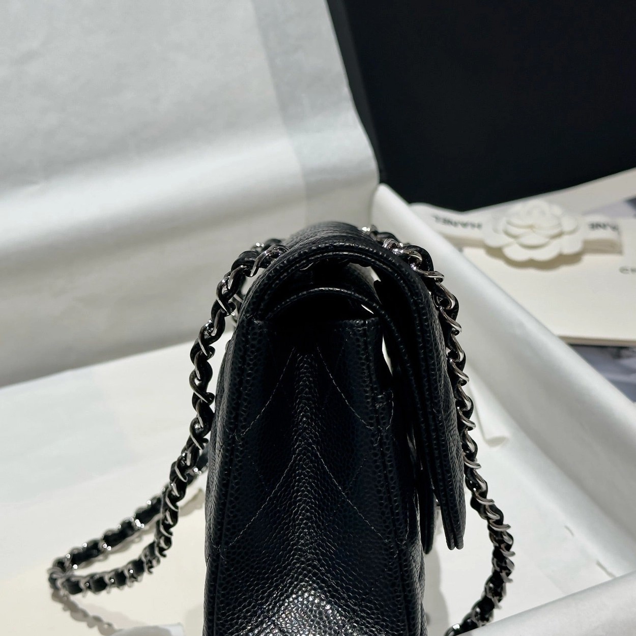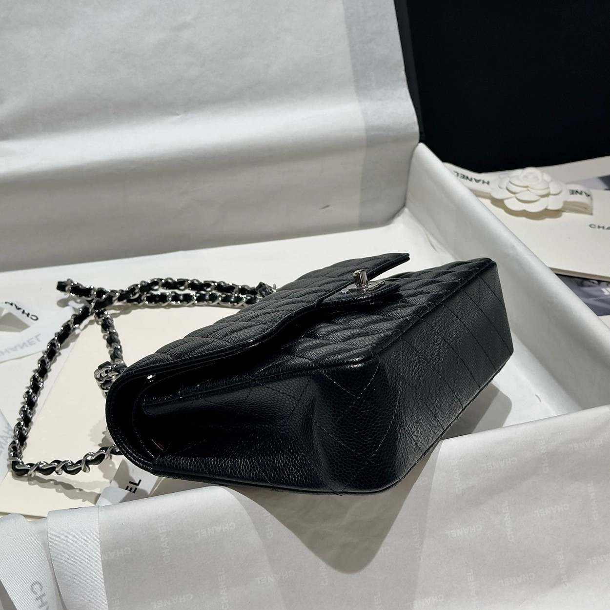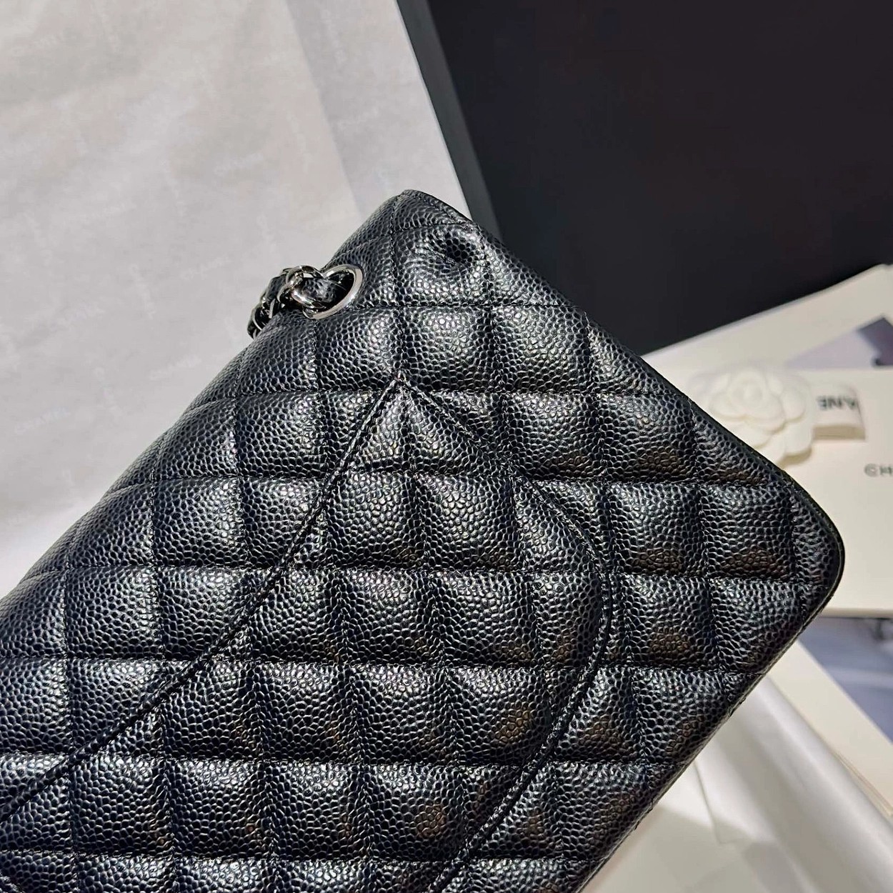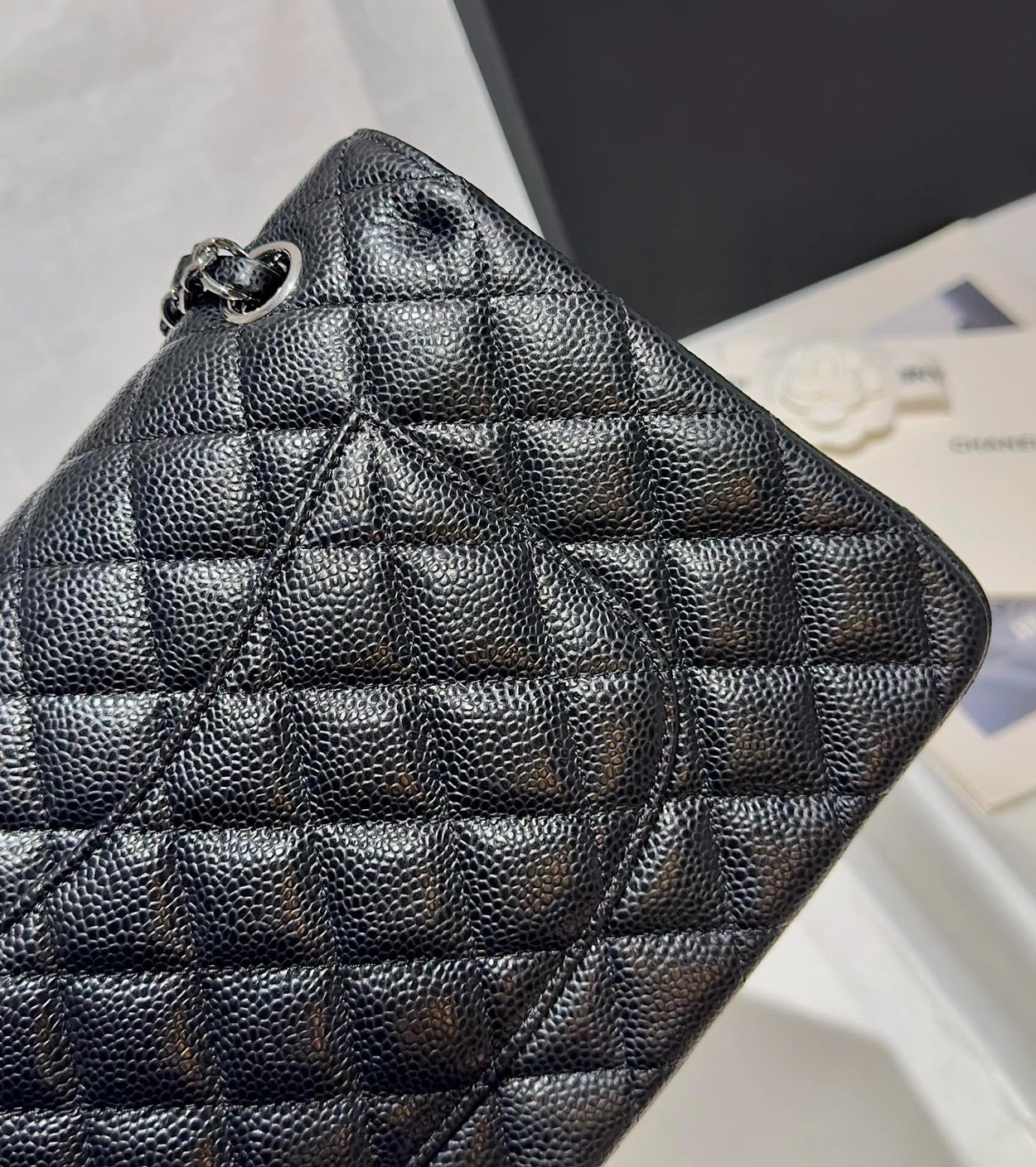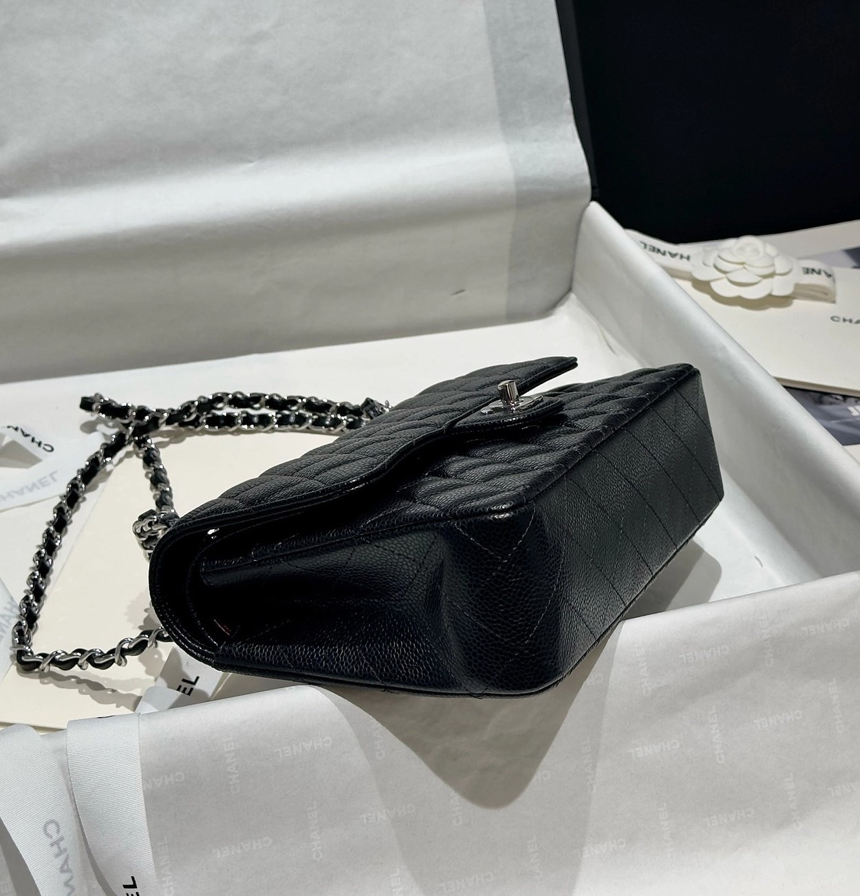 샤넬 클래식 플랩백 캐비어 정품가죽 아웃스티치 미듐 25