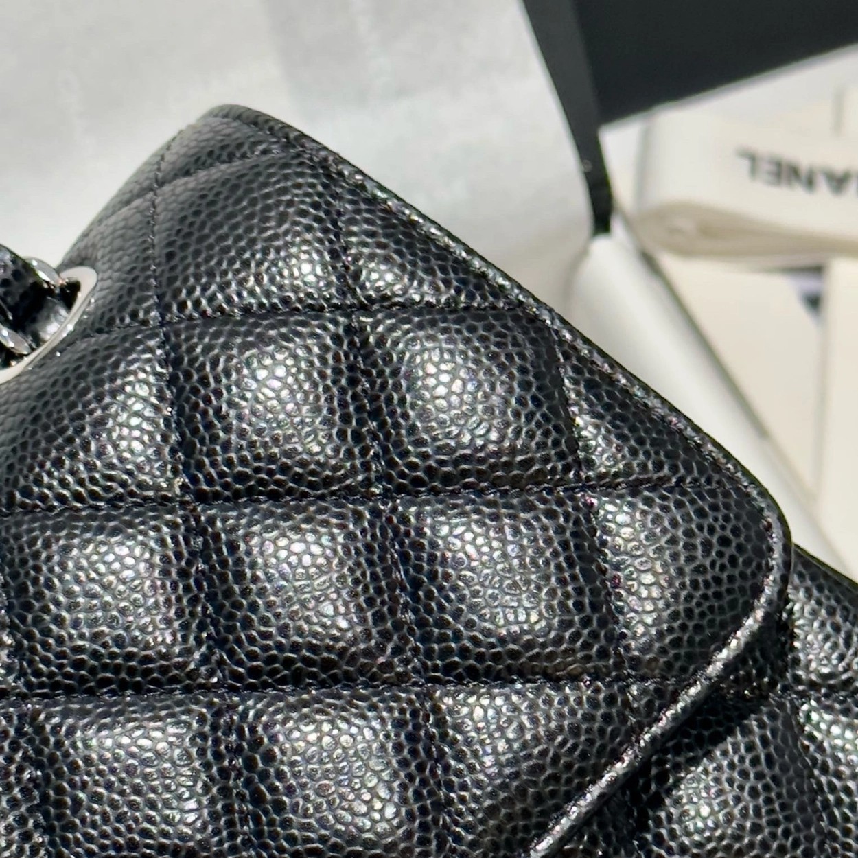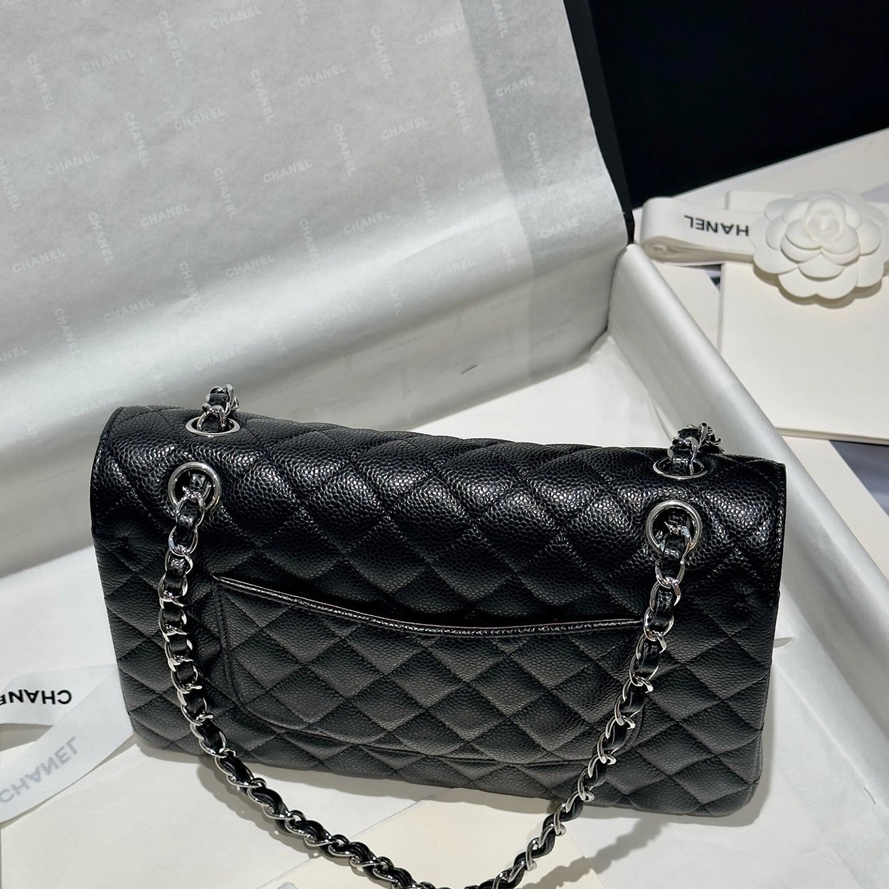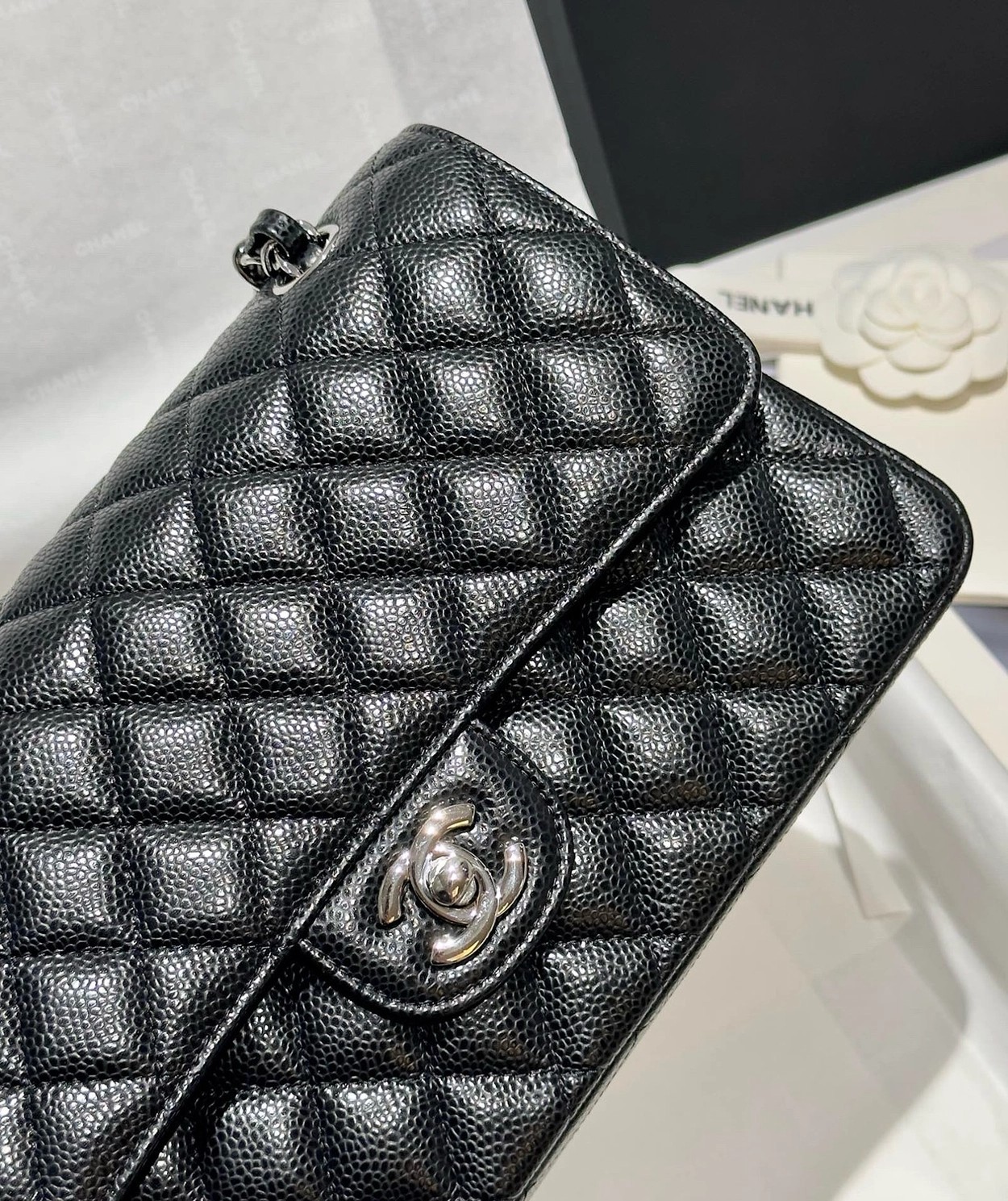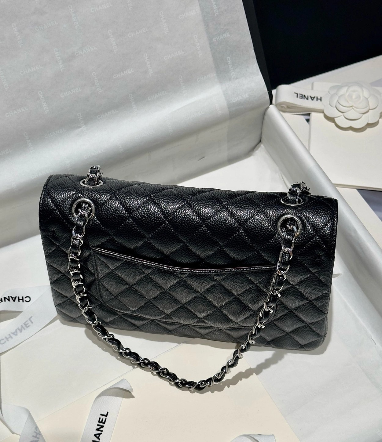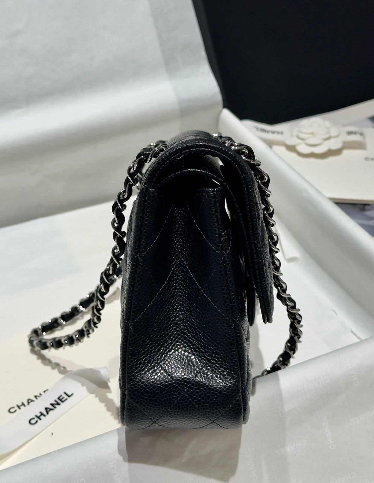 샤넬 클래식 플랩백 캐비어 정품가죽 아웃스티치 미듐 25