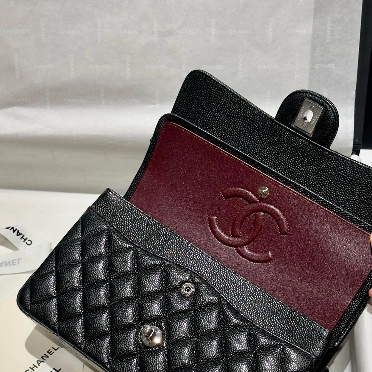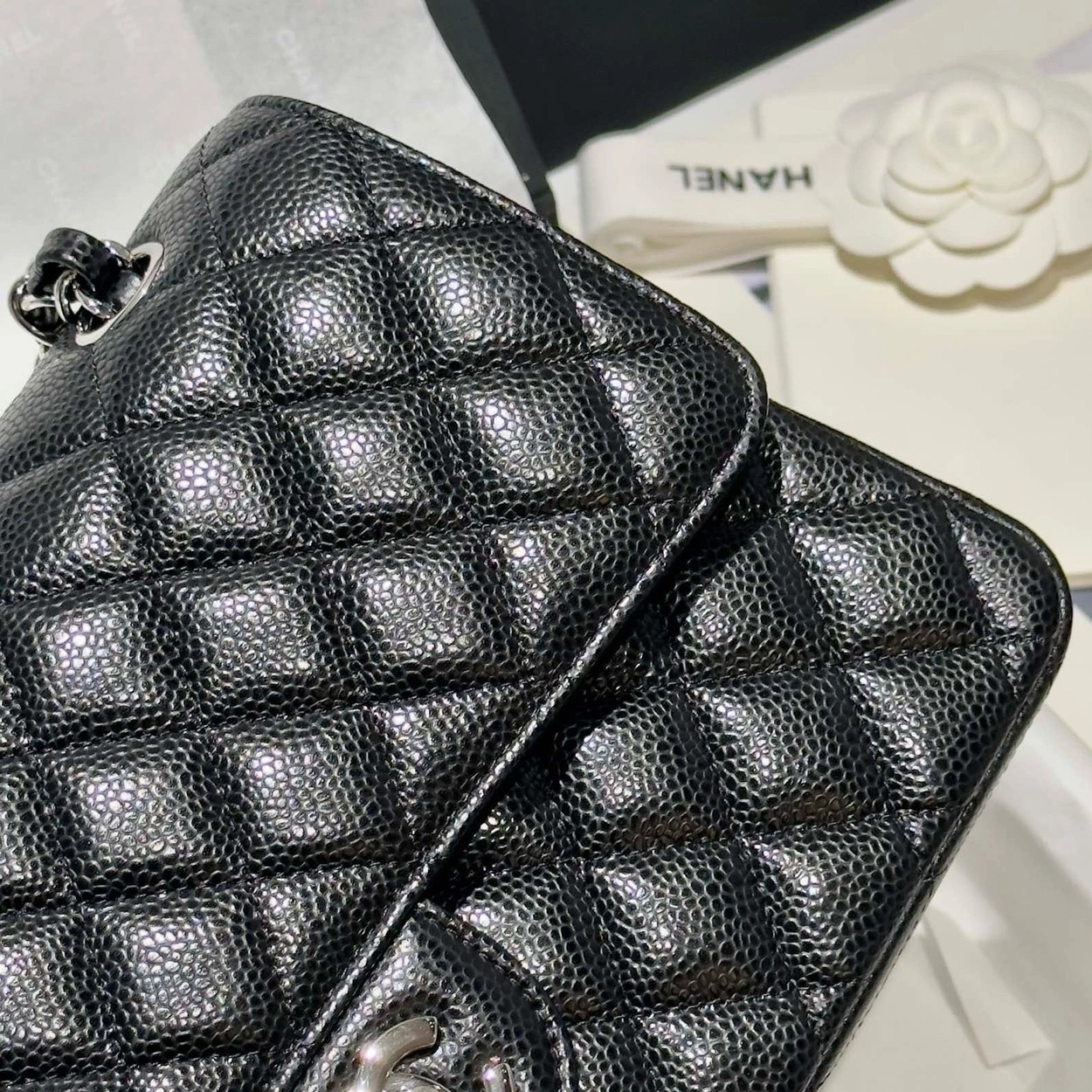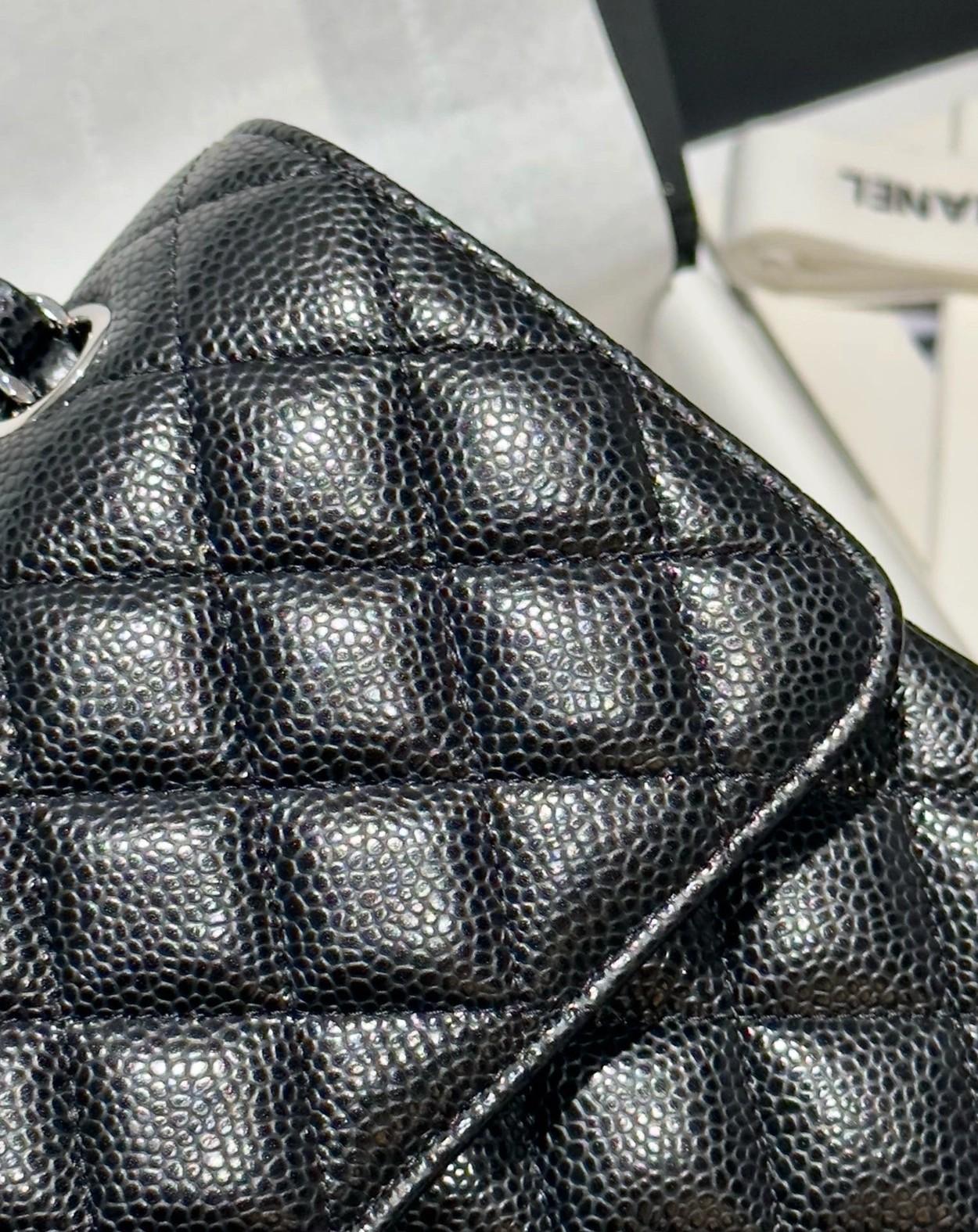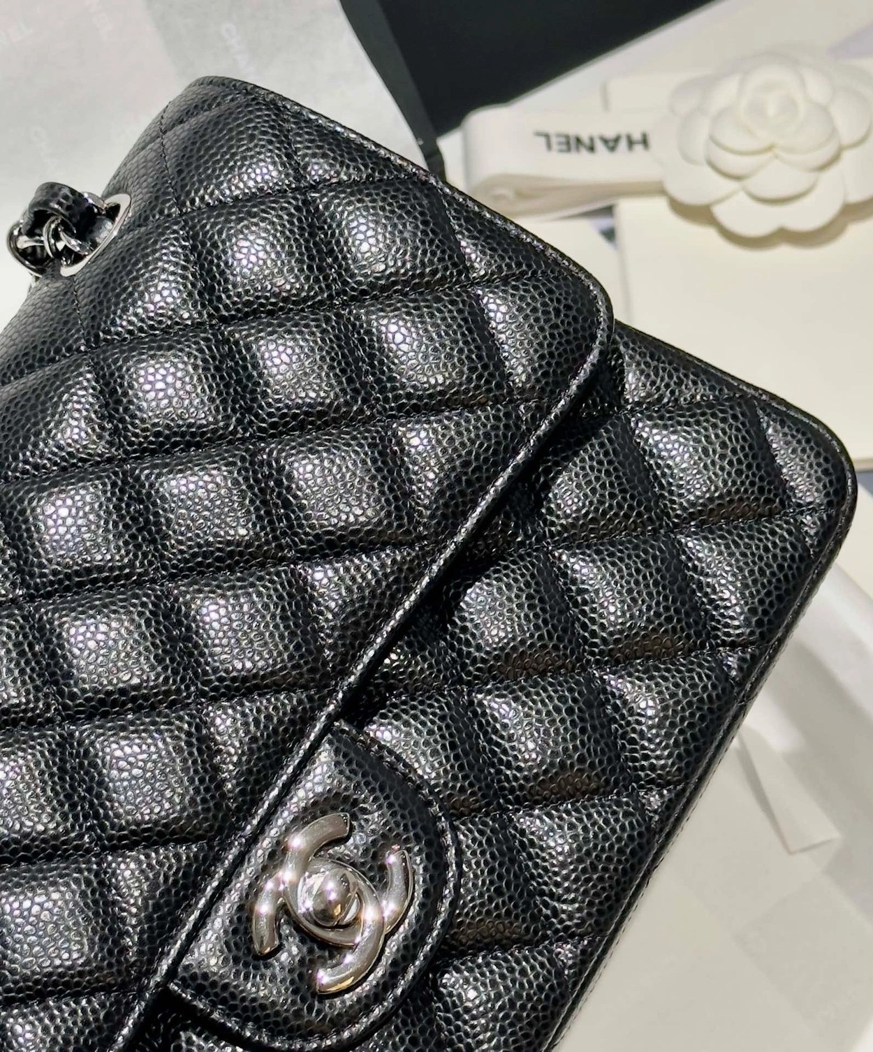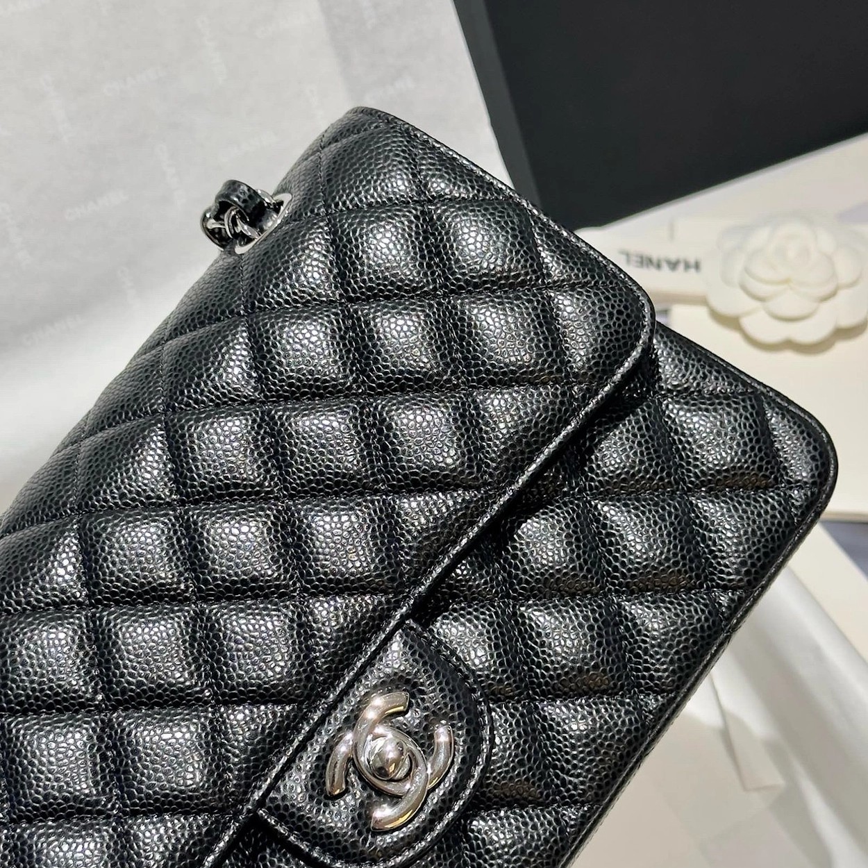 샤넬 클래식 플랩백 캐비어 정품가죽 아웃스티치 미듐 25