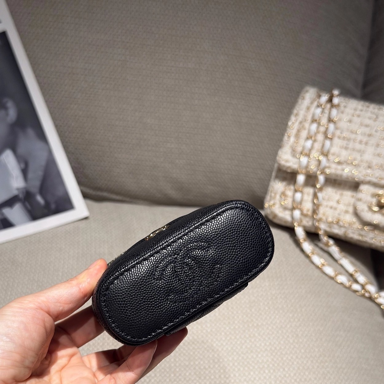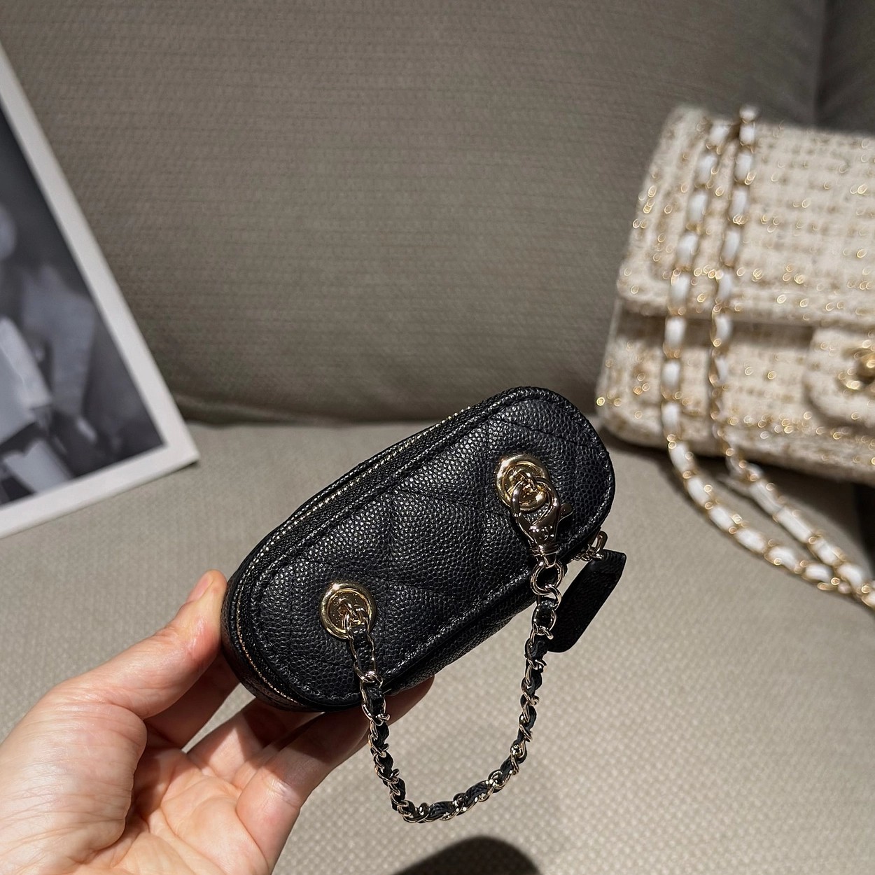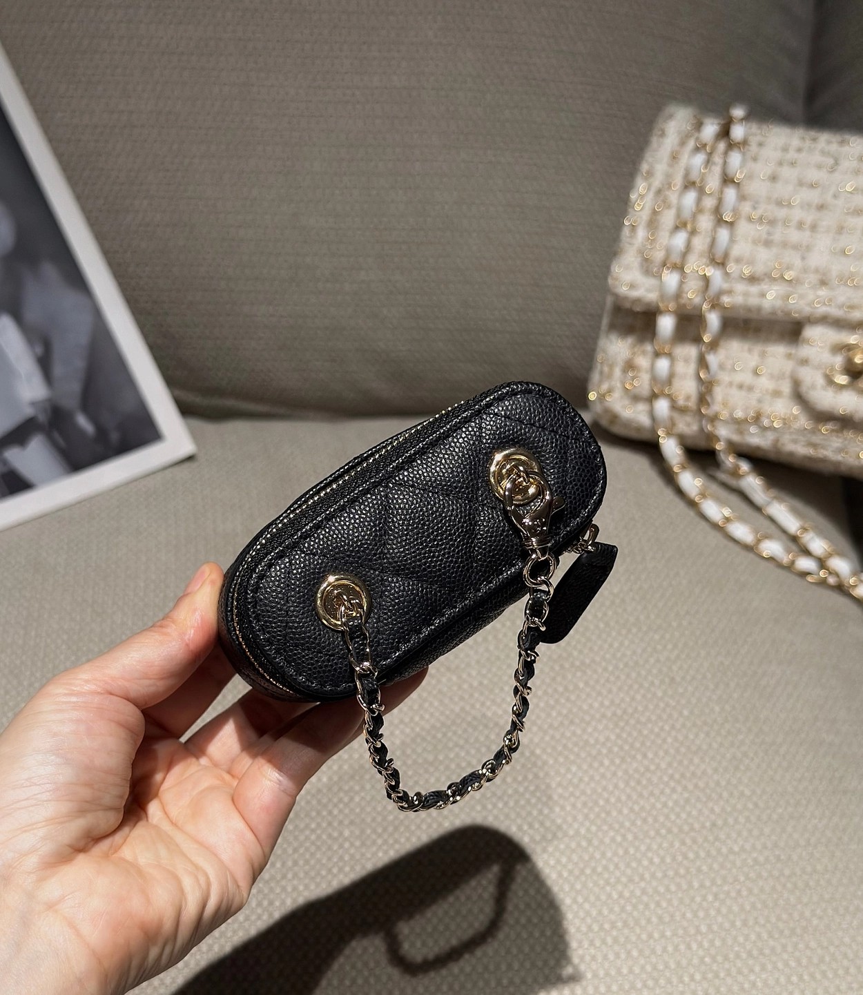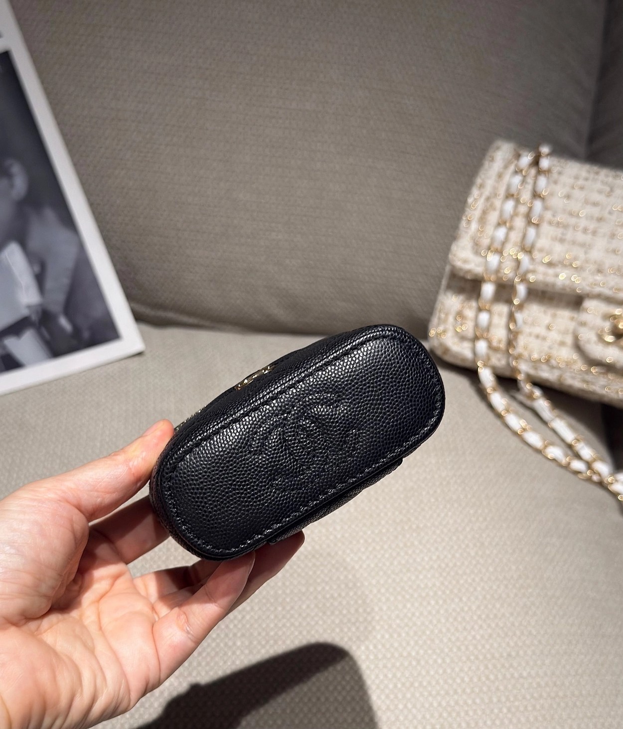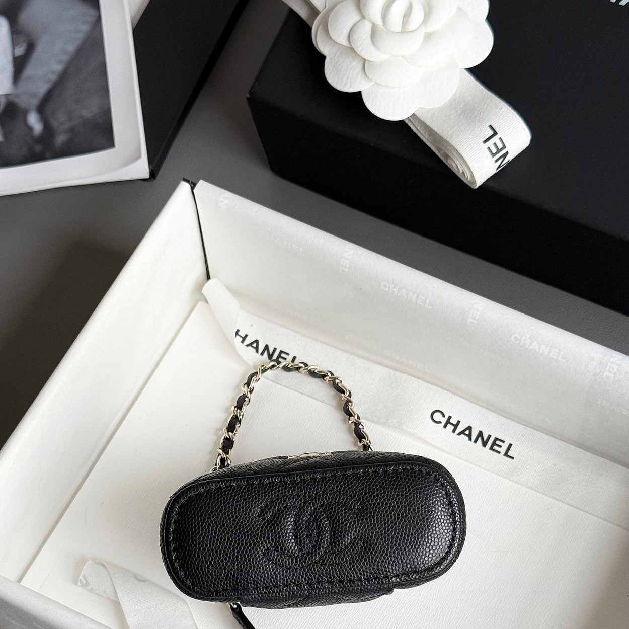 原厂Haas鱼子酱牛皮搭配24K厚钯水润香槟扣,内里可以放些小物件比如车钥匙之类!缩小版的盒子化妆包优雅又气质!小小的实在太可爱了!挂在大包上当个装饰时尚又百搭、挂在裤腰上也非常Nice……