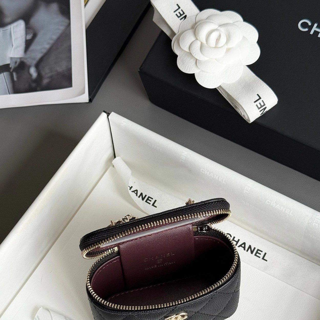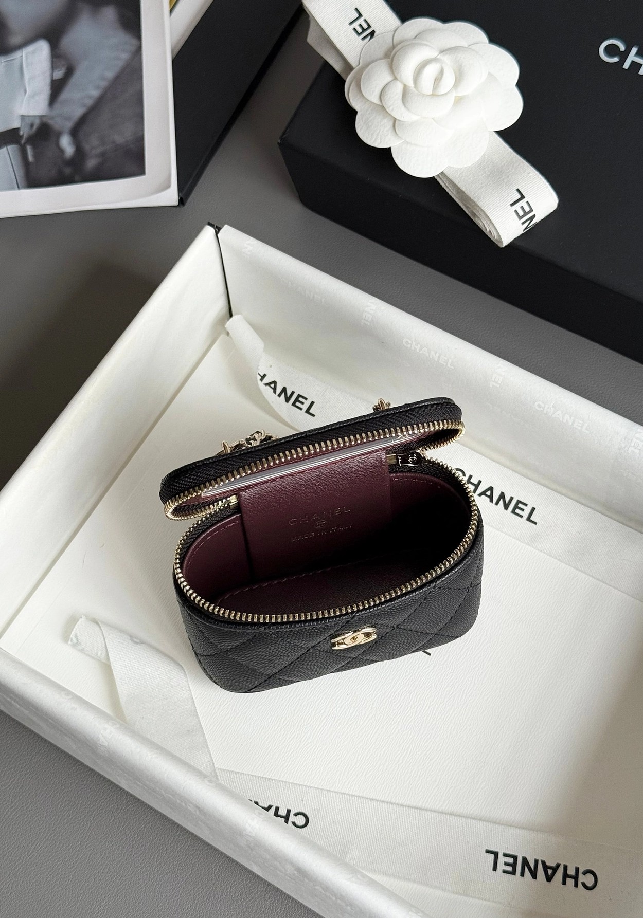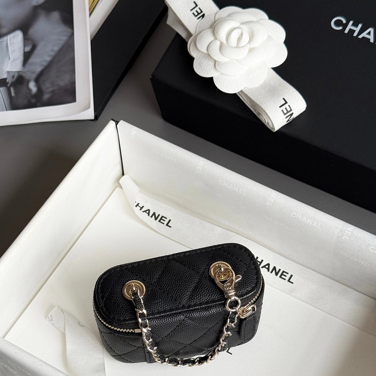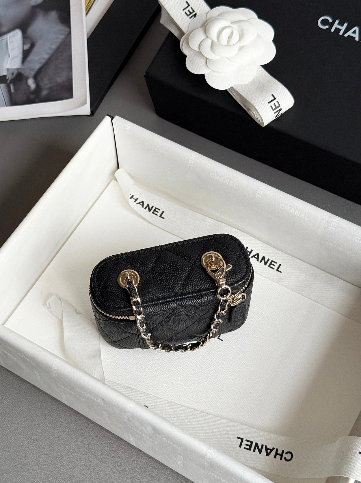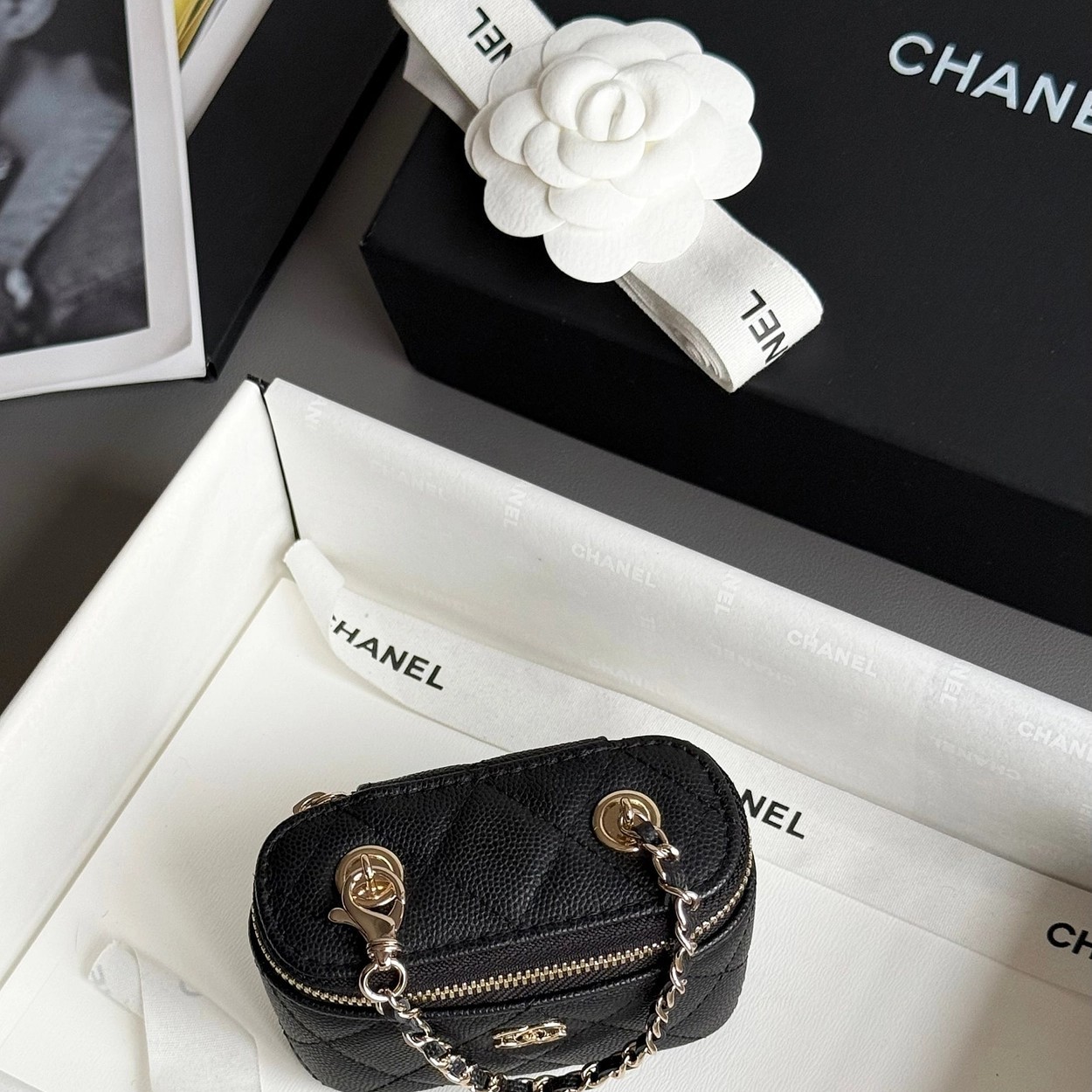 原厂Haas鱼子酱牛皮搭配24K厚钯水润香槟扣,内里可以放些小物件比如车钥匙之类!缩小版的盒子化妆包优雅又气质!小小的实在太可爱了!挂在大包上当个装饰时尚又百搭、挂在裤腰上也非常Nice……