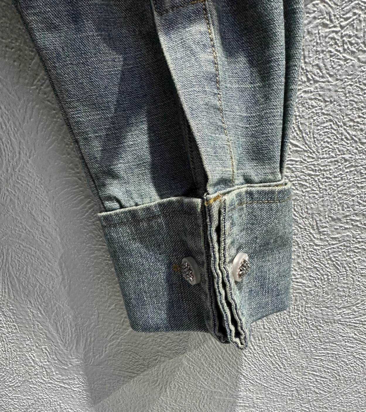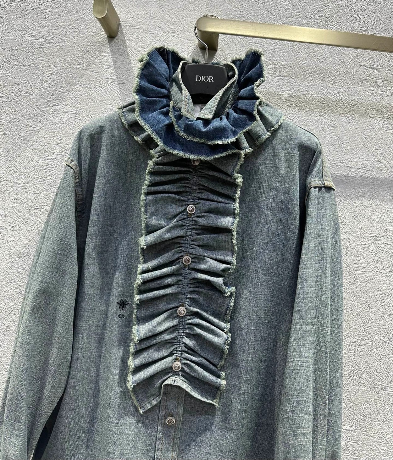 强烈推荐❤️dio* 26早春新品。木耳边宫廷风牛仔衬衫。定制反。立领H版型剪裁 自带清冷松弛感 小蜜蜂刺绣 可拆卸木耳边飘带 增添造型的两穿款 可盐可甜 一色SML(S码:胸围114 袖长53 衣长71)50370320