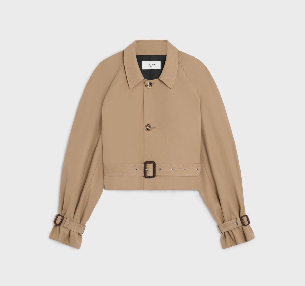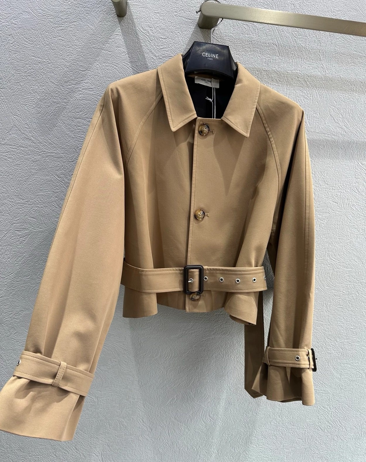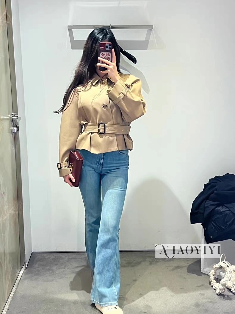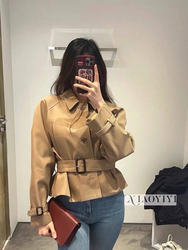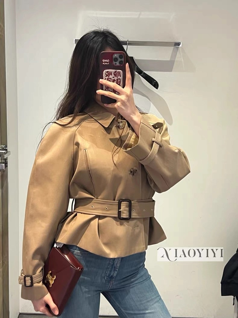 强烈推荐❤️CEL* 26早春新品。短款风衣外套,经典卡其色,轻薄面料超适合早秋穿搭!收腰+腰带设计,修饰身形又显利落,袖口绑带细节超有层次感💫。复古风融合现代剪裁,通勤、休闲都能轻松驾驭,搭配高腰裤或裙装,比例立马拉满!CELINE一贯的高级质感和设计感,时髦精必入!一色SML(S码:胸围112 衣长49 落肩宽袖长) 99340290