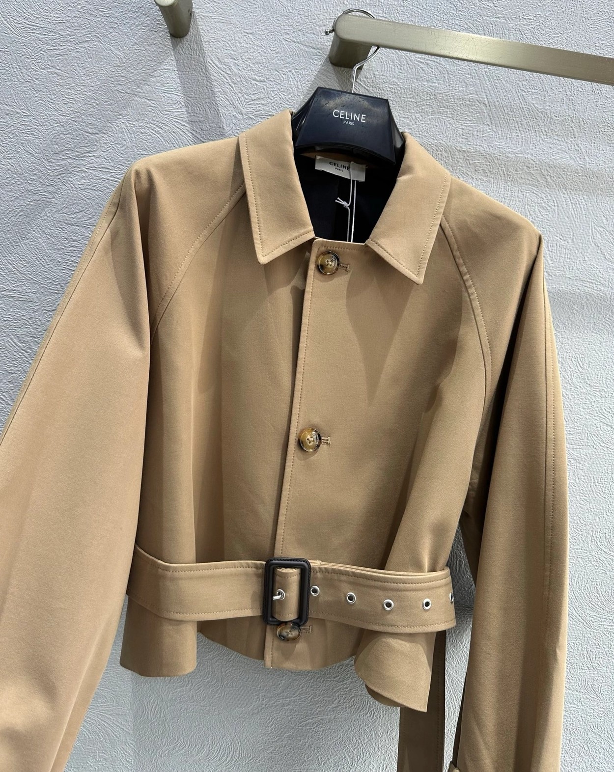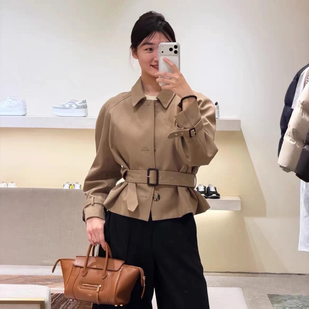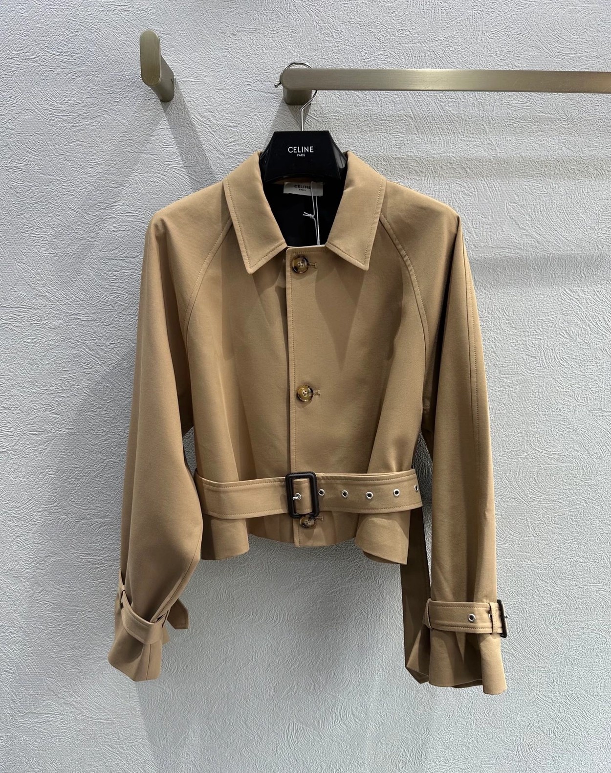 强烈推荐❤️CEL* 26早春新品。短款风衣外套,经典卡其色,轻薄面料超适合早秋穿搭!收腰+腰带设计,修饰身形又显利落,袖口绑带细节超有层次感💫。复古风融合现代剪裁,通勤、休闲都能轻松驾驭,搭配高腰裤或裙装,比例立马拉满!CELINE一贯的高级质感和设计感,时髦精必入!一色SML(S码:胸围112 衣长49 落肩宽袖长) 99340290
