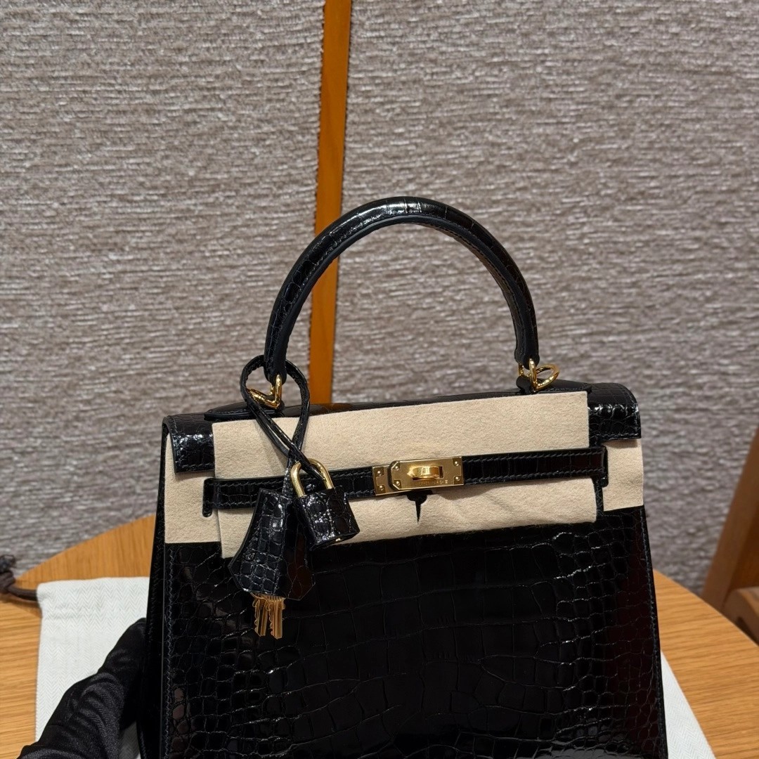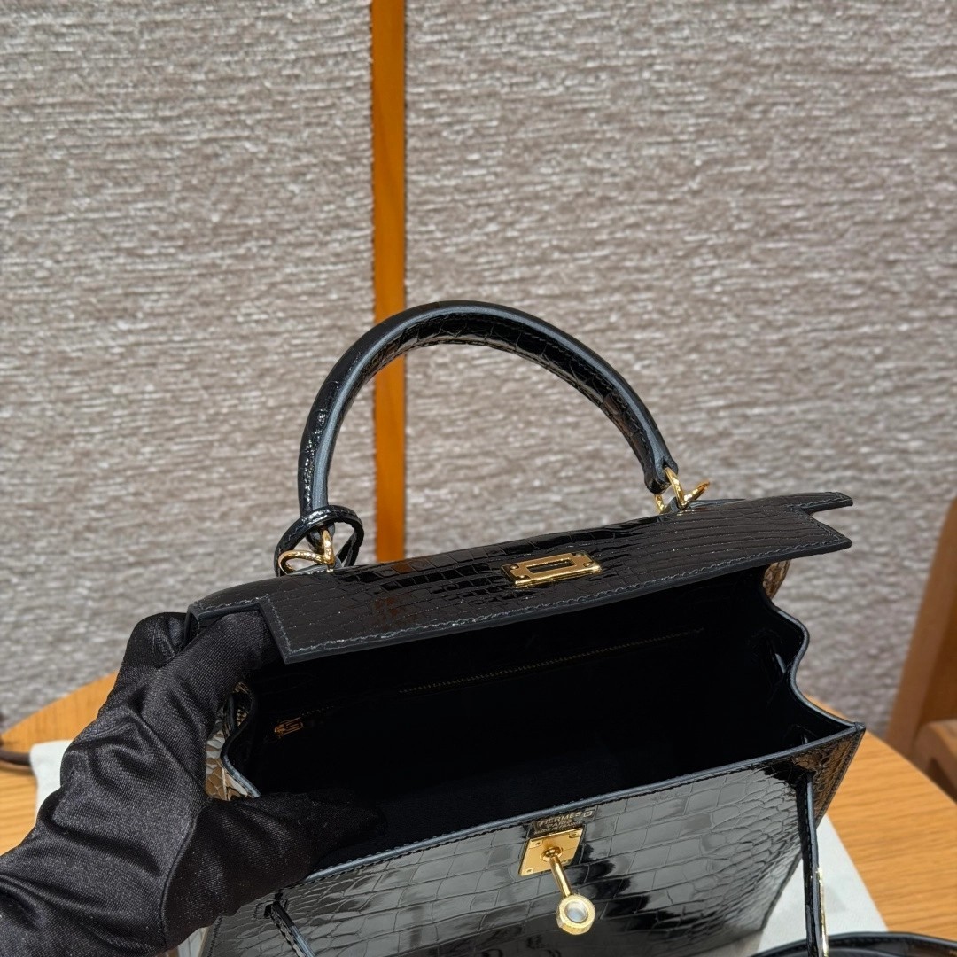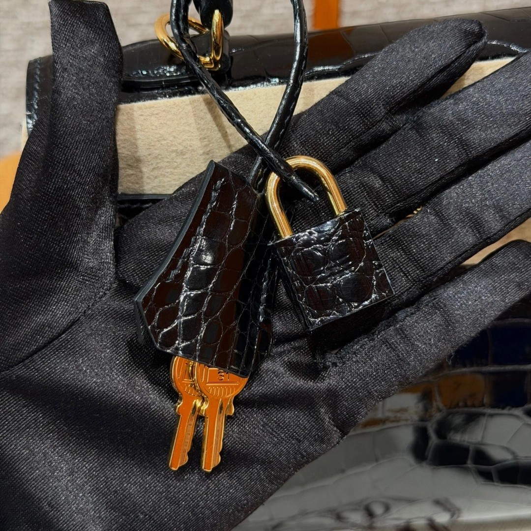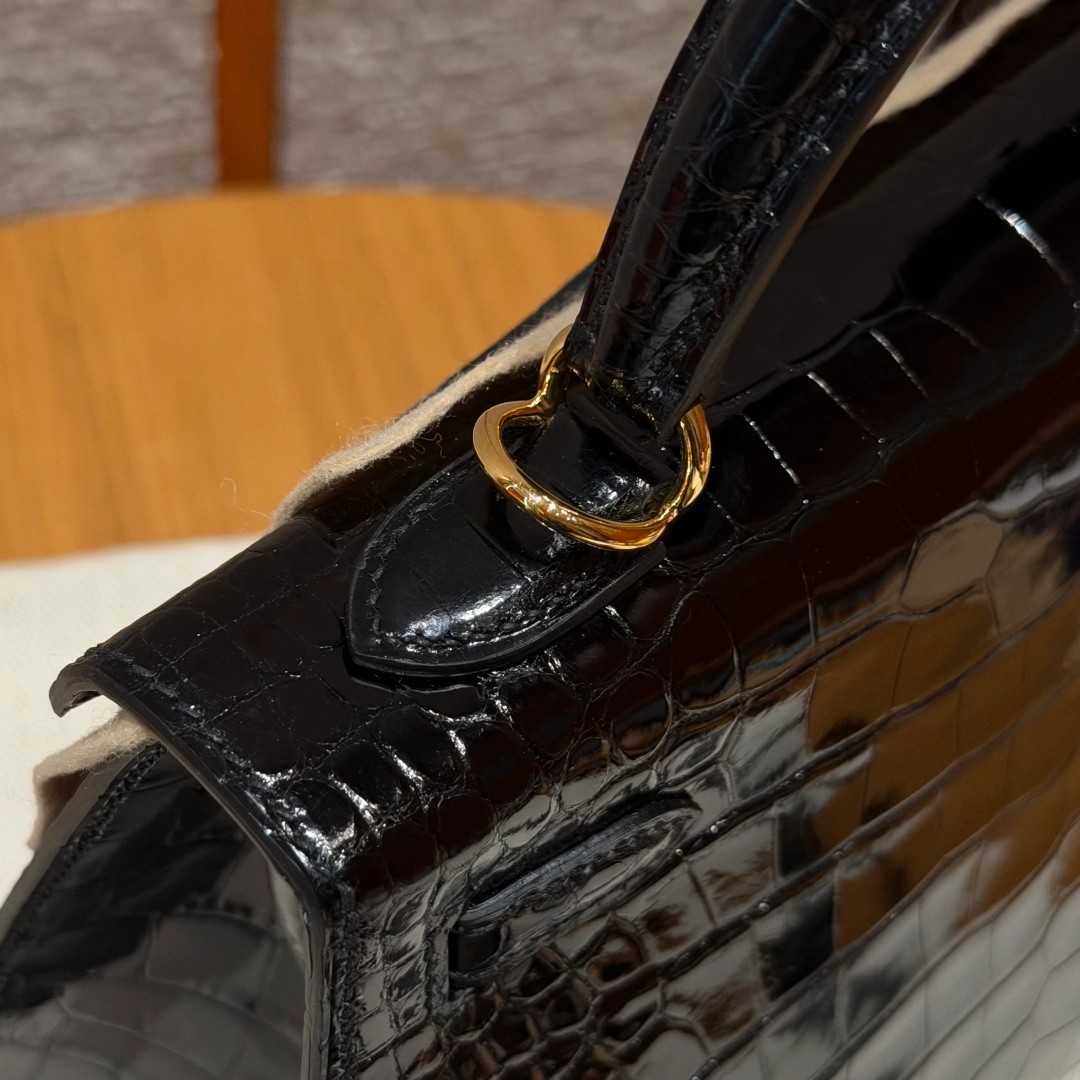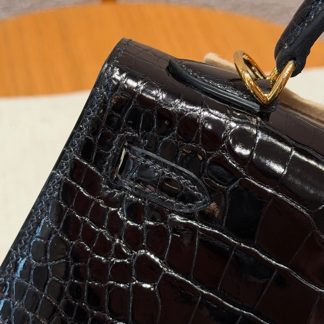 Style: Kelly Colour:89/Noir Size:25*20*13 Leather:Bright faced Alligator🐊 imported From France which originally from Mississippi. Hardware: Gold 铂金25cm,黑色,亮面美洲鳄🐊,法国进口原厂一级鳄鱼皮🐊,原产于密西西比州,金扣,高级全手工专属定制‼️ 纯手工手打钉,手刻五金,精钢电镀18k五金 客订实拍🐎🐎customer order🐎🐎