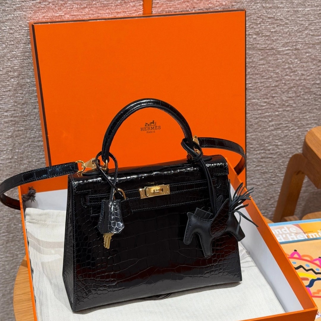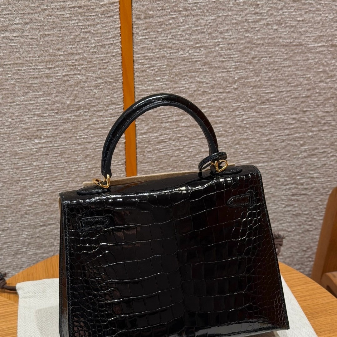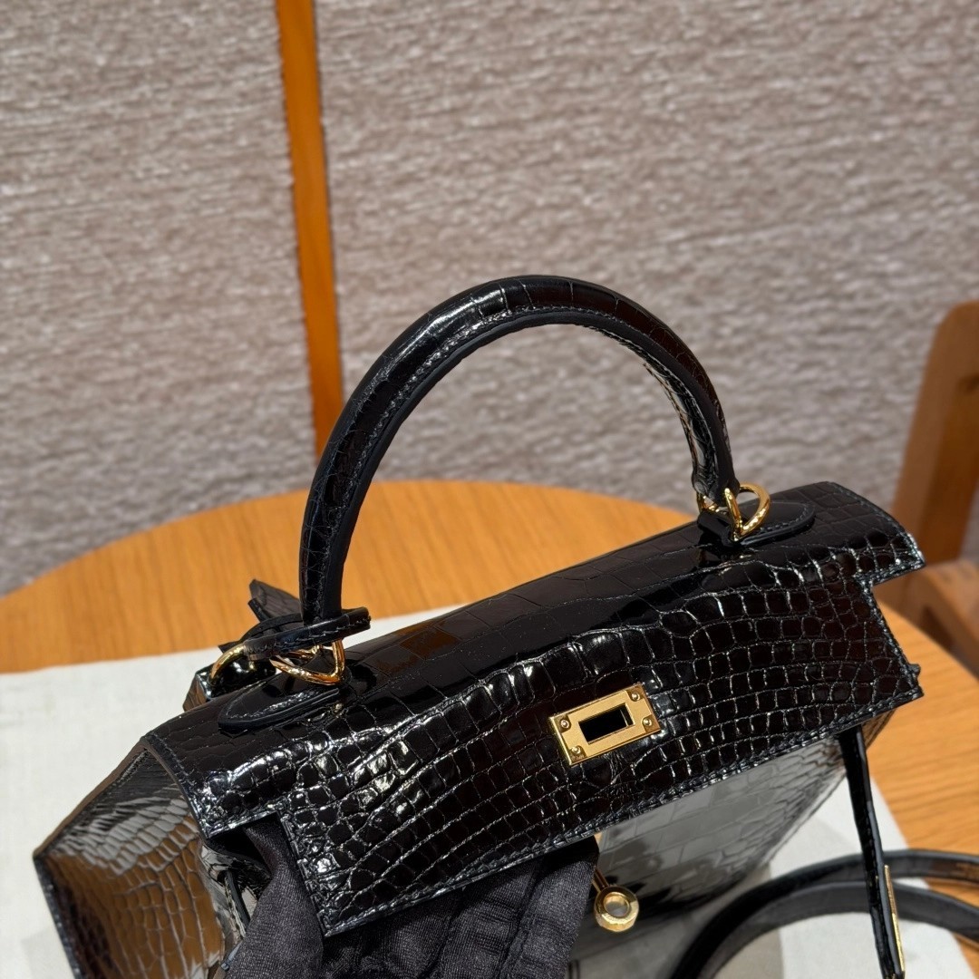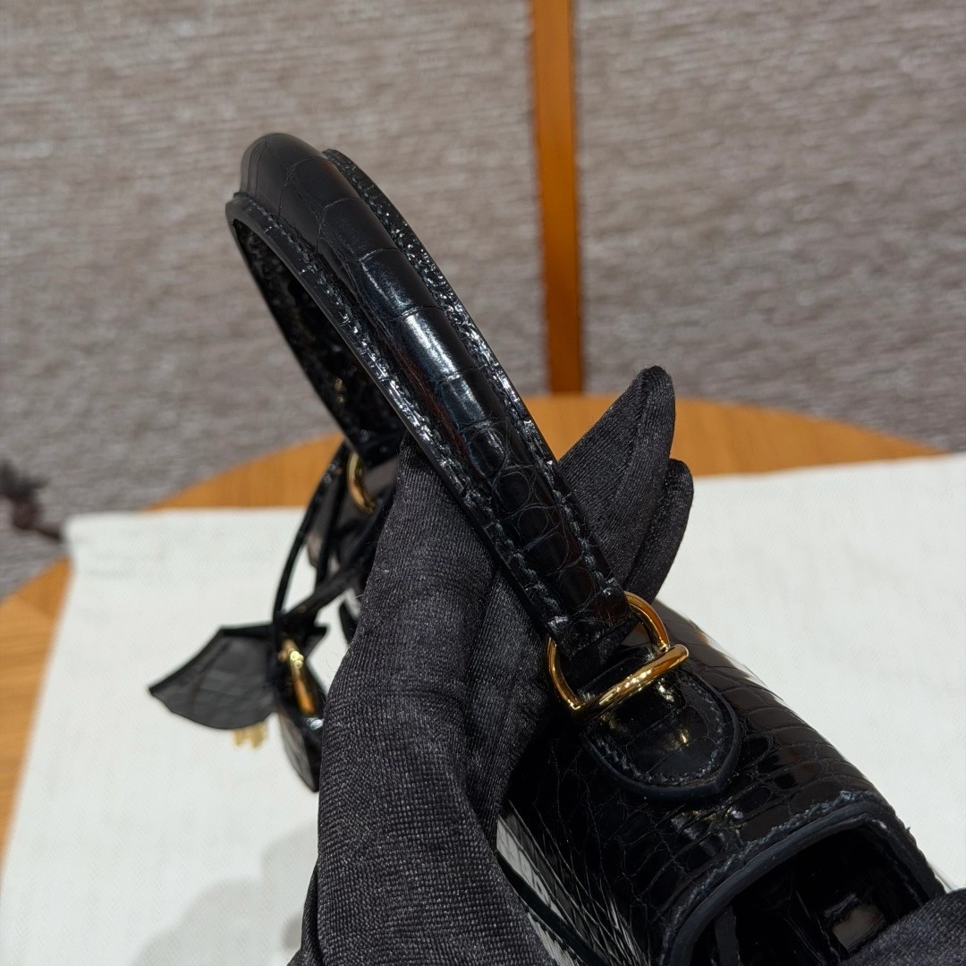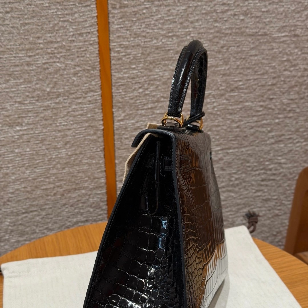 Style: Kelly Colour:89/Noir Size:25*20*13 Leather:Bright faced Alligator🐊 imported From France which originally from Mississippi. Hardware: Gold 铂金25cm,黑色,亮面美洲鳄🐊,法国进口原厂一级鳄鱼皮🐊,原产于密西西比州,金扣,高级全手工专属定制‼️ 纯手工手打钉,手刻五金,精钢电镀18k五金 客订实拍🐎🐎customer order🐎🐎