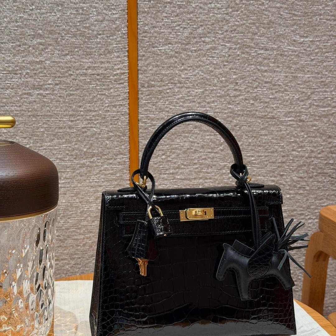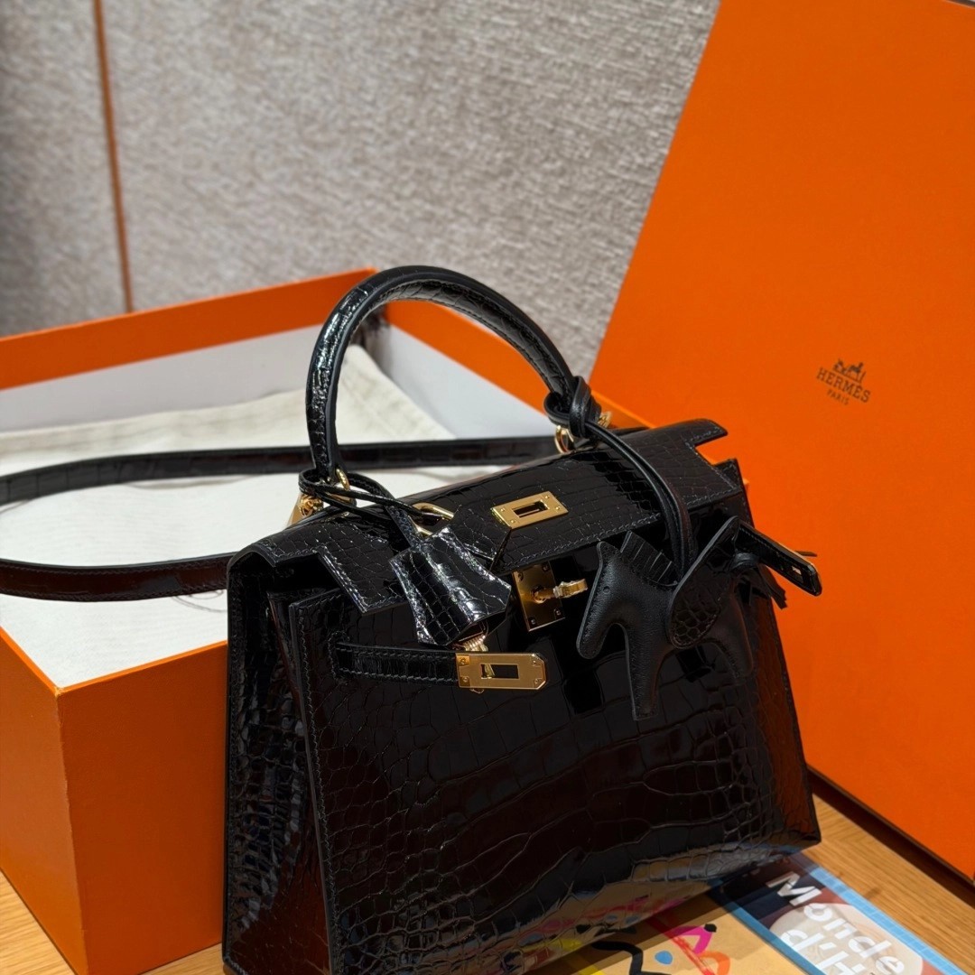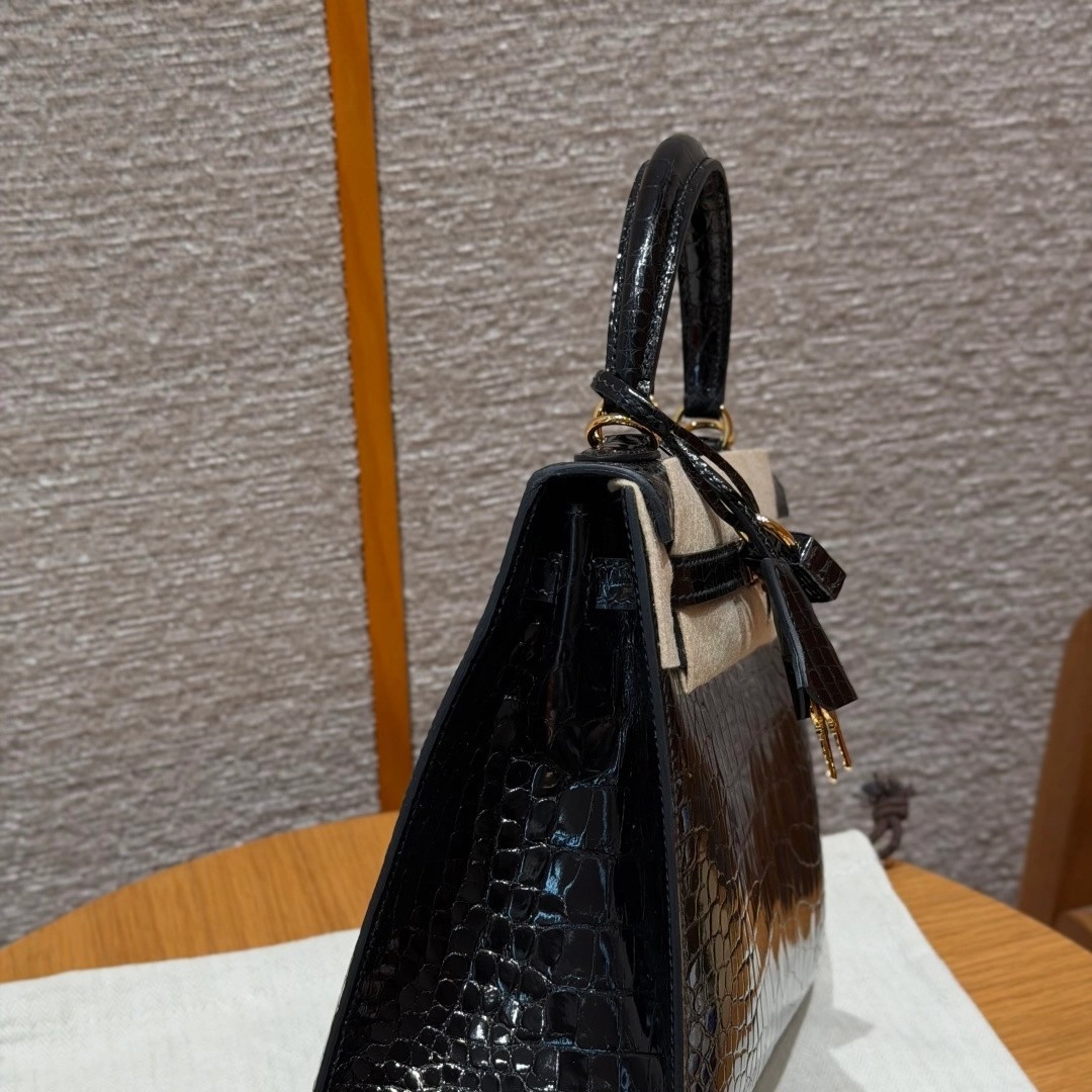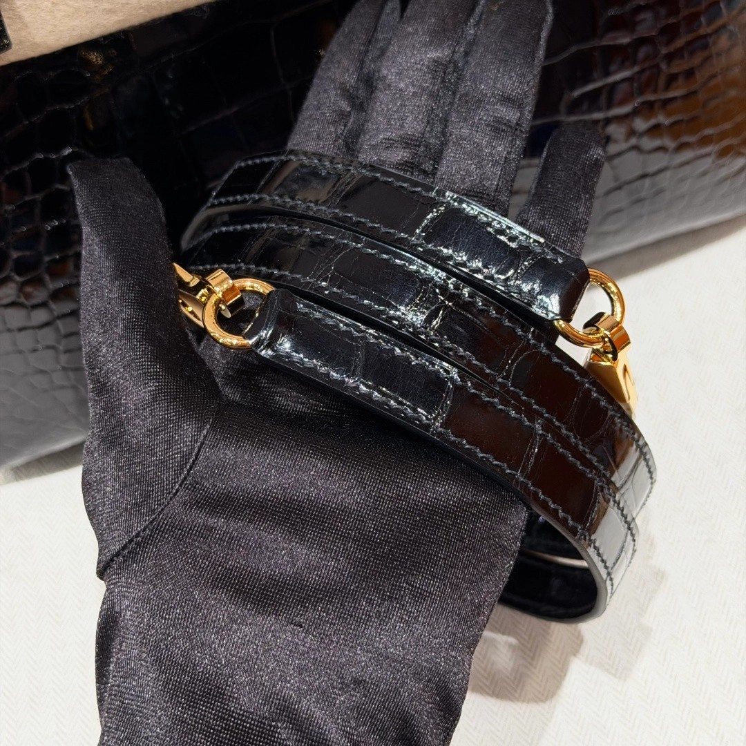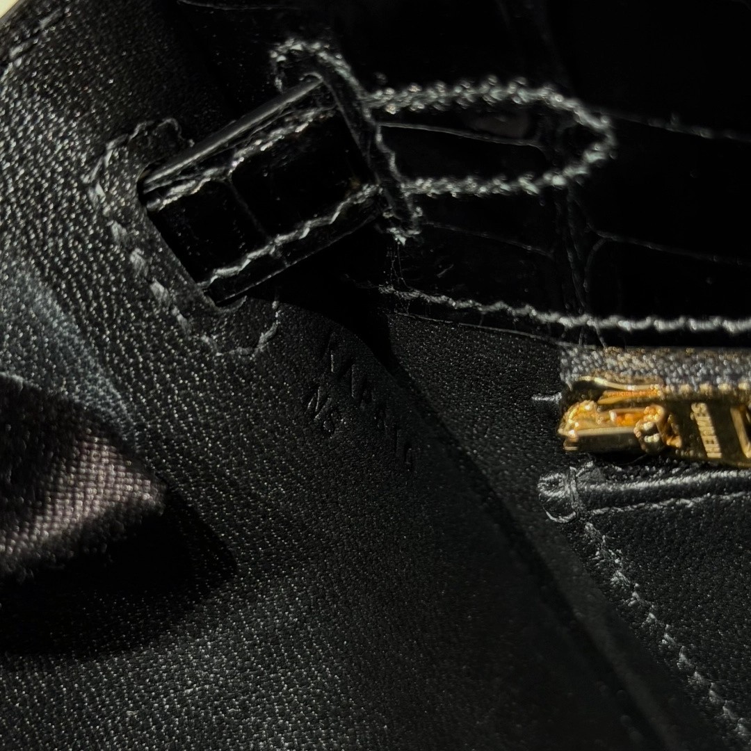 Style: Kelly Colour:89/Noir Size:25*20*13 Leather:Bright faced Alligator🐊 imported From France which originally from Mississippi. Hardware: Gold 铂金25cm,黑色,亮面美洲鳄🐊,法国进口原厂一级鳄鱼皮🐊,原产于密西西比州,金扣,高级全手工专属定制‼️ 纯手工手打钉,手刻五金,精钢电镀18k五金 客订实拍🐎🐎customer order🐎🐎