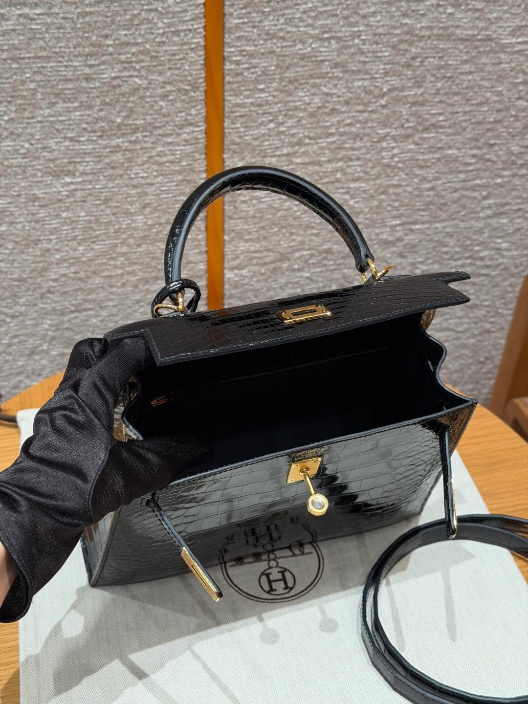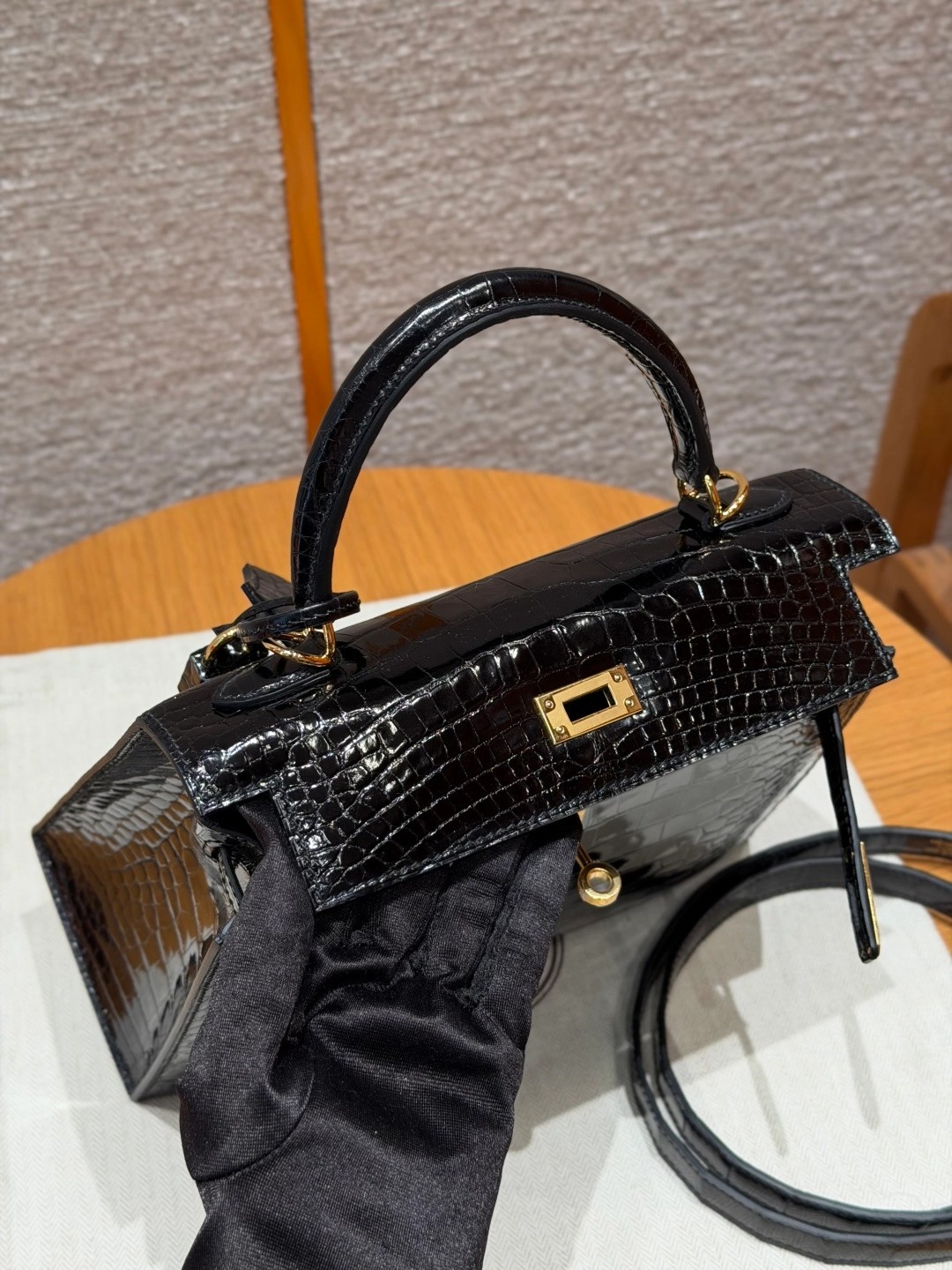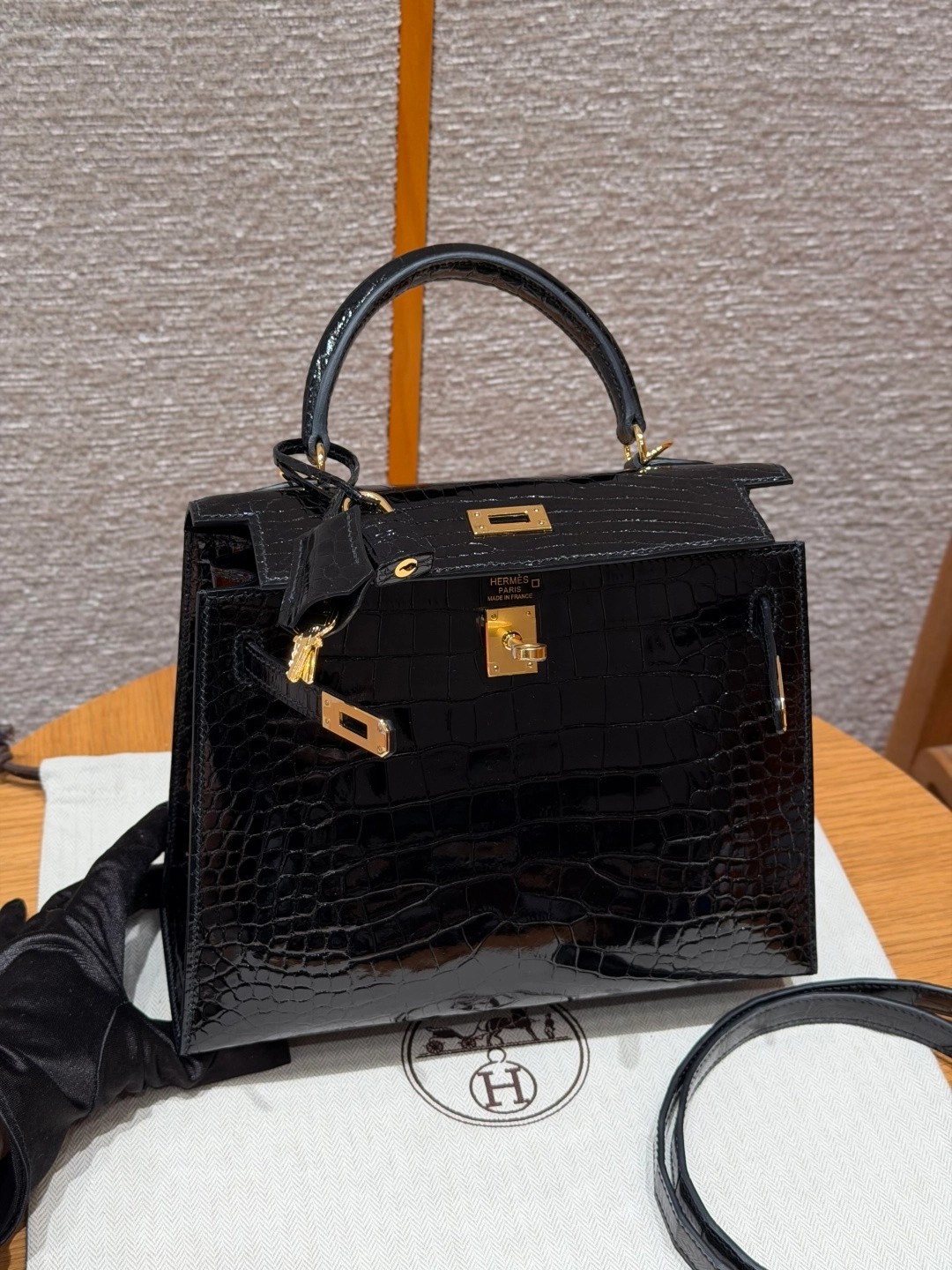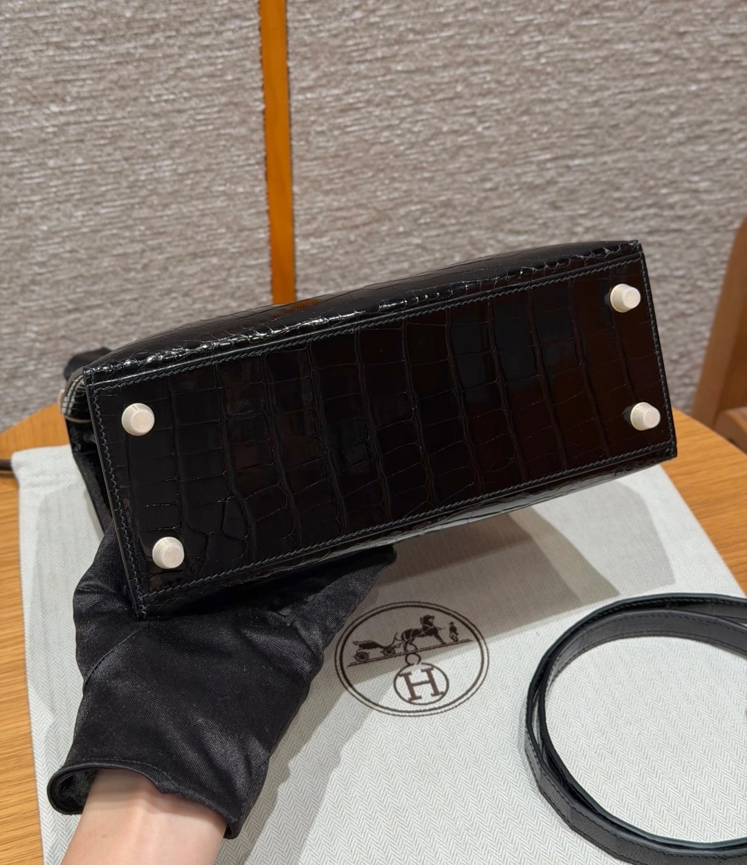 Style: Kelly Colour:89/Noir Size:25*20*13 Leather:Bright faced Alligator🐊 imported From France which originally from Mississippi. Hardware: Gold 铂金25cm,黑色,亮面美洲鳄🐊,法国进口原厂一级鳄鱼皮🐊,原产于密西西比州,金扣,高级全手工专属定制‼️ 纯手工手打钉,手刻五金,精钢电镀18k五金 客订实拍🐎🐎customer order🐎🐎