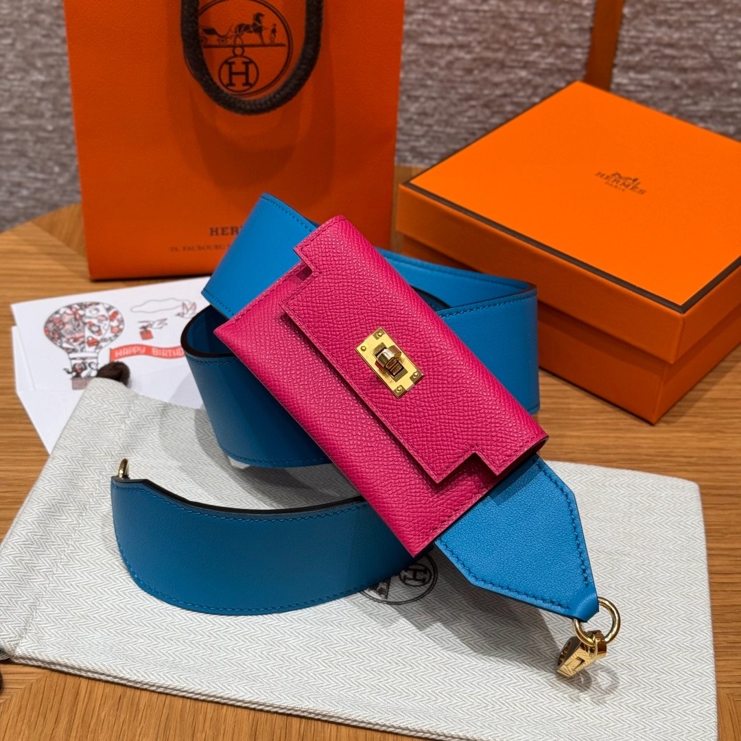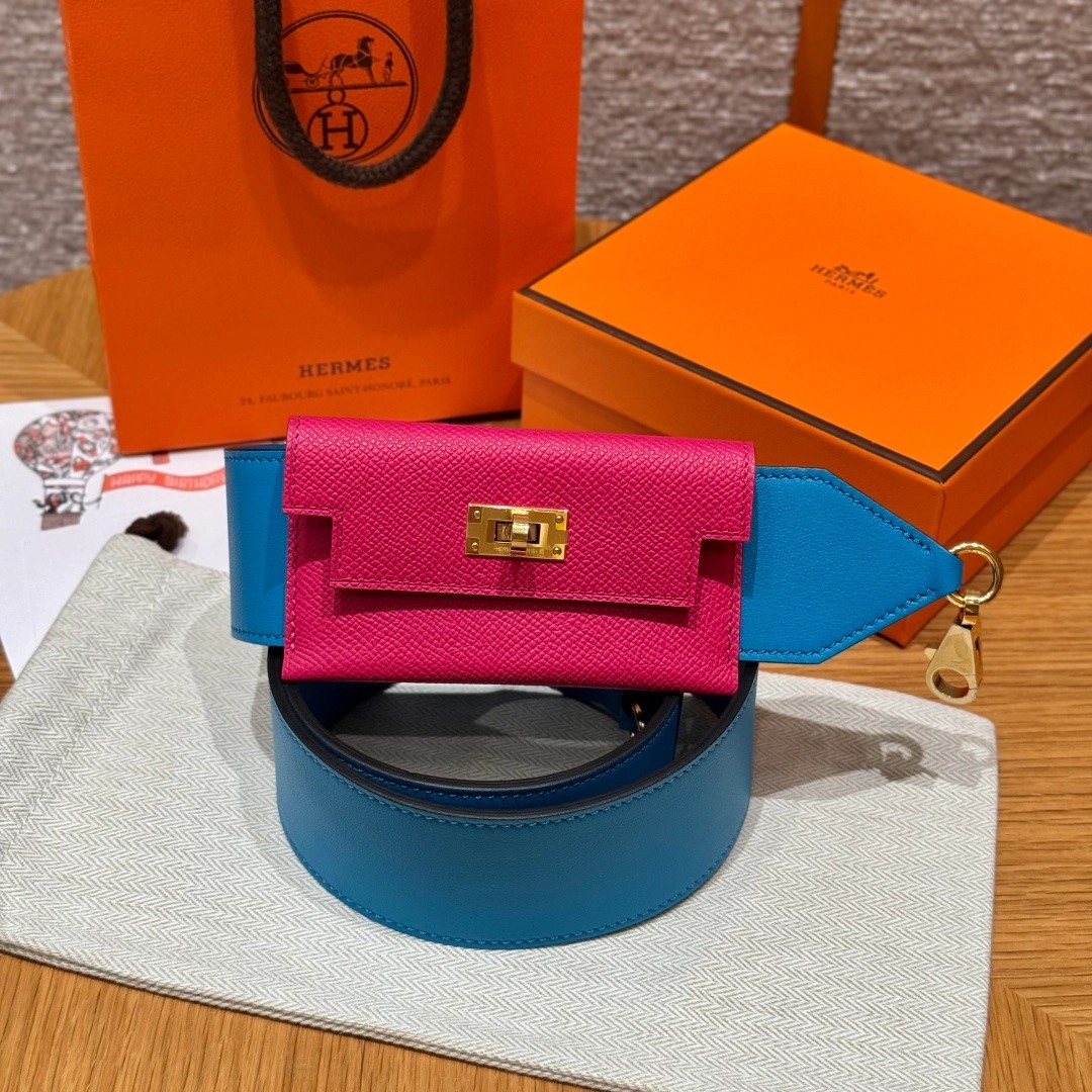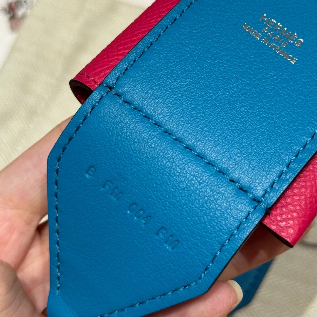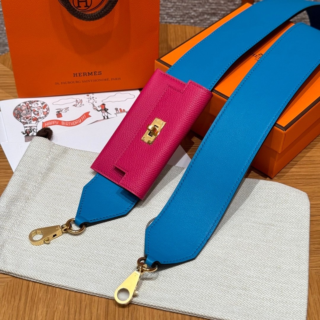 Style:Kelly pocket strap肩带 Colour:L3/Rose purple/0F/Blue Frida Size:小包:12*9.5*0.4cm 肩带身:105*5cm Leather: Epsom and swift From France Hardware:gold 肩带,玫紫色拼佛罗里达蓝,金扣、法国进口原厂皮 客订实拍🐎🐎customer order🐎🐎