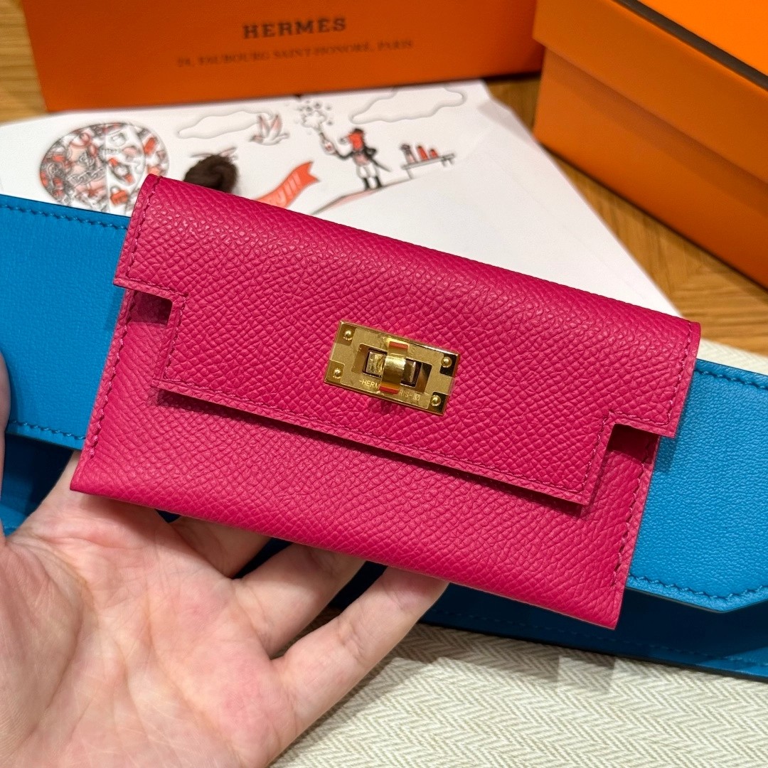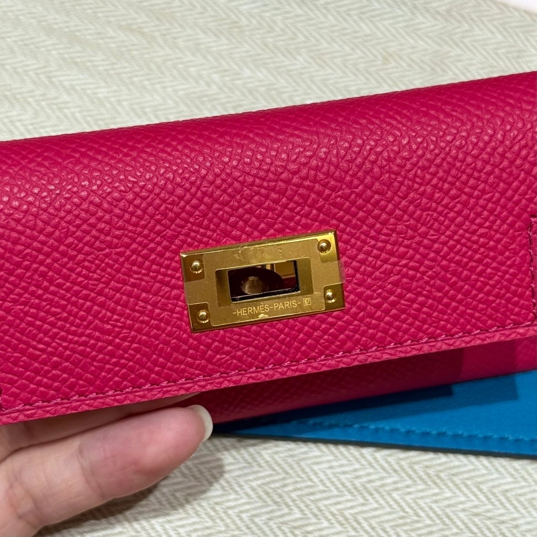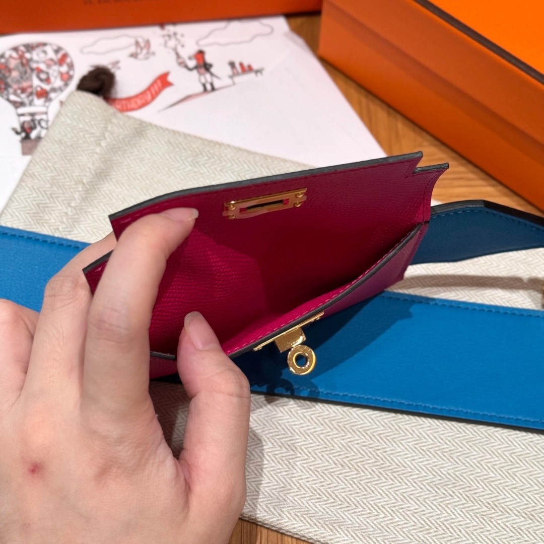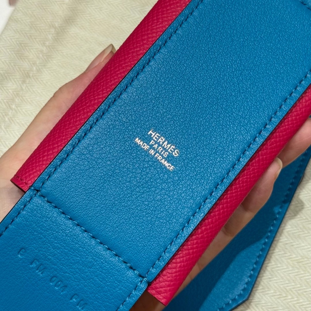 Style:Kelly pocket strap肩带 Colour:L3/Rose purple/0F/Blue Frida Size:小包:12*9.5*0.4cm 肩带身:105*5cm Leather: Epsom and swift From France Hardware:gold 肩带,玫紫色拼佛罗里达蓝,金扣、法国进口原厂皮 客订实拍🐎🐎customer order🐎🐎