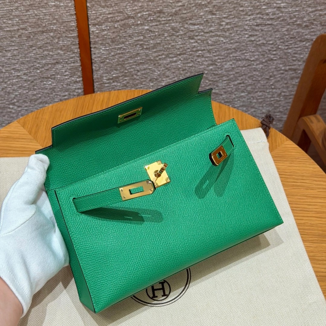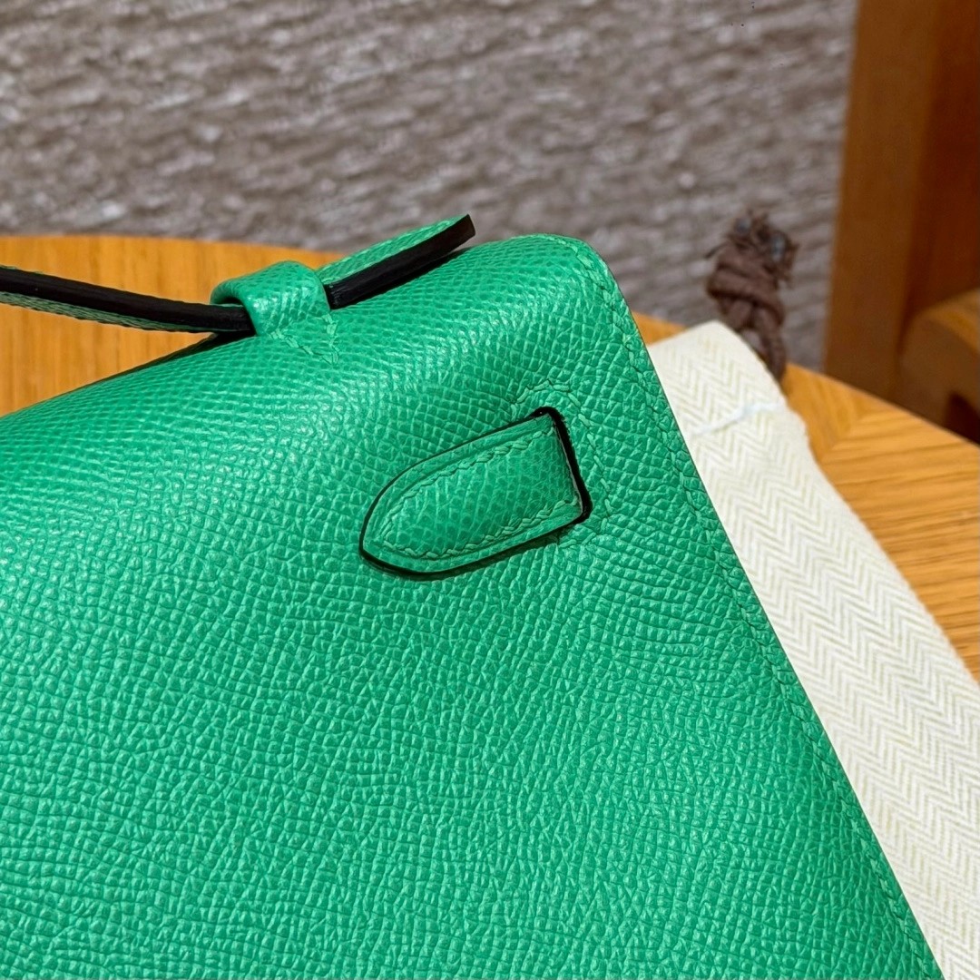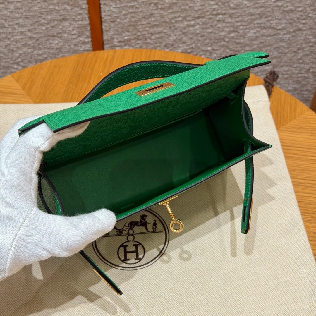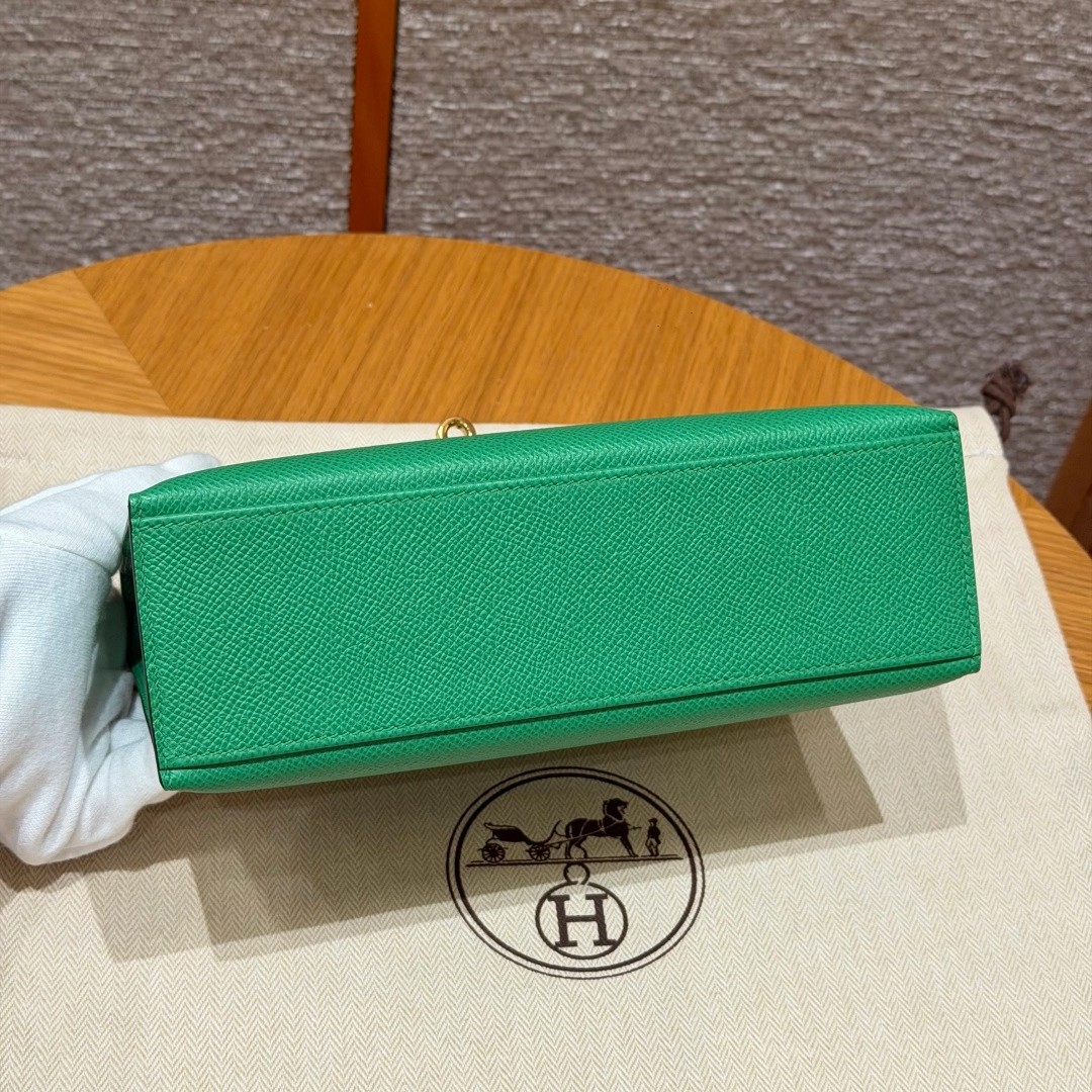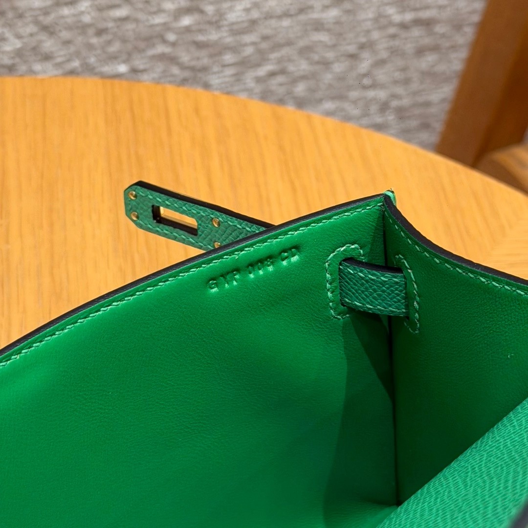Style:Kelly Pochette Colour: 1K/Bambou Size:22*12*7cm Leather:Epsom From France Hardware:gold 迷你凯莉一代,竹子绿,法国进口原厂牛皮掌纹,金扣,高级全手工专属定制‼️ 纯手工手打钉,手刻五金,精钢电镀18k五金 客订实拍🐎🐎customer order🐎🐎
