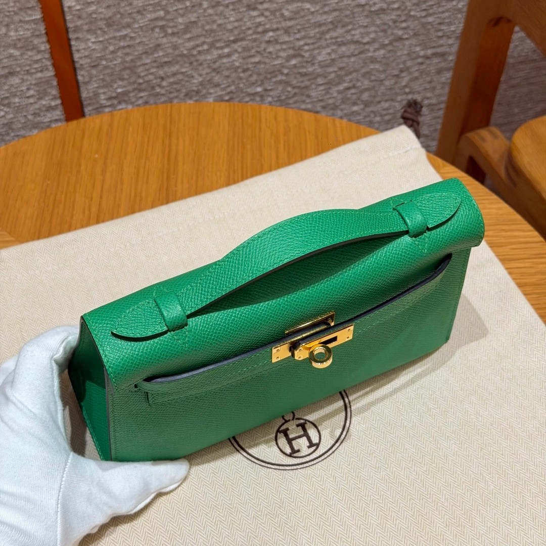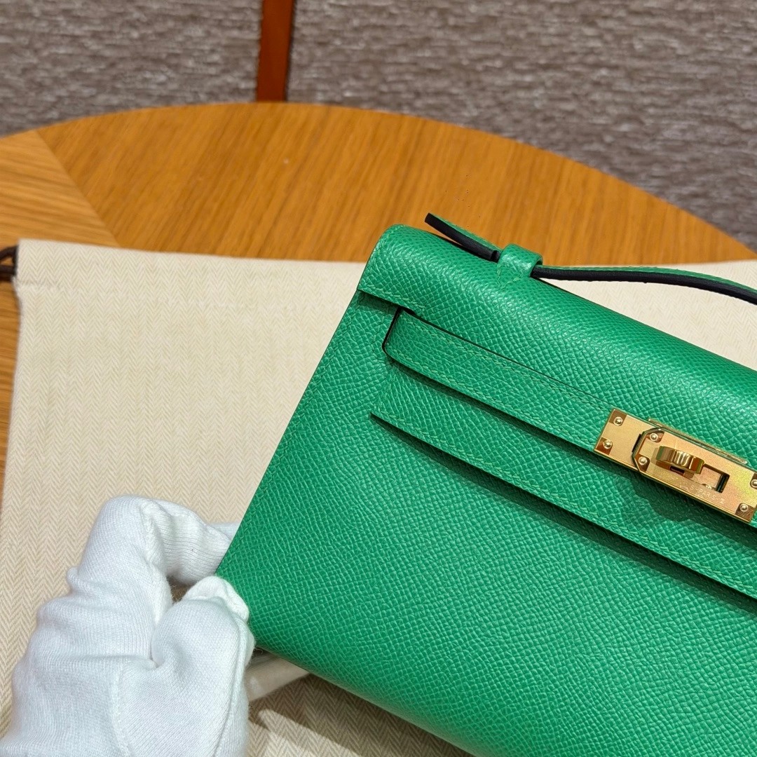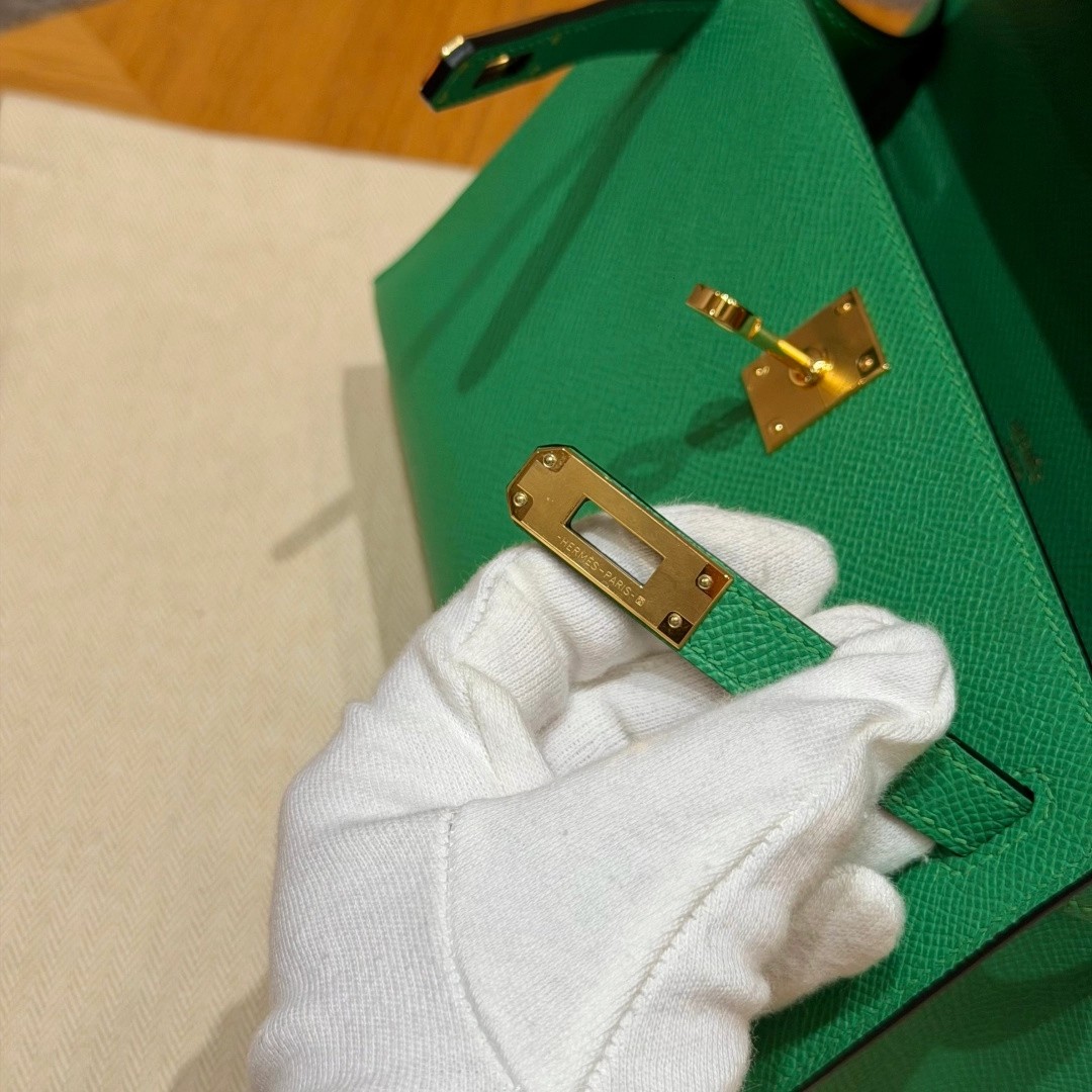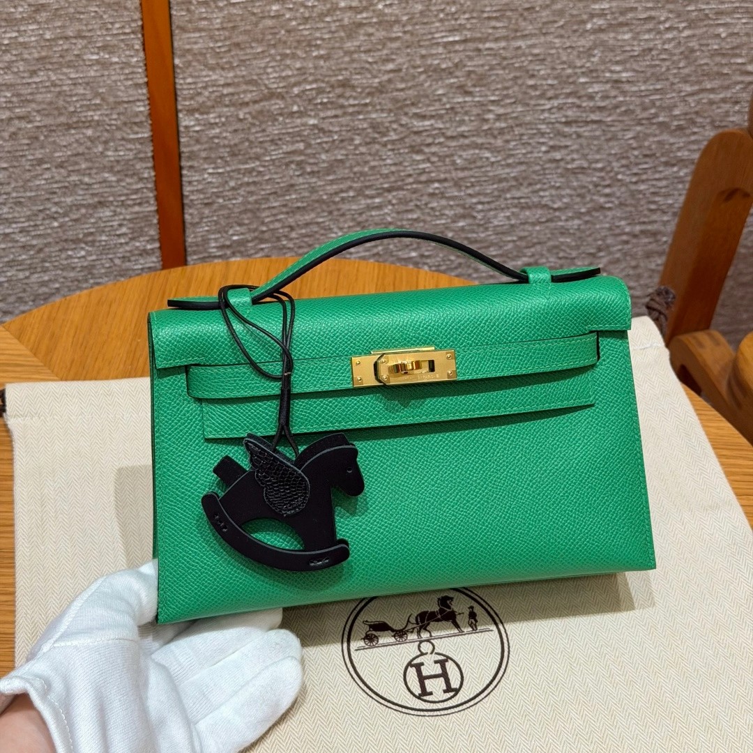 Style:Kelly Pochette Colour: 1K/Bambou Size:22*12*7cm Leather:Epsom From France Hardware:gold 迷你凯莉一代,竹子绿,法国进口原厂牛皮掌纹,金扣,高级全手工专属定制‼️ 纯手工手打钉,手刻五金,精钢电镀18k五金 客订实拍🐎🐎customer order🐎🐎