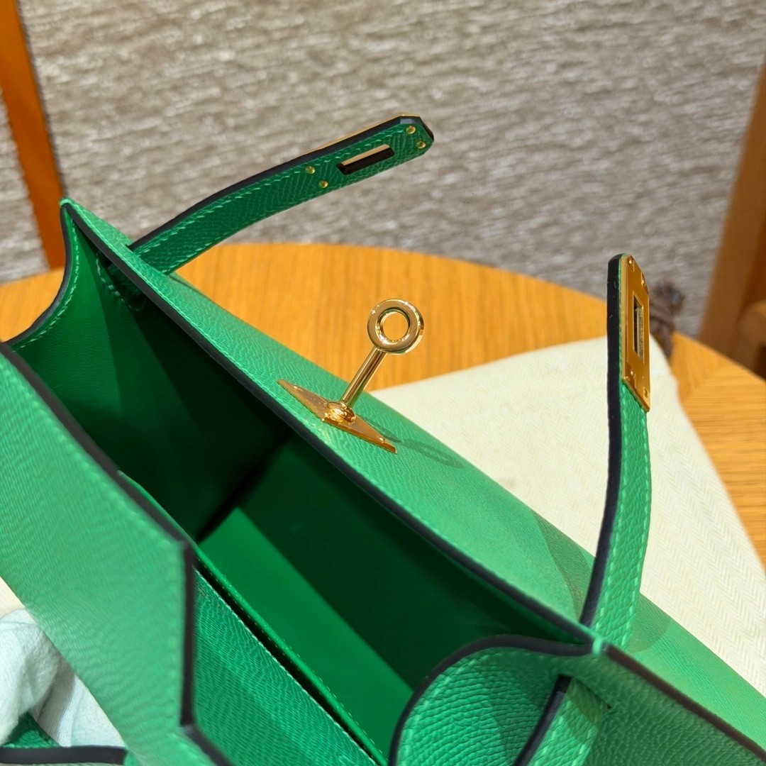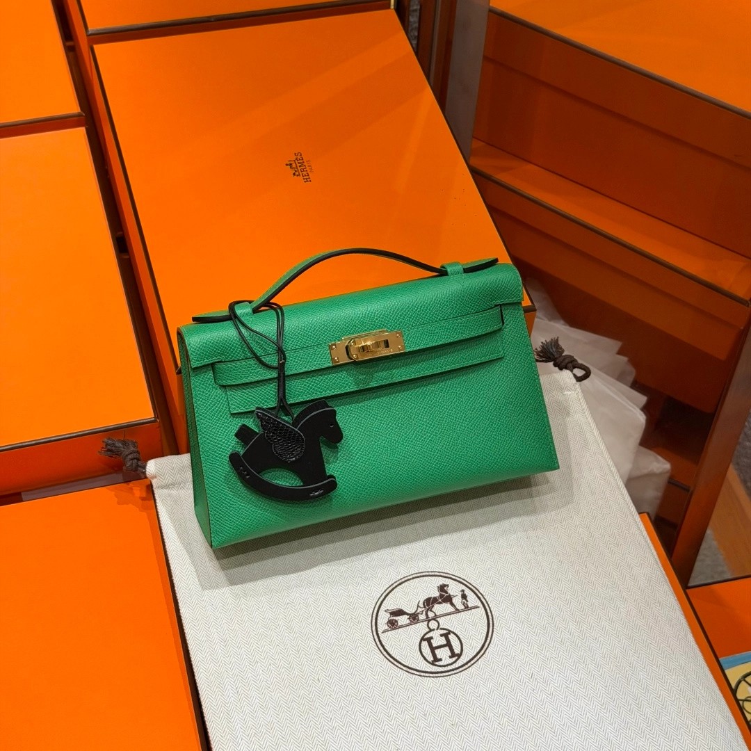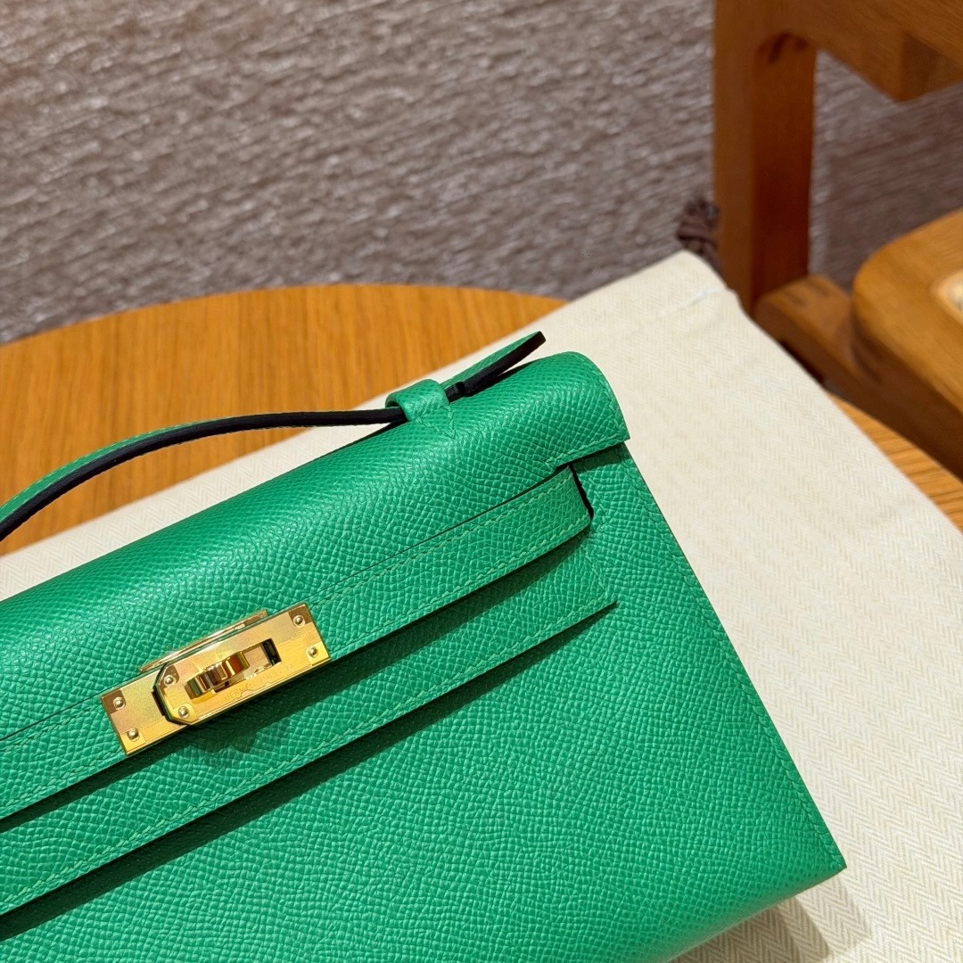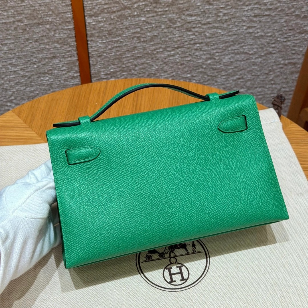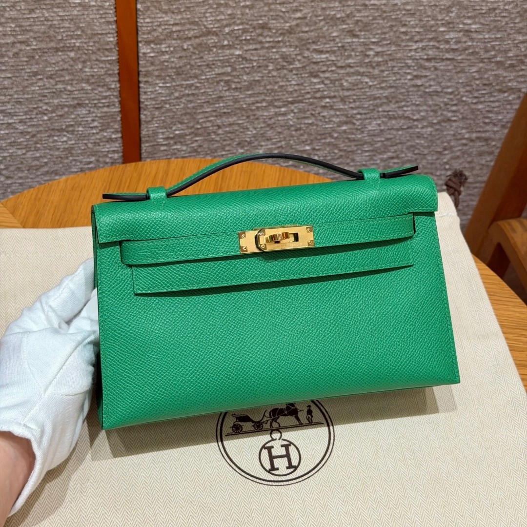 Style:Kelly Pochette Colour: 1K/Bambou Size:22*12*7cm Leather:Epsom From France Hardware:gold 迷你凯莉一代,竹子绿,法国进口原厂牛皮掌纹,金扣,高级全手工专属定制‼️ 纯手工手打钉,手刻五金,精钢电镀18k五金 客订实拍🐎🐎customer order🐎🐎