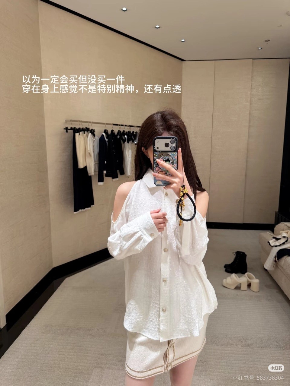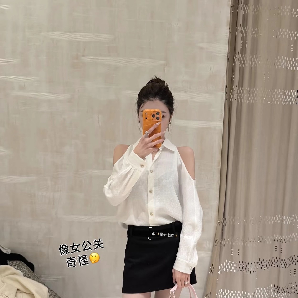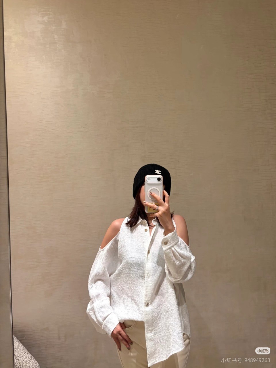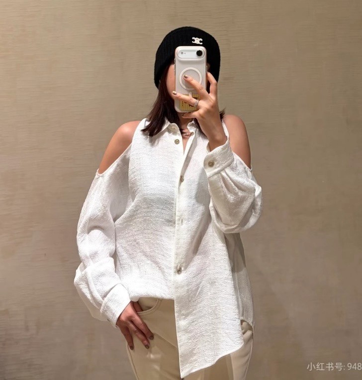 C家 26Ss————早春最新款轻熟风露肩长袖真丝衬衫 🤍经典翻领设计保留了衬衫的利落感 中和了露肩设计的甜腻 宽松落肩版型 下摆呈微弧形自带随性慵懒的垂坠感 对身材包容度很高自带慵懒又精致的氛围感 很适合打造温柔又带点小性感的穿搭 一色现货发售sml 99530480