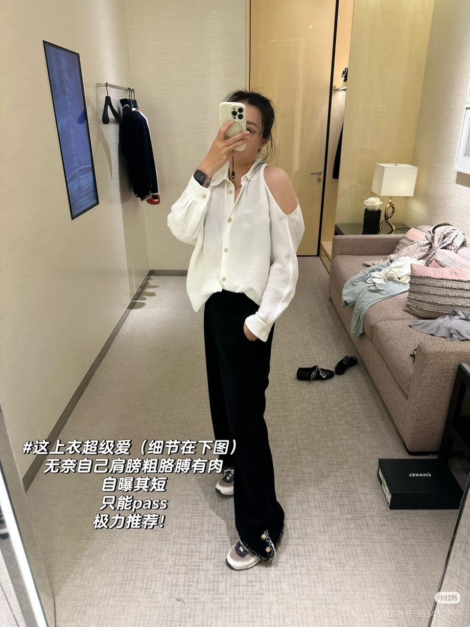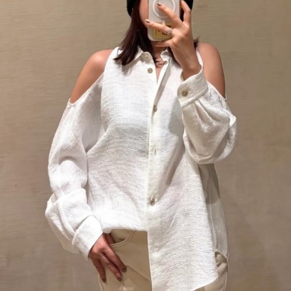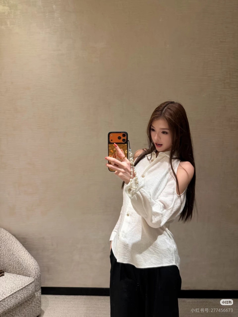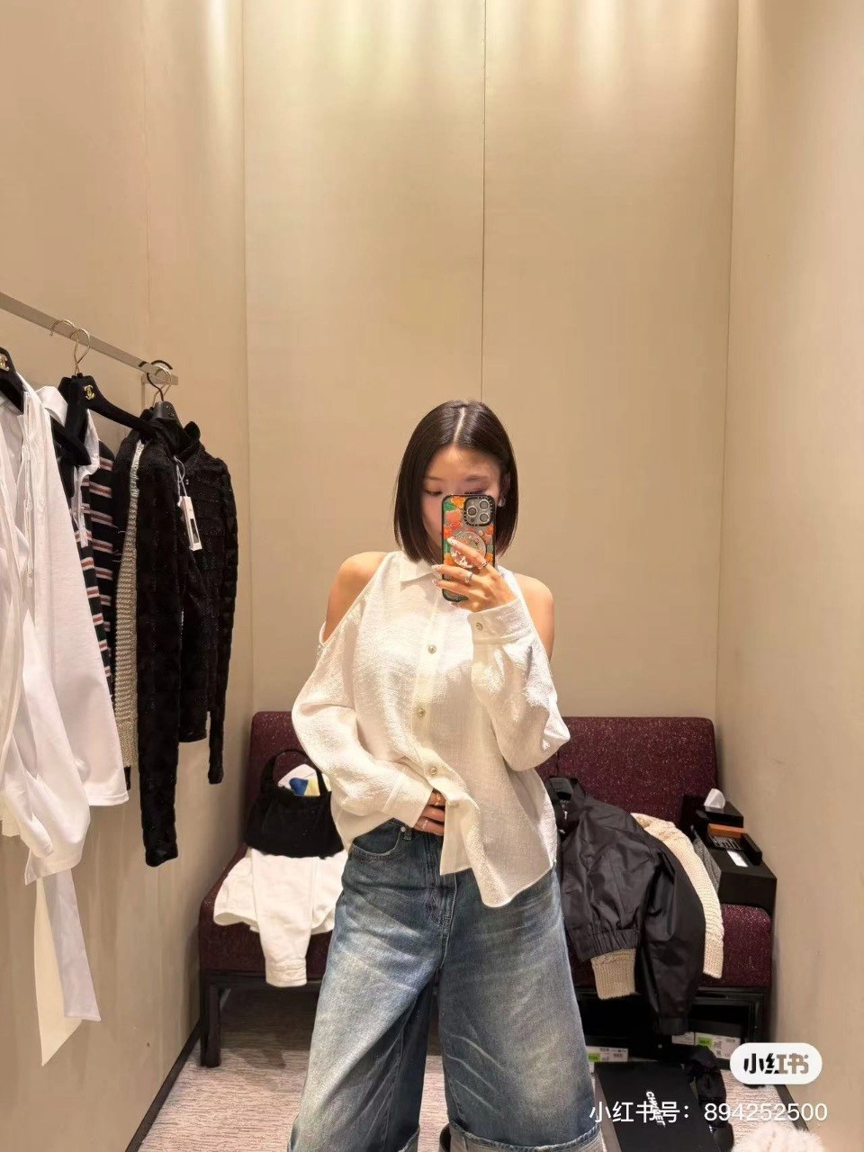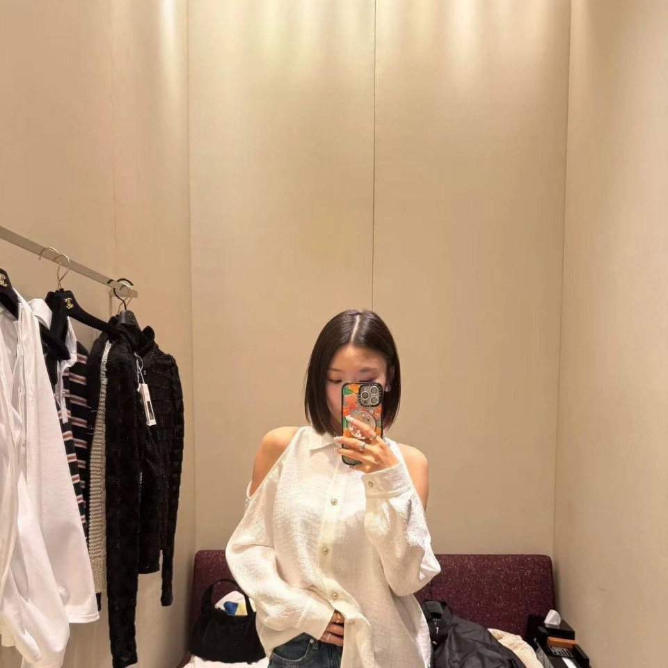 C家 26Ss————早春最新款轻熟风露肩长袖真丝衬衫 🤍经典翻领设计保留了衬衫的利落感 中和了露肩设计的甜腻 宽松落肩版型 下摆呈微弧形自带随性慵懒的垂坠感 对身材包容度很高自带慵懒又精致的氛围感 很适合打造温柔又带点小性感的穿搭 一色现货发售sml 99530480
