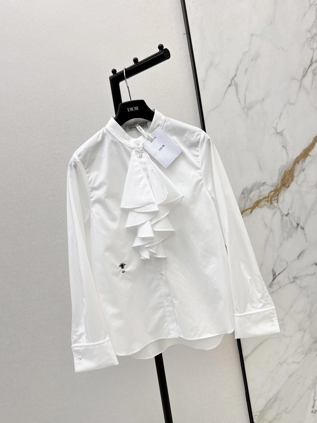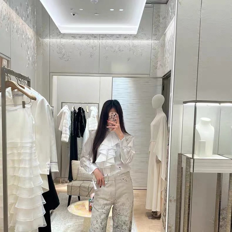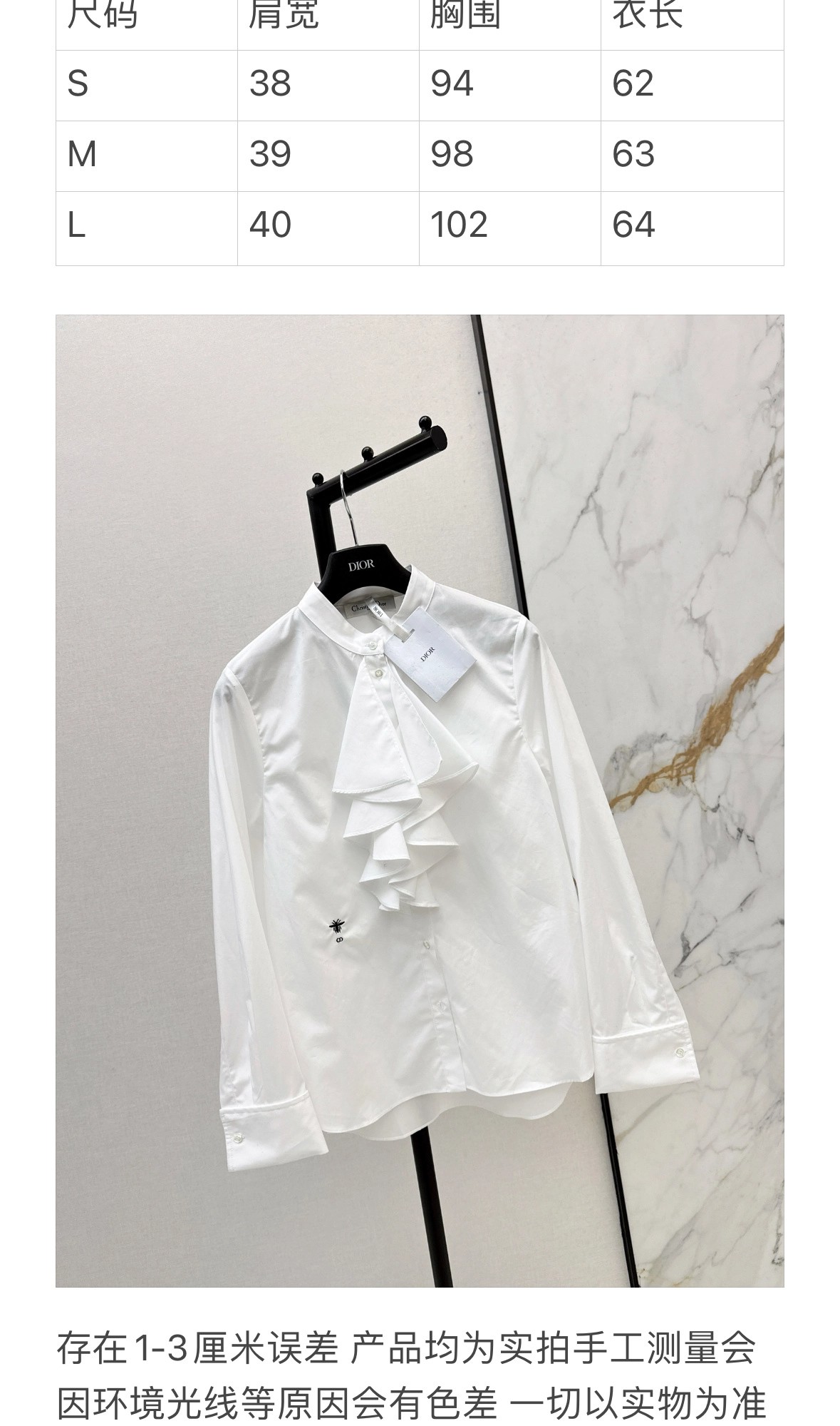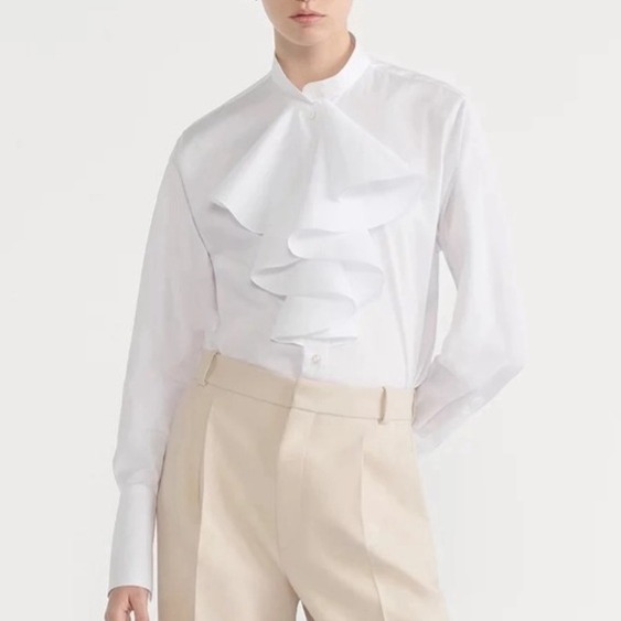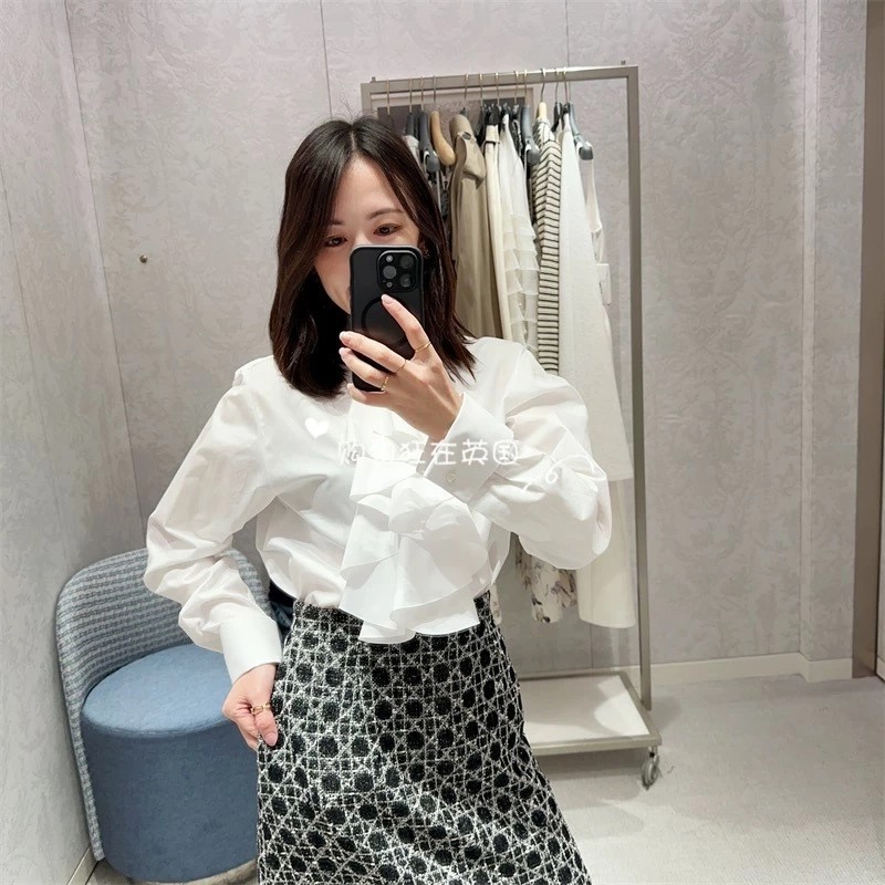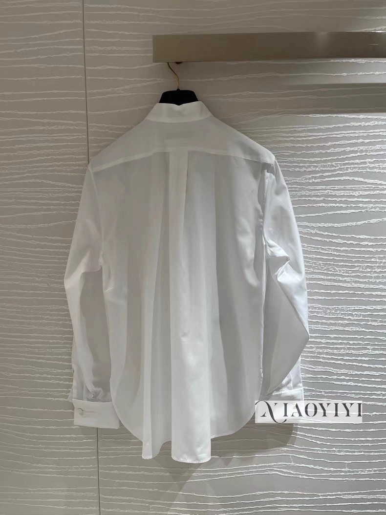 CD 26Ss————早春最新款荷叶边立领衬衫 🤍定位褶皱花边经典前短后长版型显瘦又高挑 荷叶边领口层次感十足 细节精致刺绣CD小蜜蜂 复古宫廷风可甜可盐气质上身美到没朋友 纯棉面料轻薄舒适 演绎慵懒随性的高级单品 自带优雅华丽感 白富美必入 一色现货发售sml 99290210