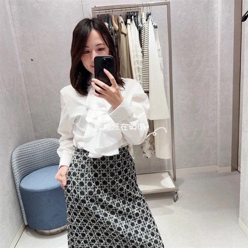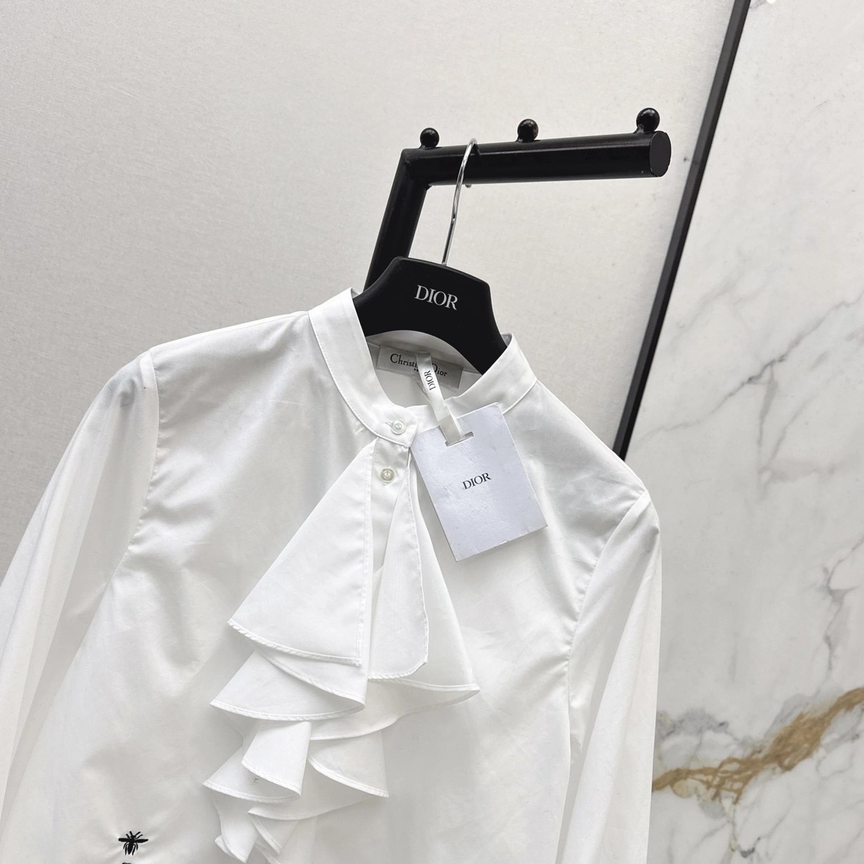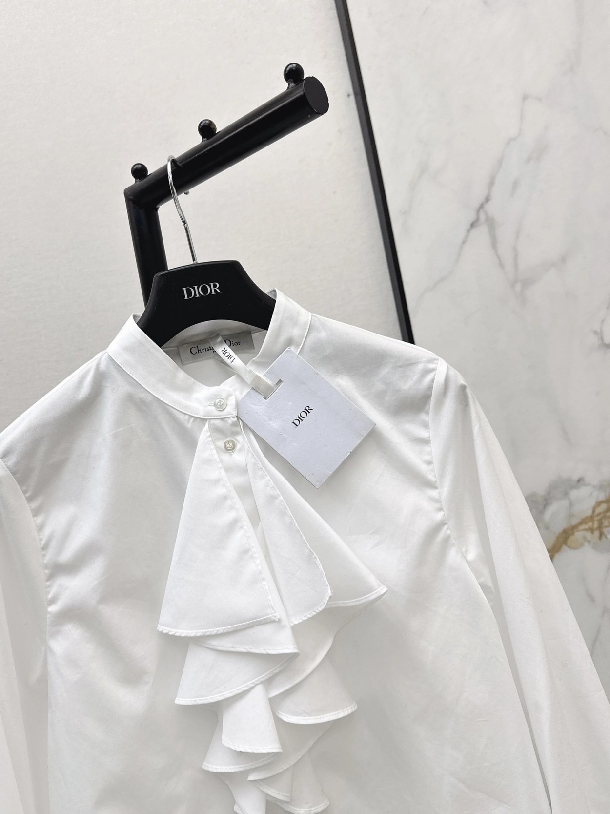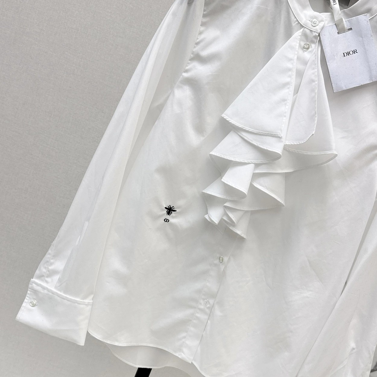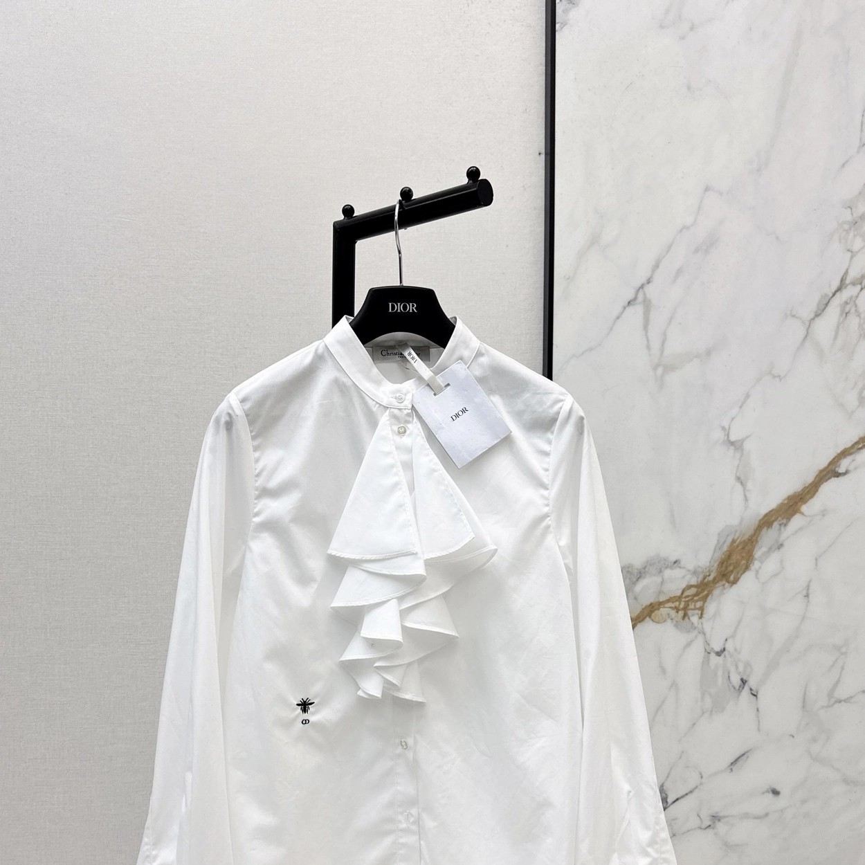 CD 26Ss————早春最新款荷叶边立领衬衫 🤍定位褶皱花边经典前短后长版型显瘦又高挑 荷叶边领口层次感十足 细节精致刺绣CD小蜜蜂 复古宫廷风可甜可盐气质上身美到没朋友 纯棉面料轻薄舒适 演绎慵懒随性的高级单品 自带优雅华丽感 白富美必入 一色现货发售sml 99290210