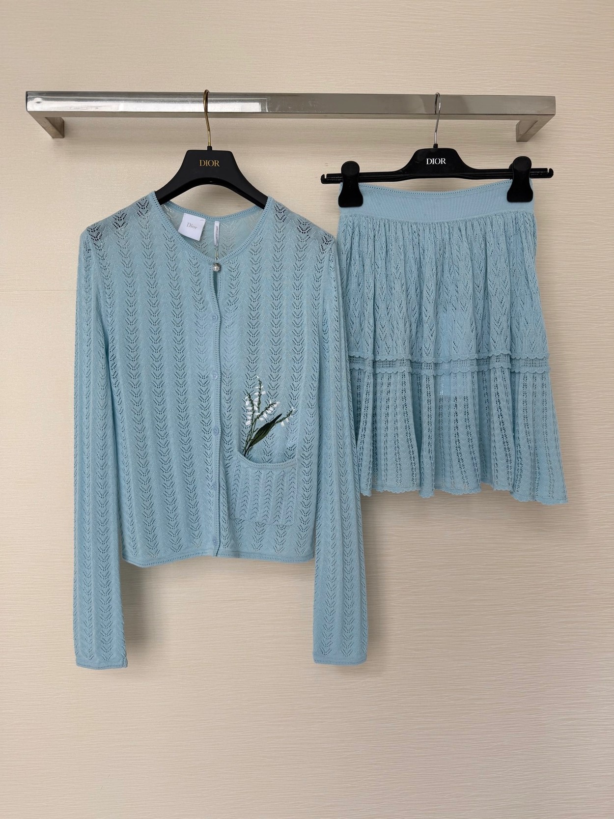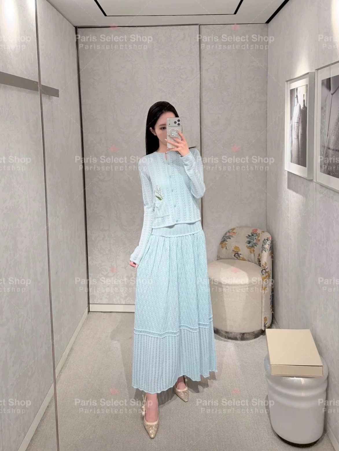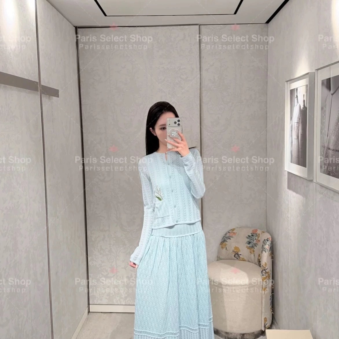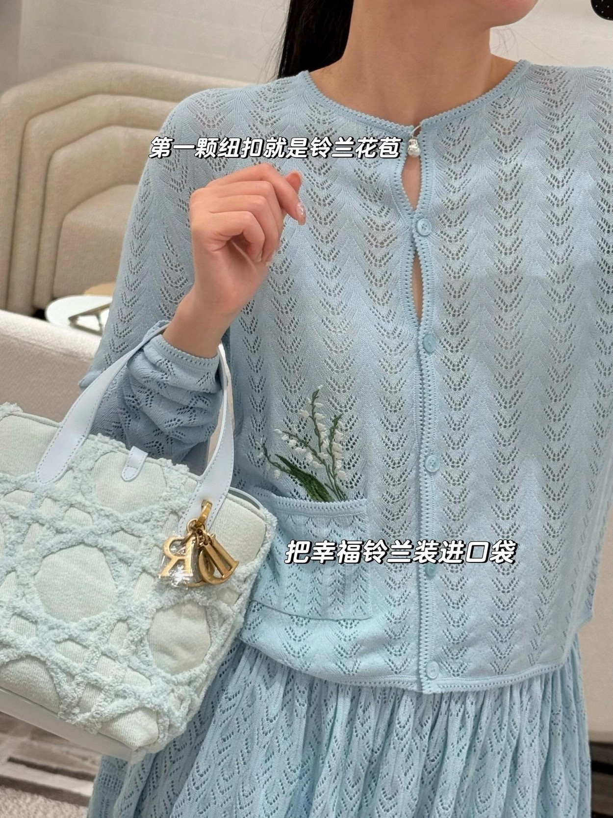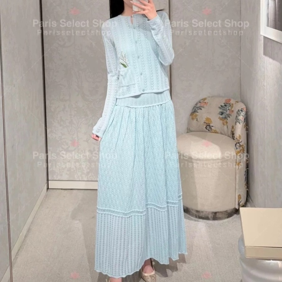 🛒Dio* 26c早春新款铃兰花刺绣开衫&褶皱半裙。Y版定制黏胶和棉纱混纺弹力镂空针织,轻薄柔软亲肤舒爽。合身圆领双口袋小开衫口袋花卉刺绣装饰,领口铃兰花苞纽扣装饰。高腰弹力褶皱A字半裙,配送防走光真丝内衬。一套搭配清爽纯美,精美典雅。