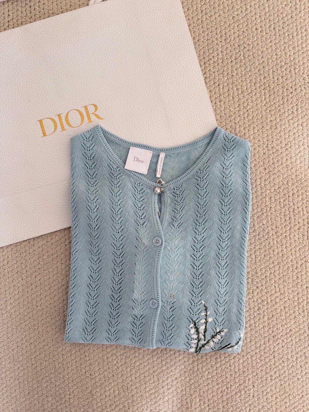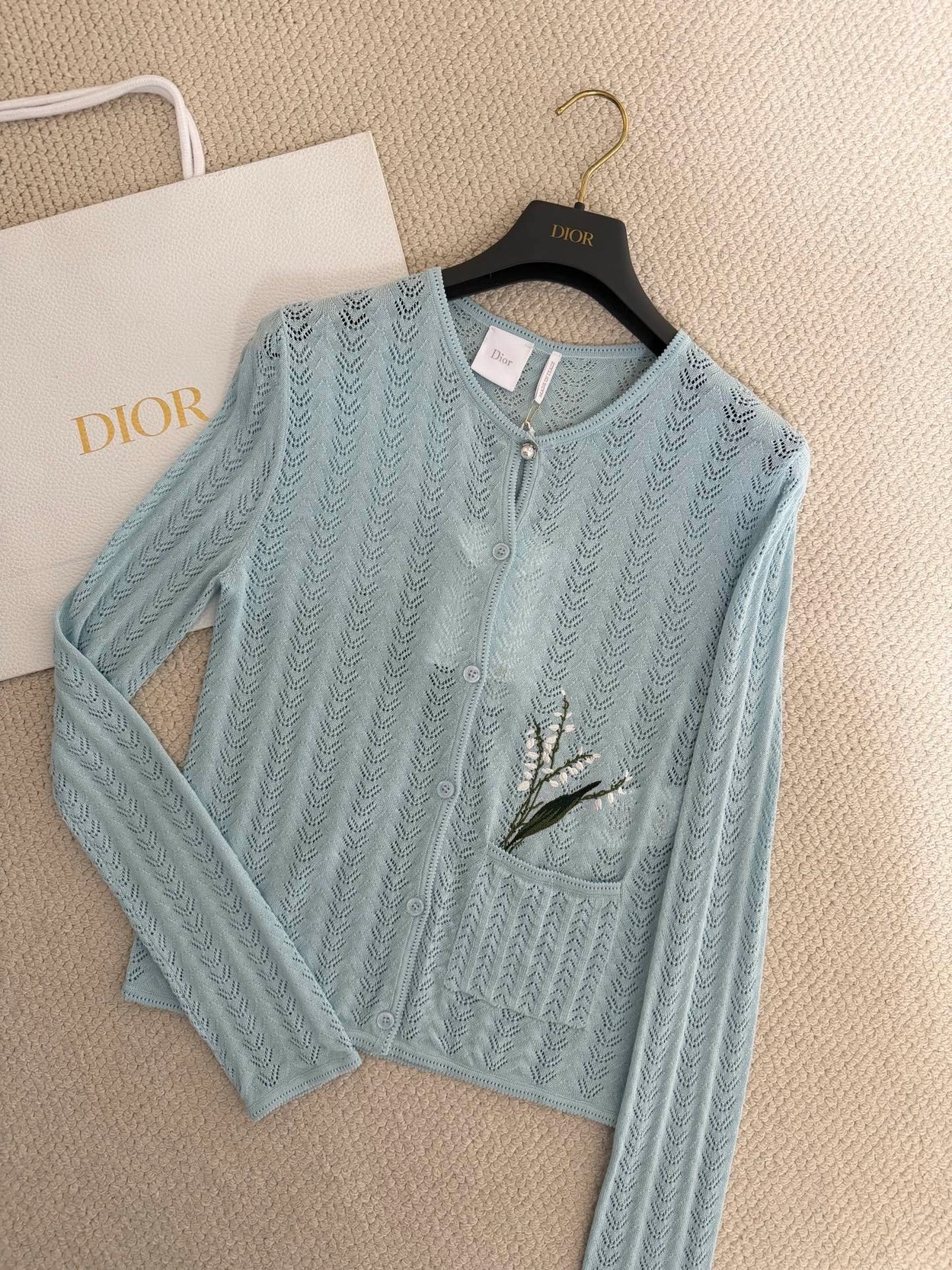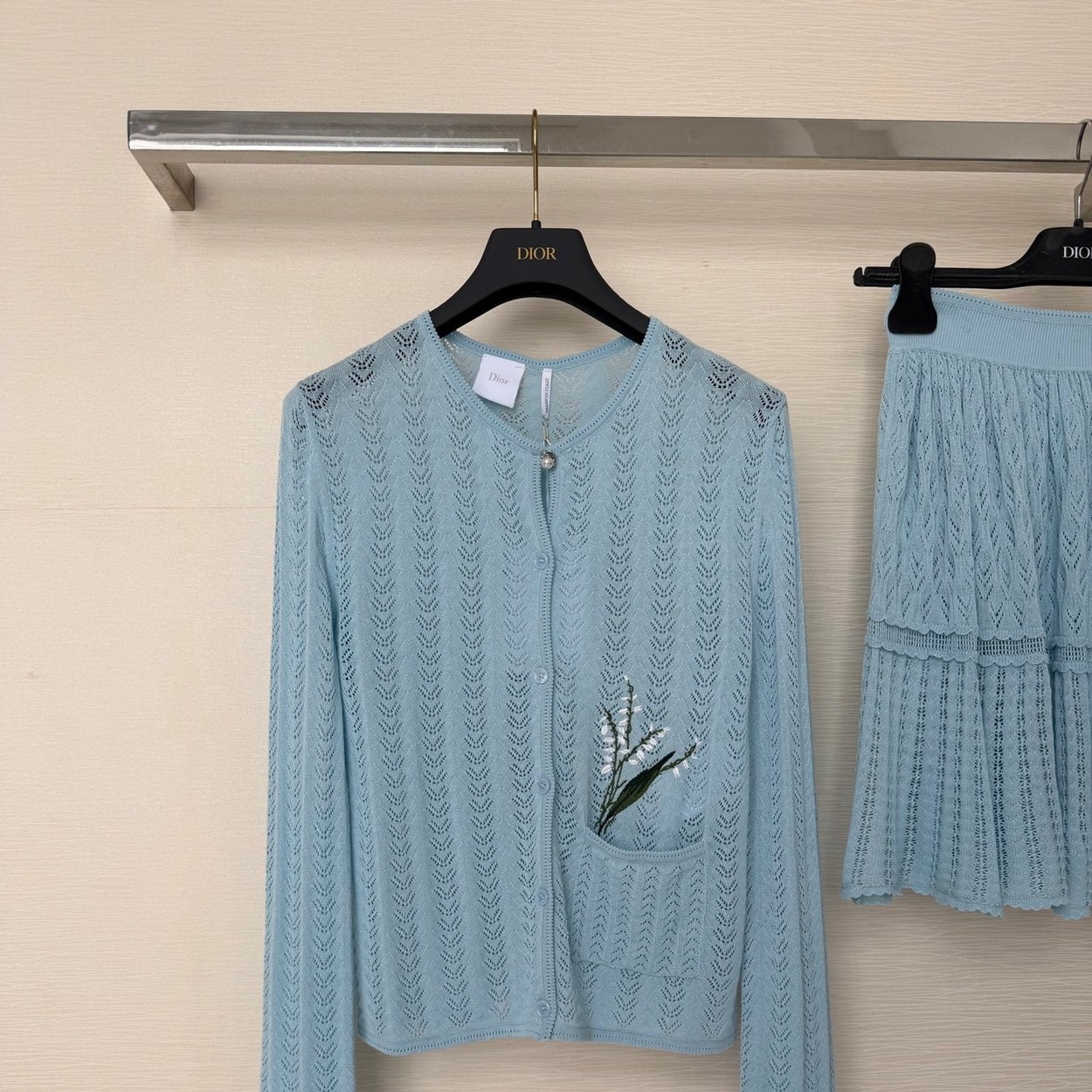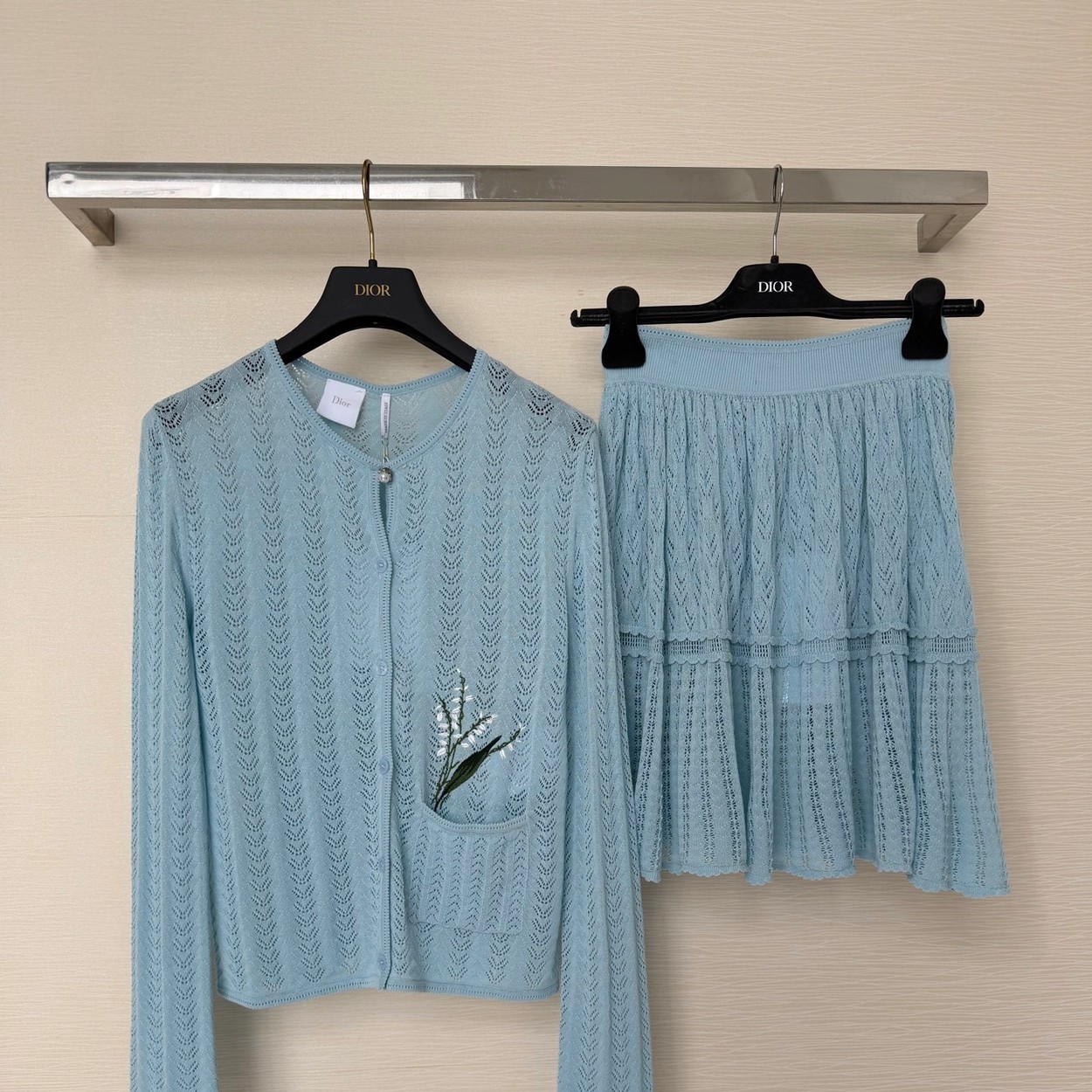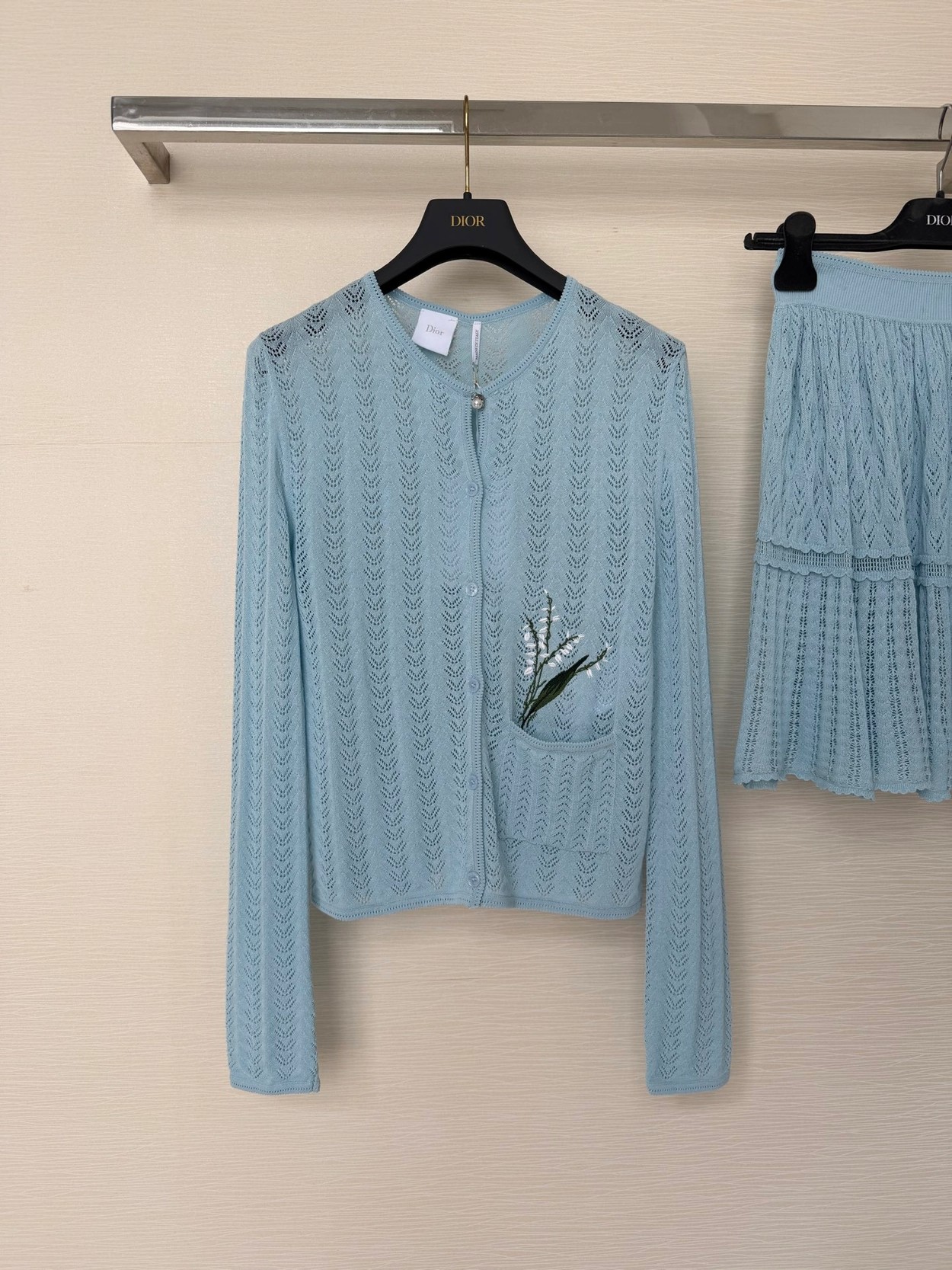 🛒Dio* 26c早春新款铃兰花刺绣开衫&褶皱半裙。Y版定制黏胶和棉纱混纺弹力镂空针织,轻薄柔软亲肤舒爽。合身圆领双口袋小开衫口袋花卉刺绣装饰,领口铃兰花苞纽扣装饰。高腰弹力褶皱A字半裙,配送防走光真丝内衬。一套搭配清爽纯美,精美典雅。