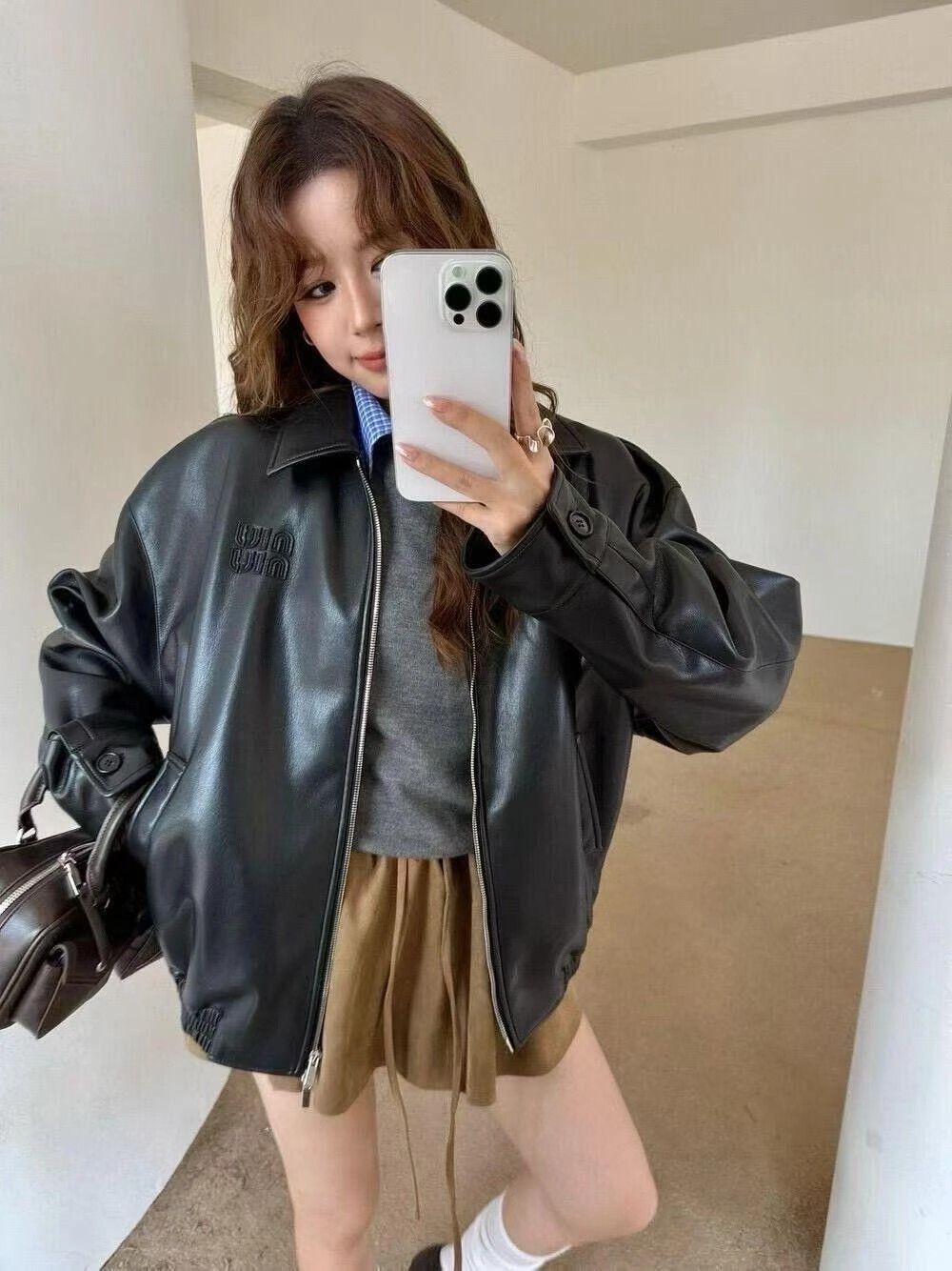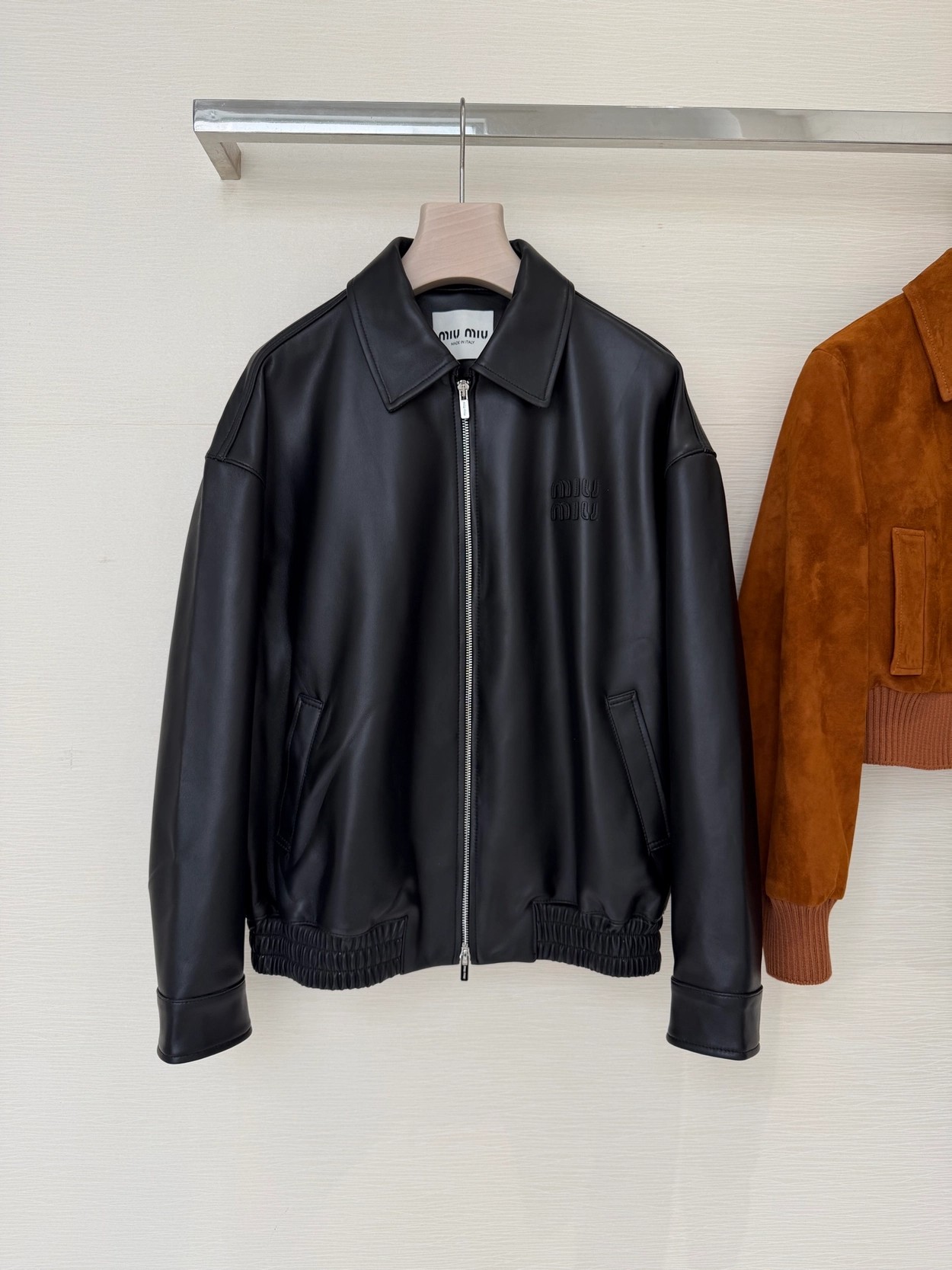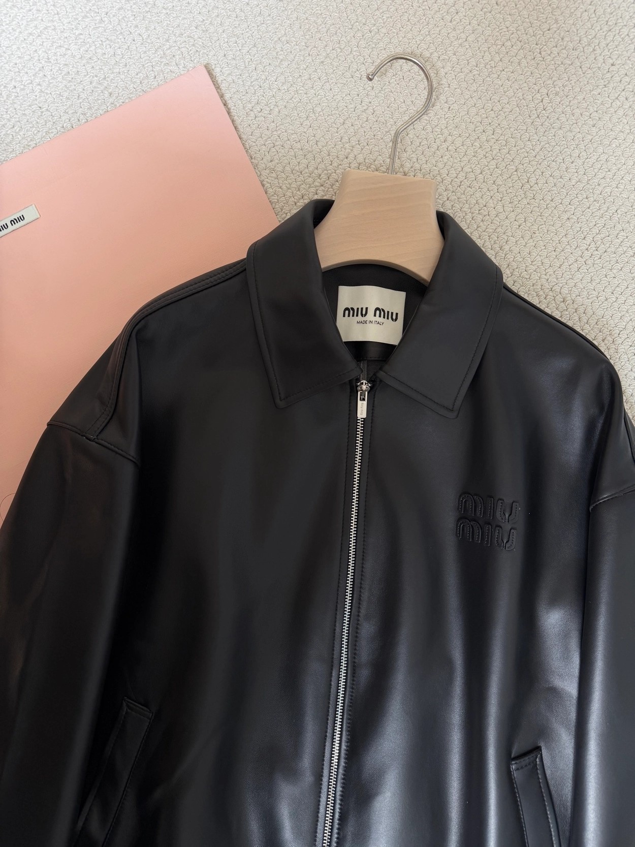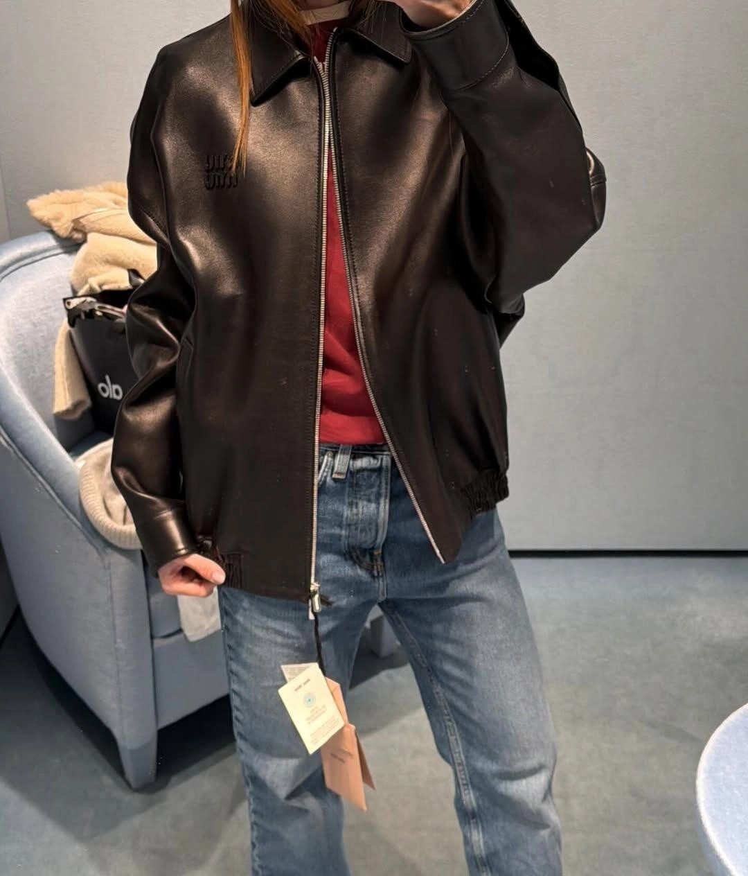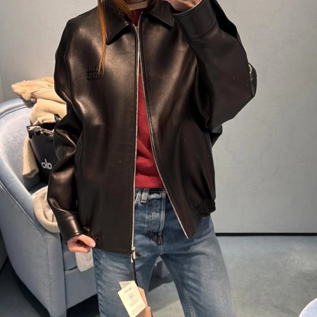 🛒Miumi* 25fw 秋冬新款翻领皮夹克外套。Y版定制高级进口小羊皮,如肌肤般富有弹性和光泽感。气质翻领,甜美落肩袖宽大立体微阔夹克版型,对身材包容性极佳,🖤少女感甜酷辣妹风轻松驾驭!