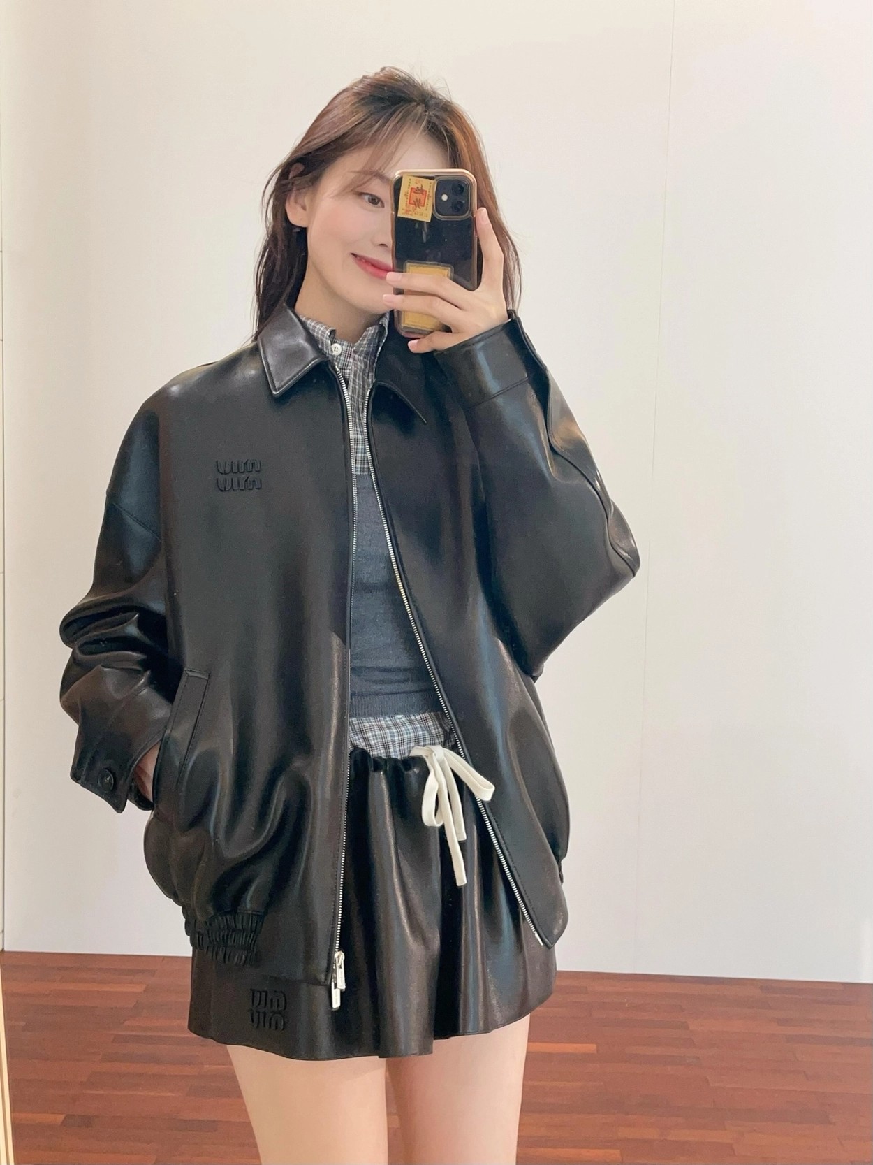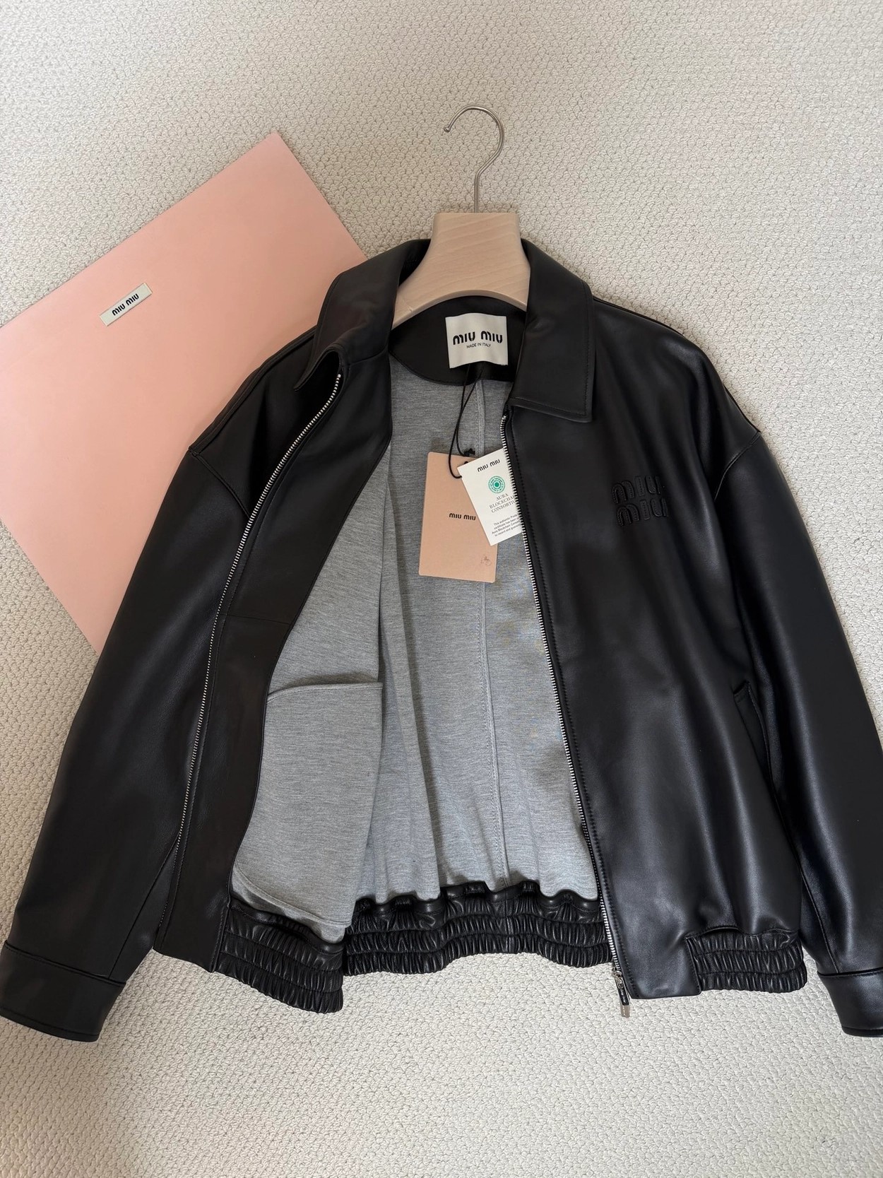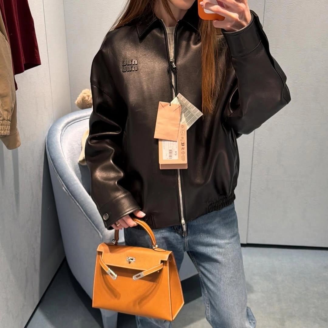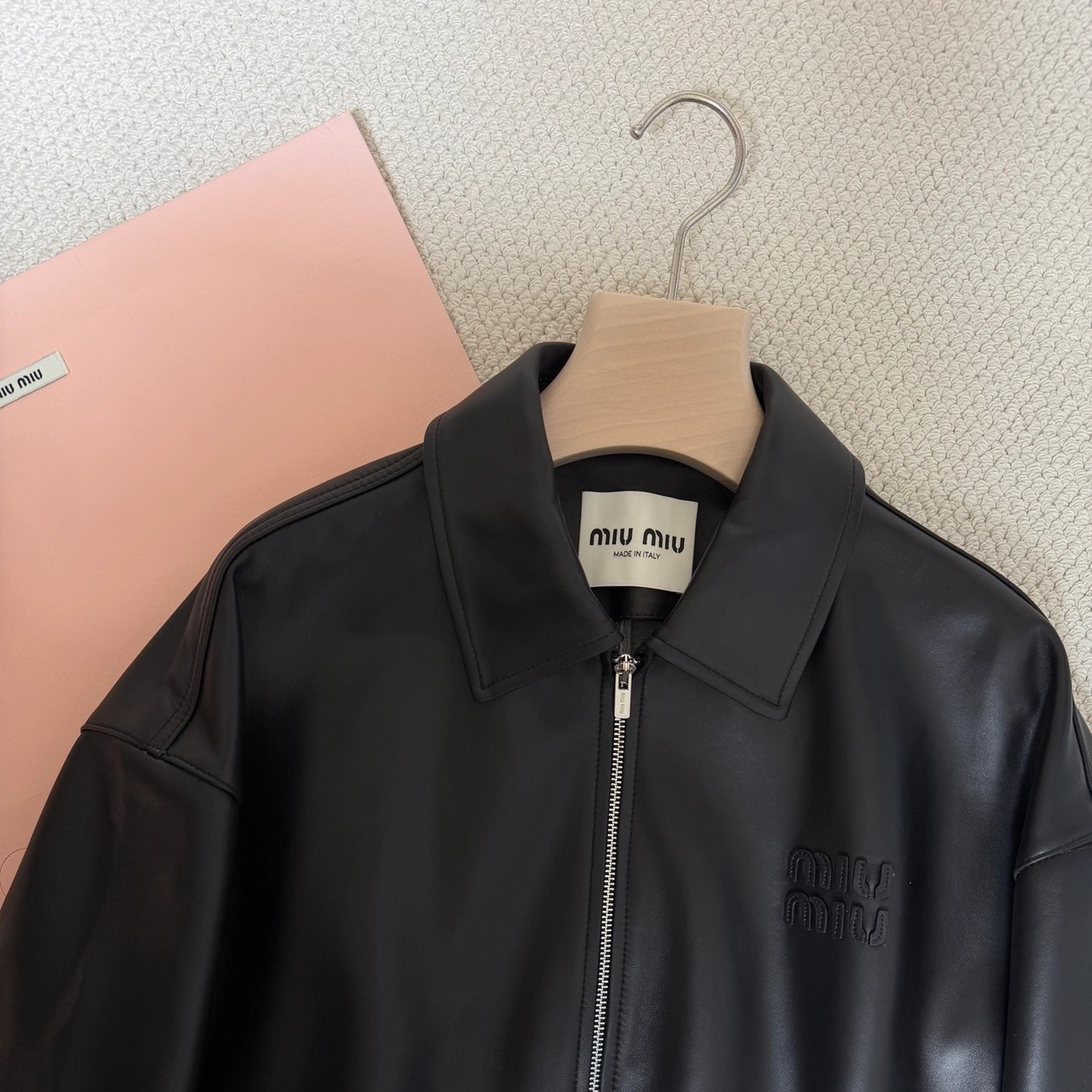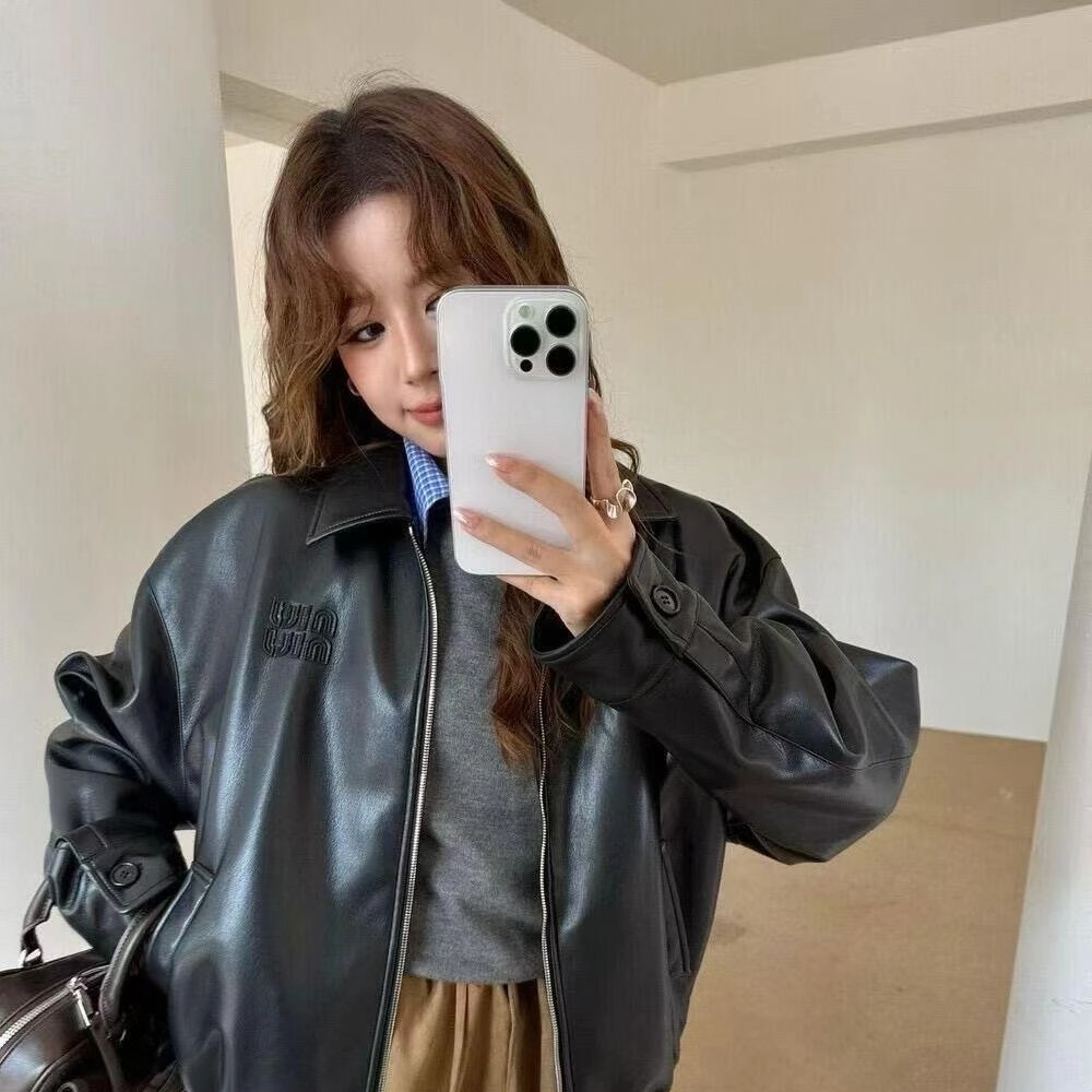 🛒Miumi* 25fw 秋冬新款翻领皮夹克外套。Y版定制高级进口小羊皮,如肌肤般富有弹性和光泽感。气质翻领,甜美落肩袖宽大立体微阔夹克版型,对身材包容性极佳,🖤少女感甜酷辣妹风轻松驾驭!