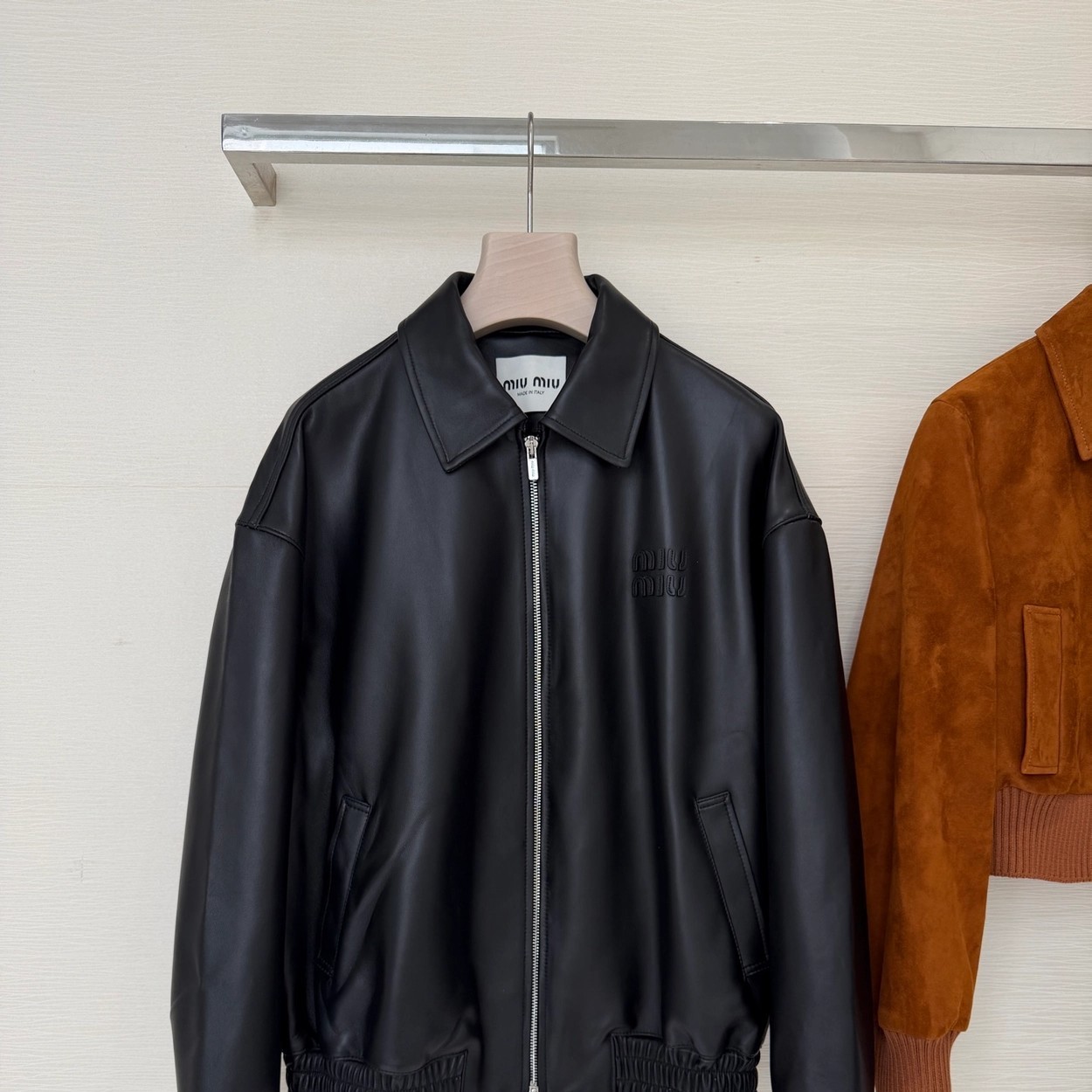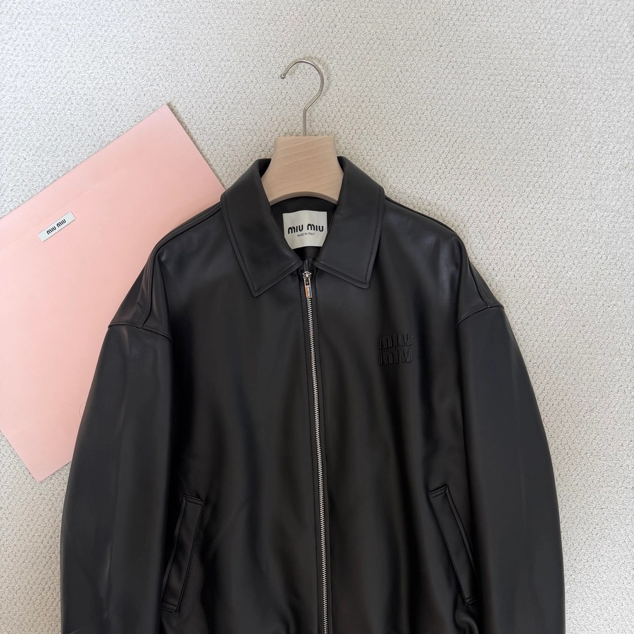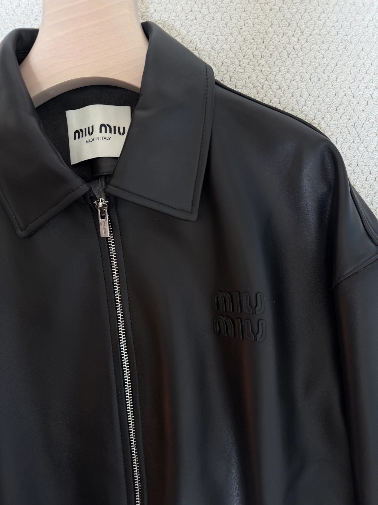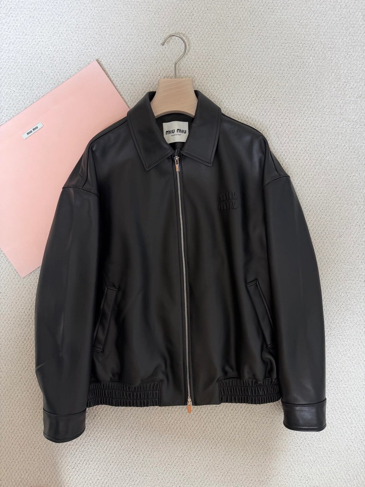 🛒Miumi* 25fw 秋冬新款翻领皮夹克外套。Y版定制高级进口小羊皮,如肌肤般富有弹性和光泽感。气质翻领,甜美落肩袖宽大立体微阔夹克版型,对身材包容性极佳,🖤少女感甜酷辣妹风轻松驾驭!