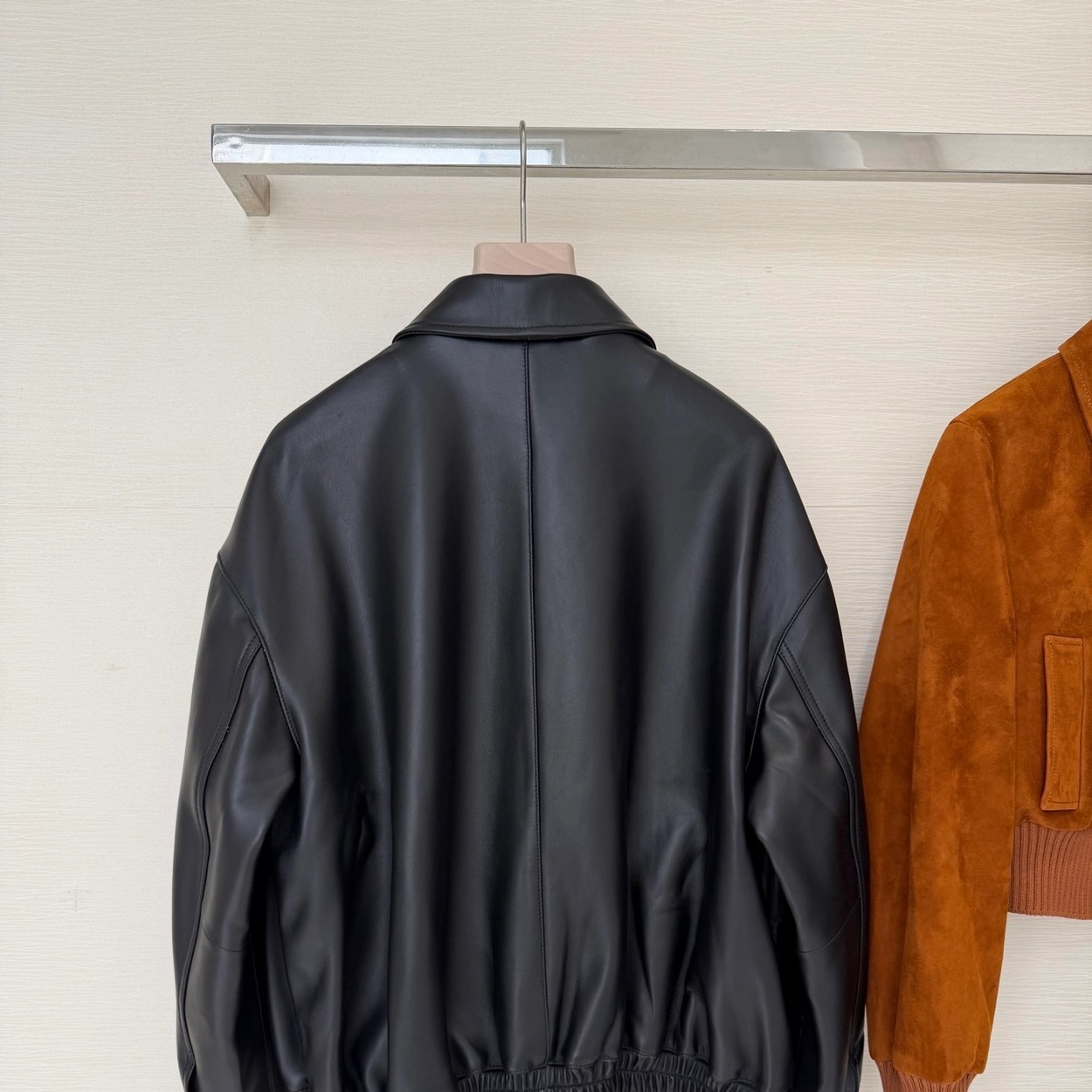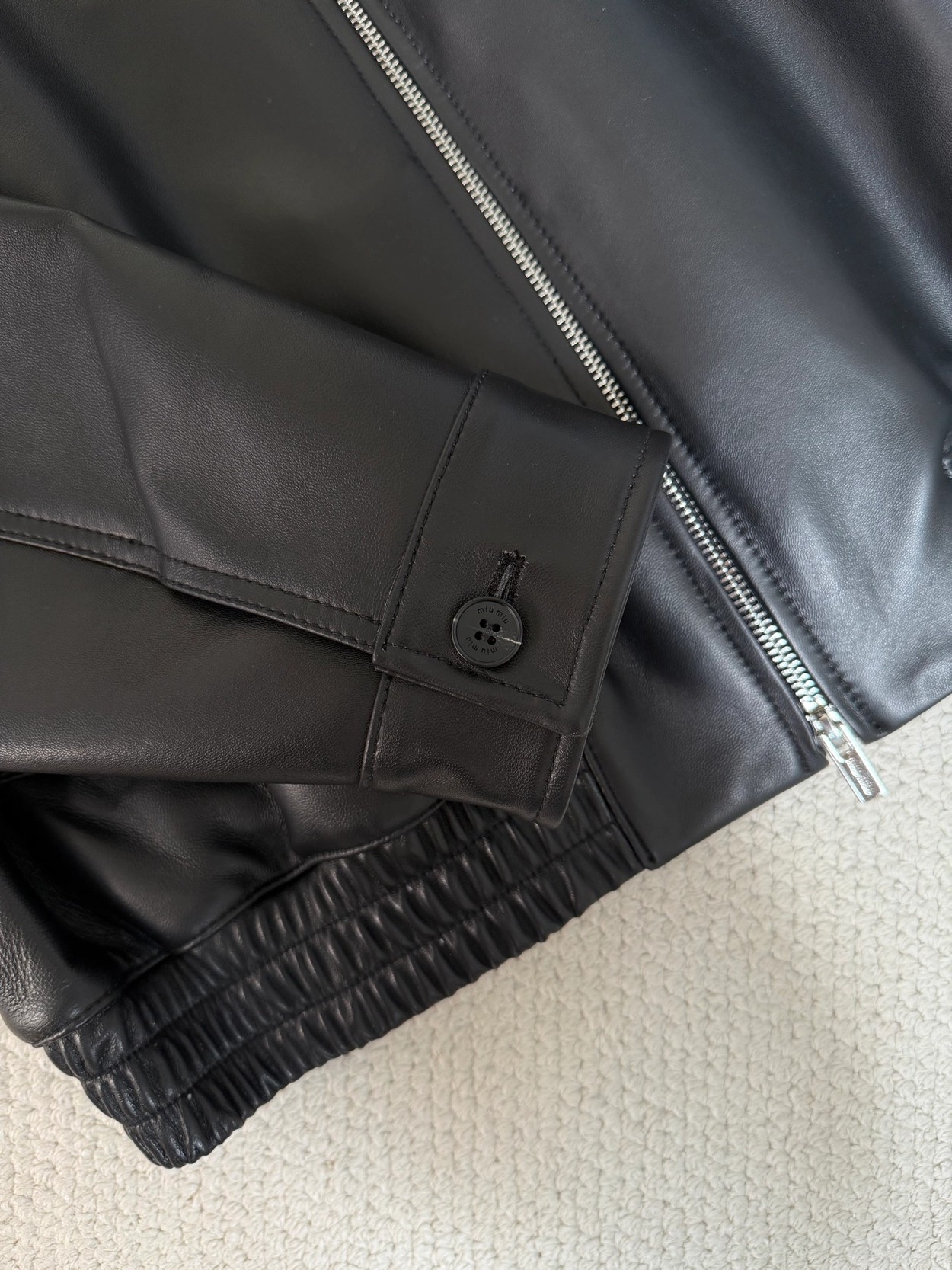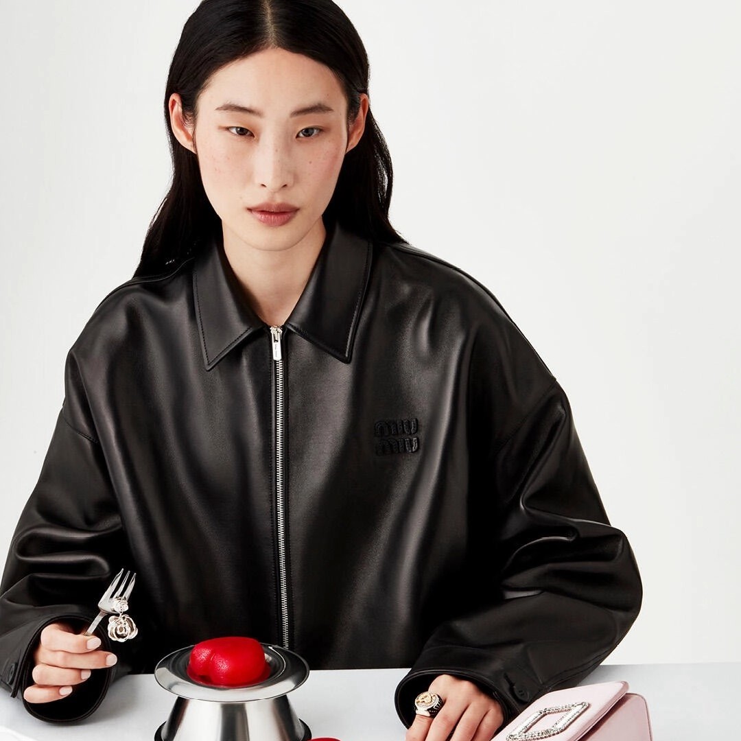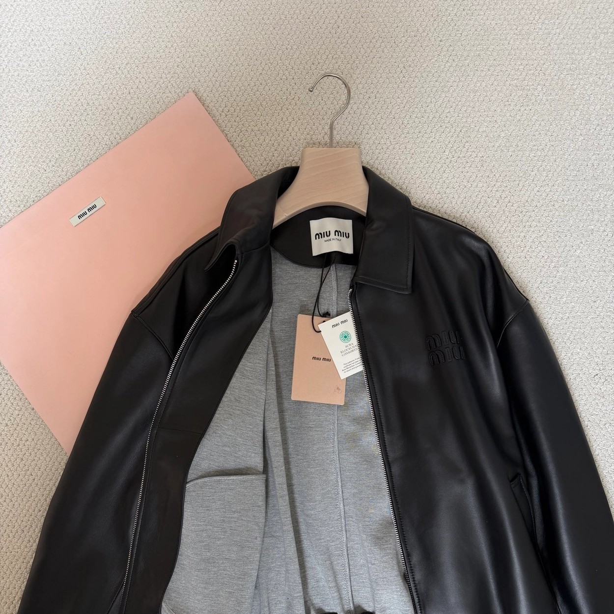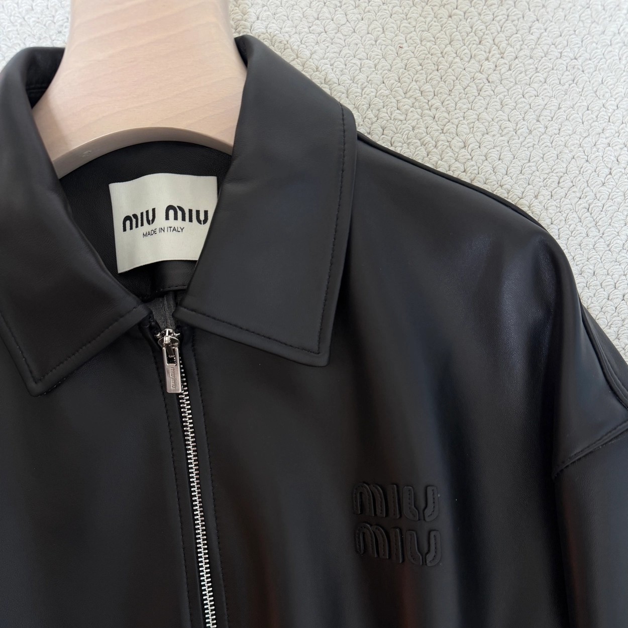 🛒Miumi* 25fw 秋冬新款翻领皮夹克外套。Y版定制高级进口小羊皮,如肌肤般富有弹性和光泽感。气质翻领,甜美落肩袖宽大立体微阔夹克版型,对身材包容性极佳,🖤少女感甜酷辣妹风轻松驾驭!