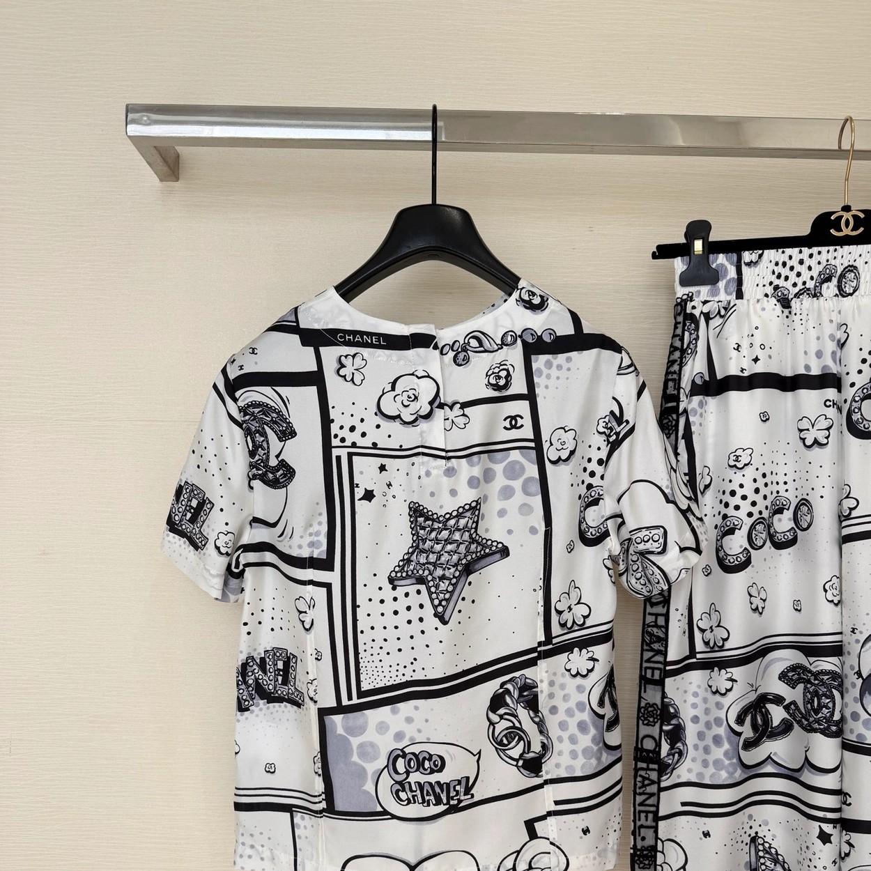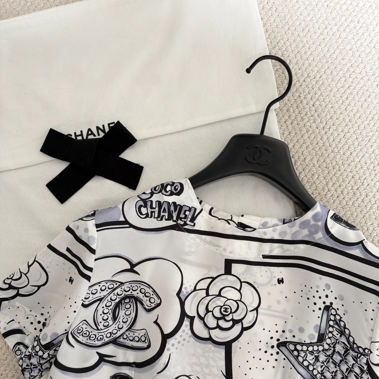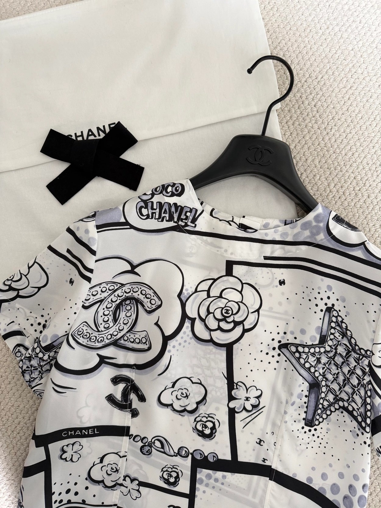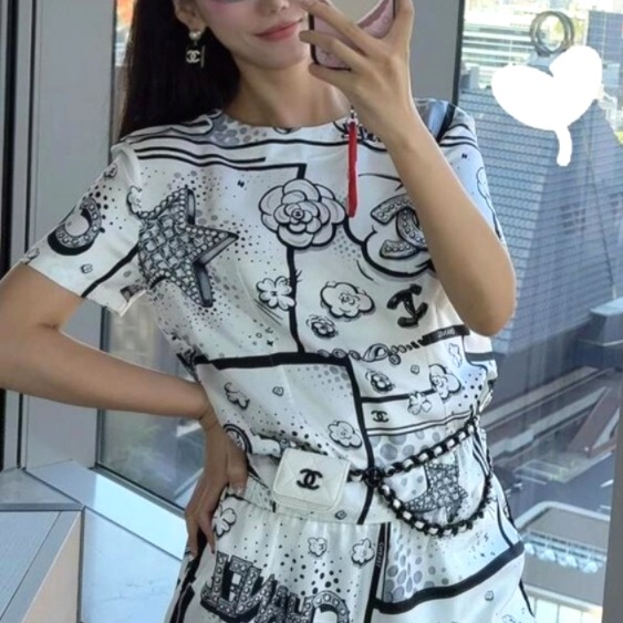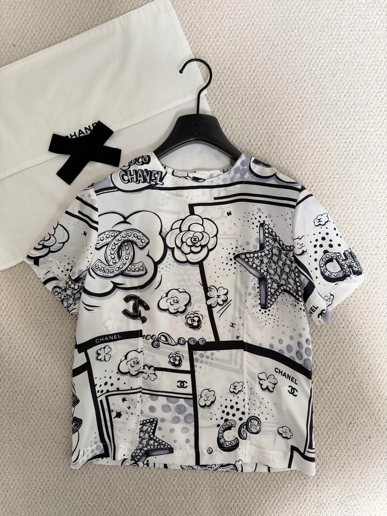 Chane* 25b林黑白漫画印花真丝上衣。Y版定制真丝印花,手感细腻轻薄透气。经典黑白色系,巴洛克风格印花双C和星星元素,艺术感满满。圆领合身版型,后背纽扣开合装饰,打造高级时尚穿搭。