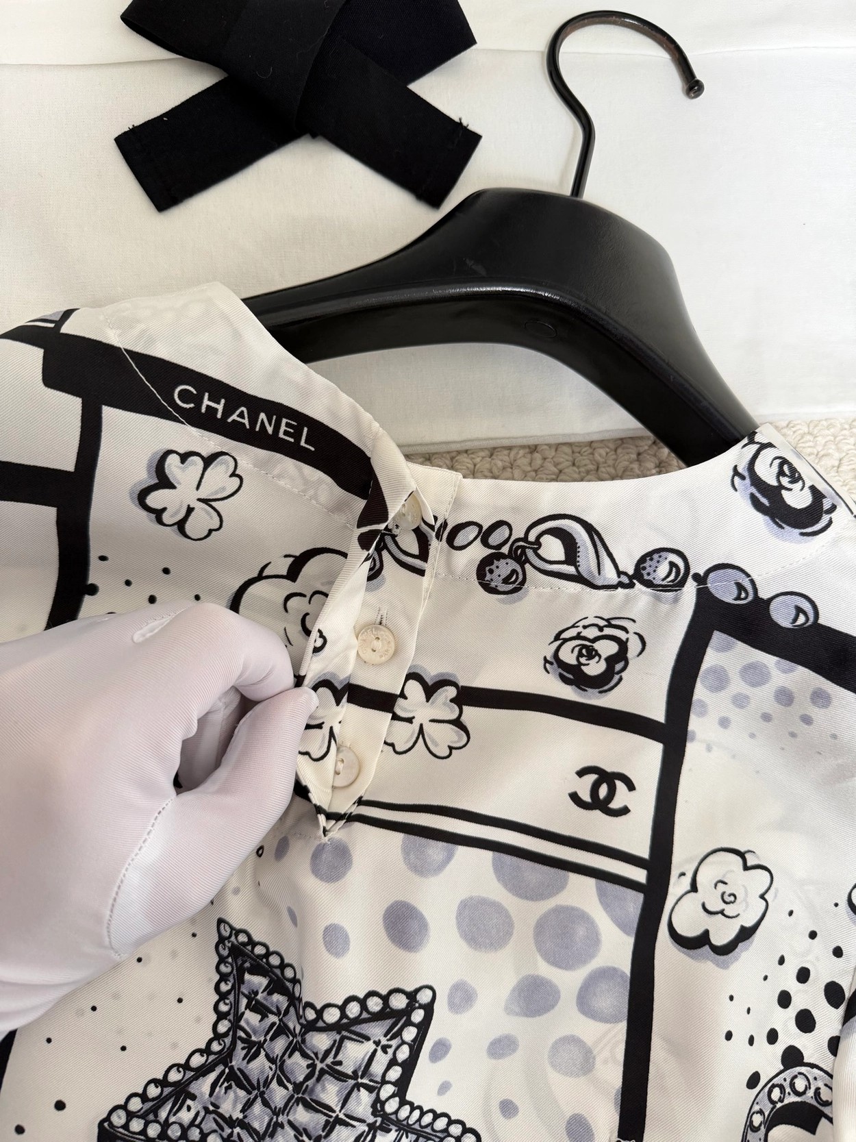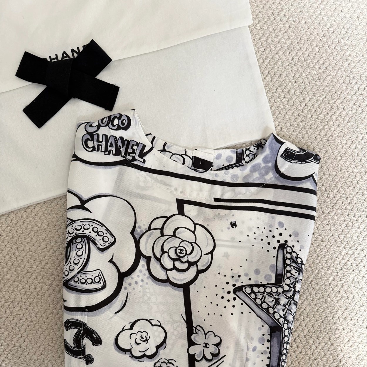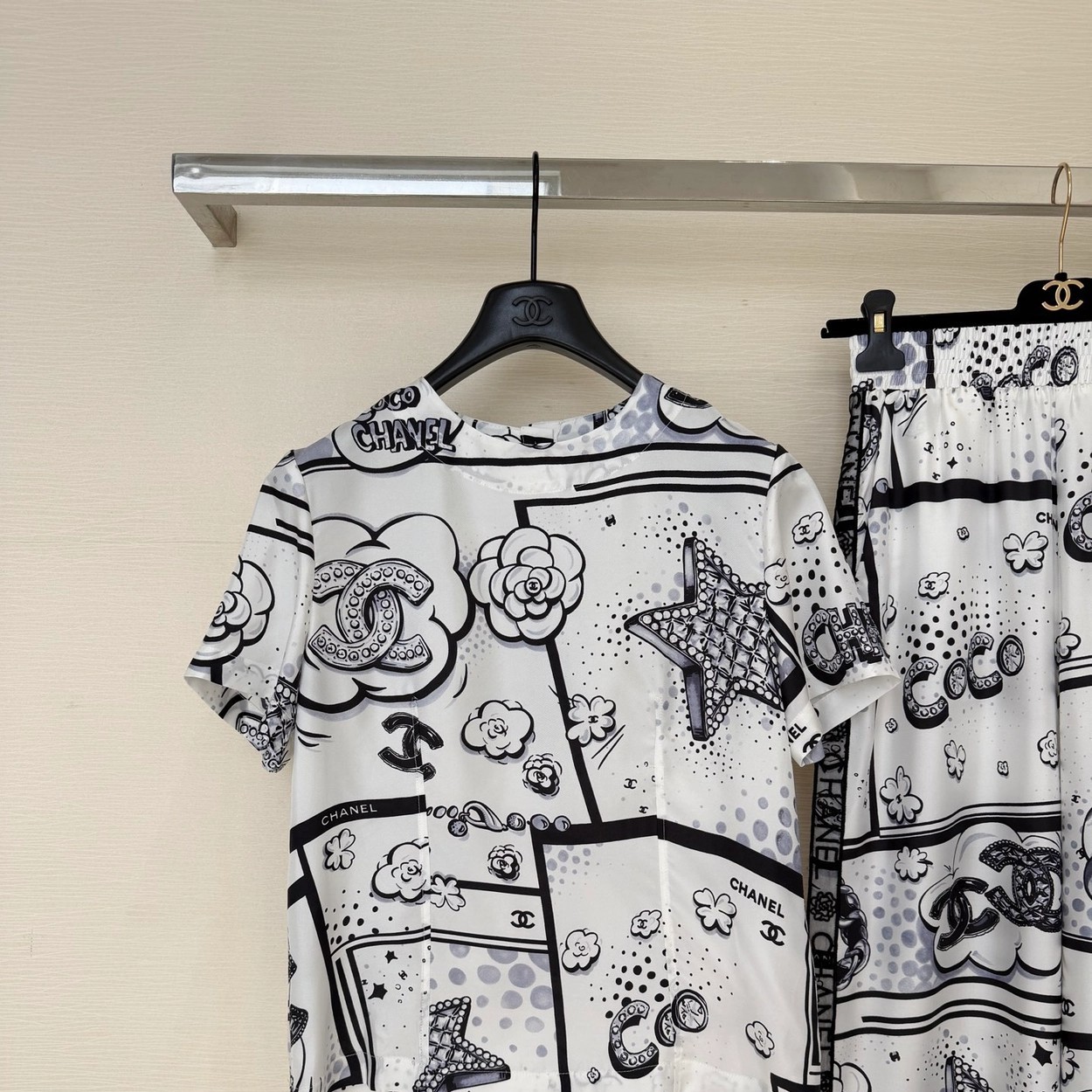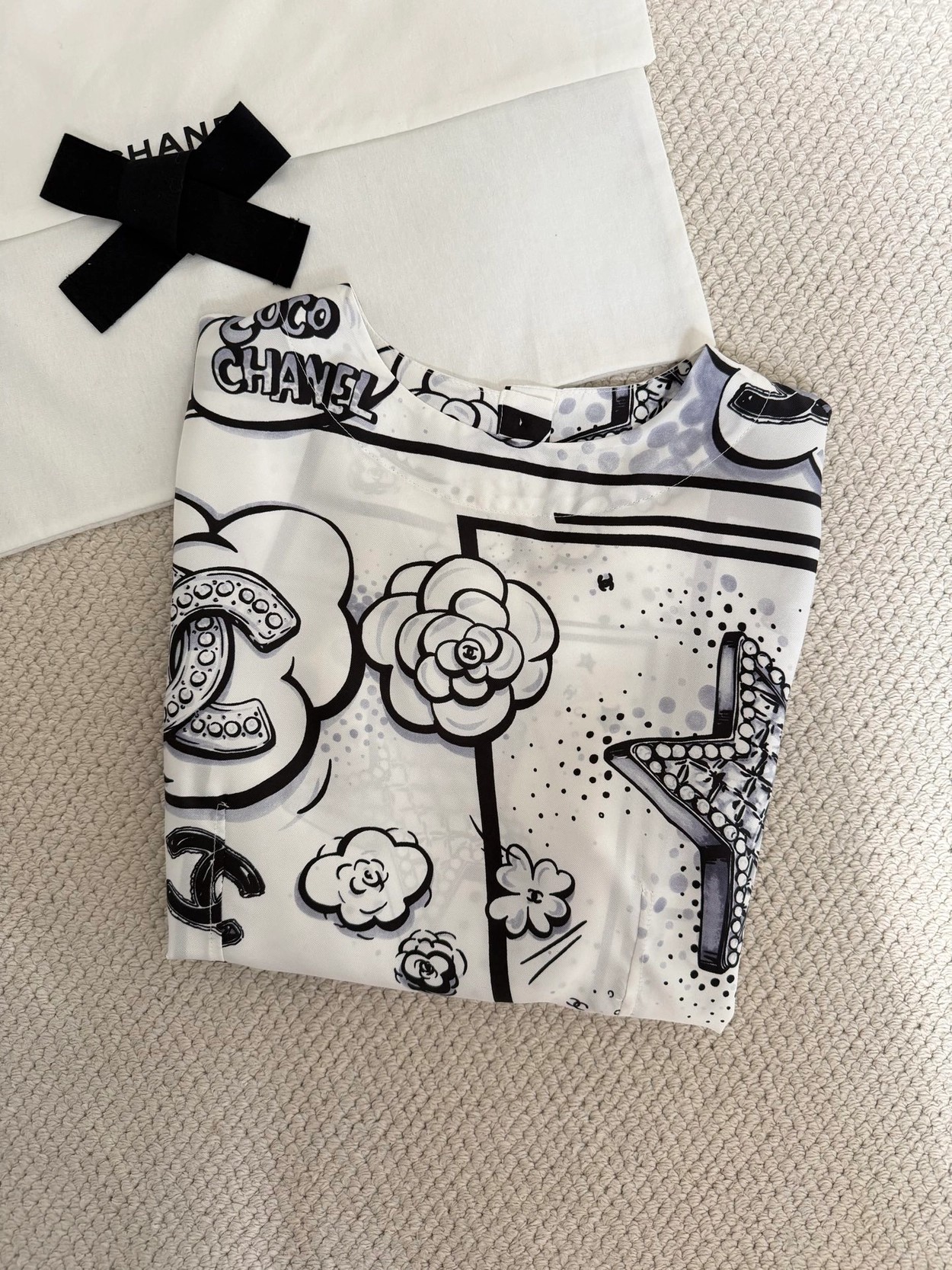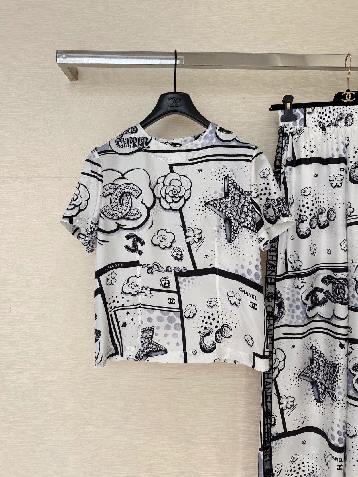 Chane* 25b林黑白漫画印花真丝上衣。Y版定制真丝印花,手感细腻轻薄透气。经典黑白色系,巴洛克风格印花双C和星星元素,艺术感满满。圆领合身版型,后背纽扣开合装饰,打造高级时尚穿搭。