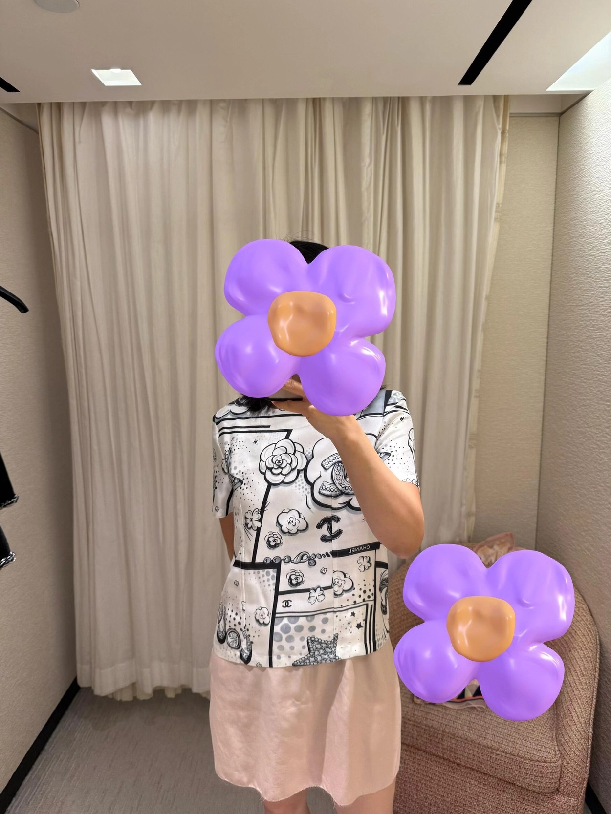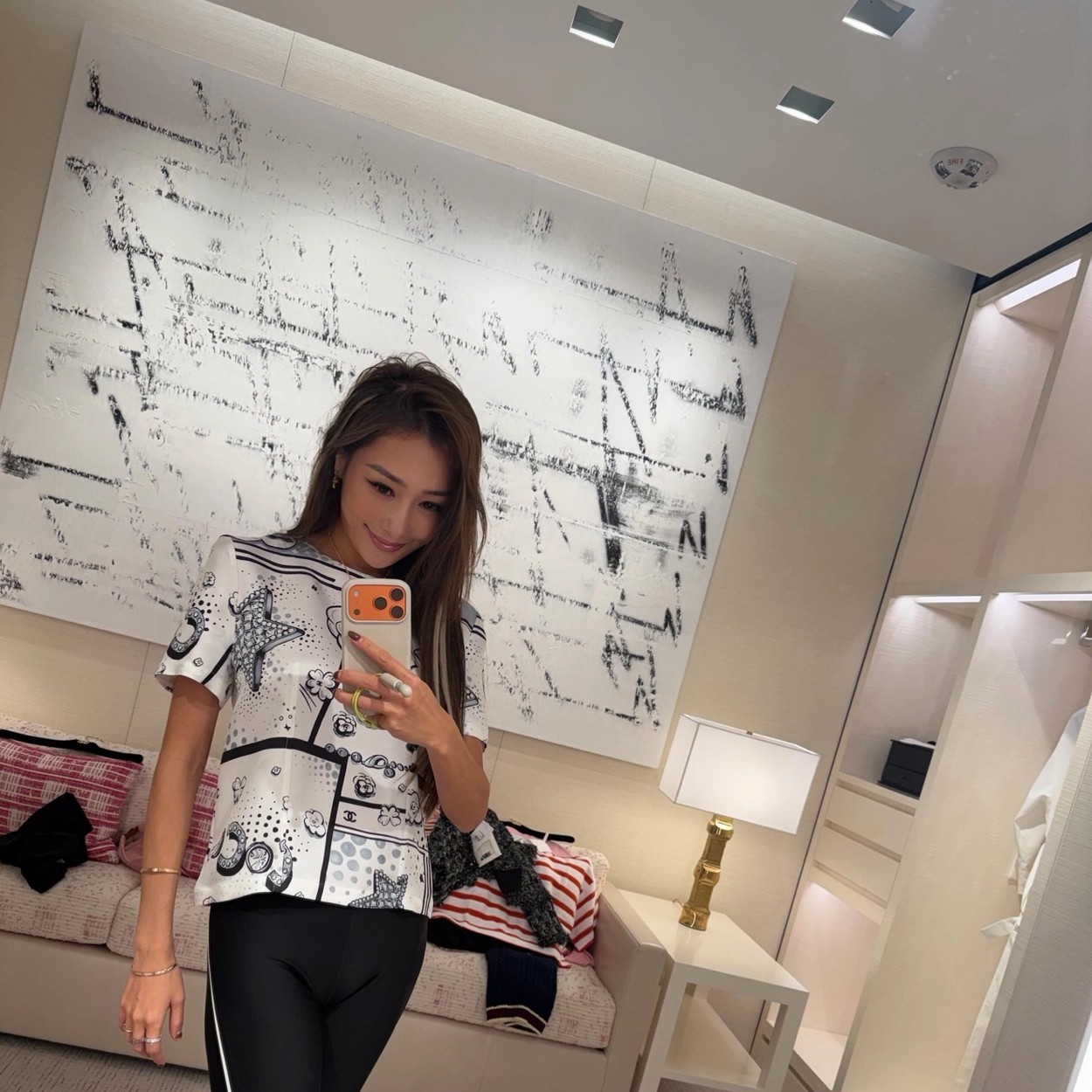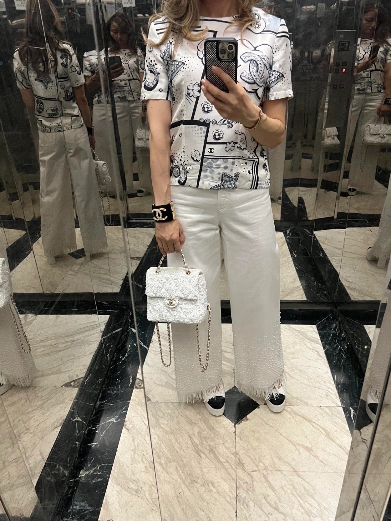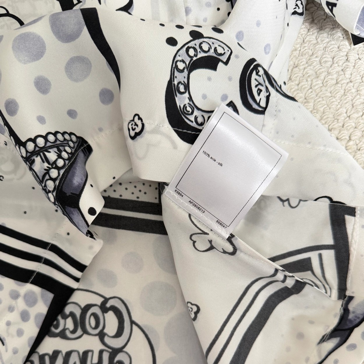 Chane* 25b林黑白漫画印花真丝上衣。Y版定制真丝印花,手感细腻轻薄透气。经典黑白色系,巴洛克风格印花双C和星星元素,艺术感满满。圆领合身版型,后背纽扣开合装饰,打造高级时尚穿搭。