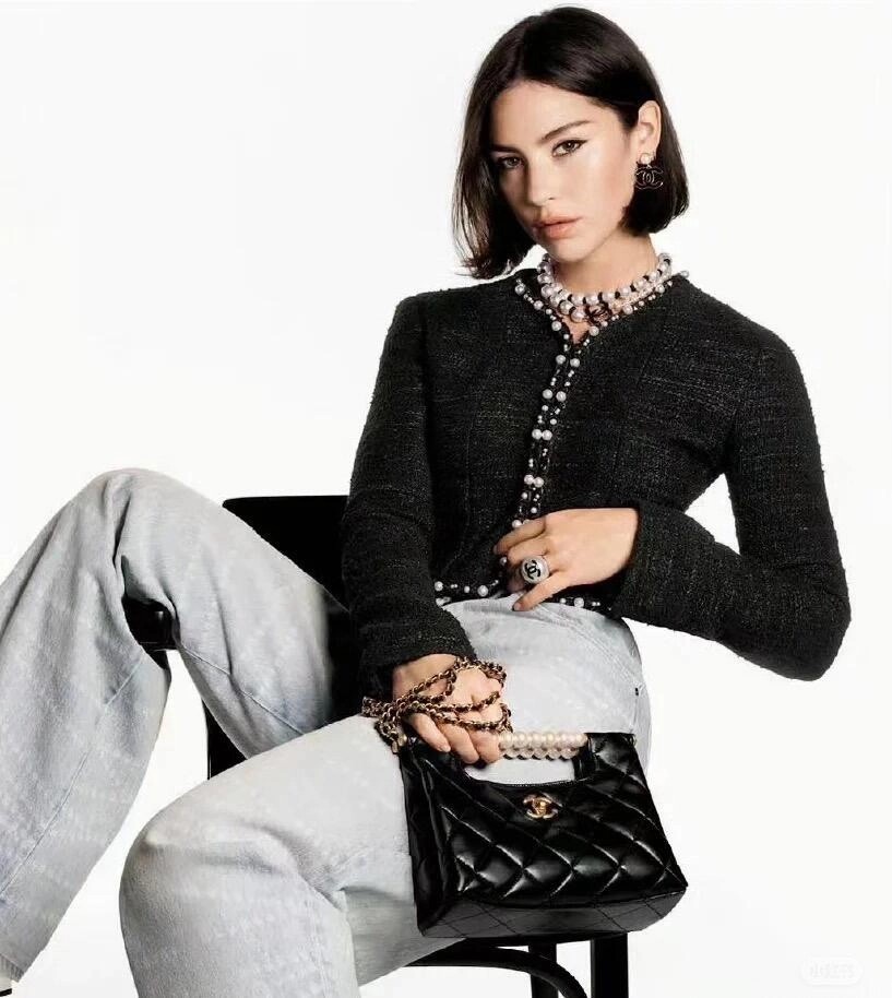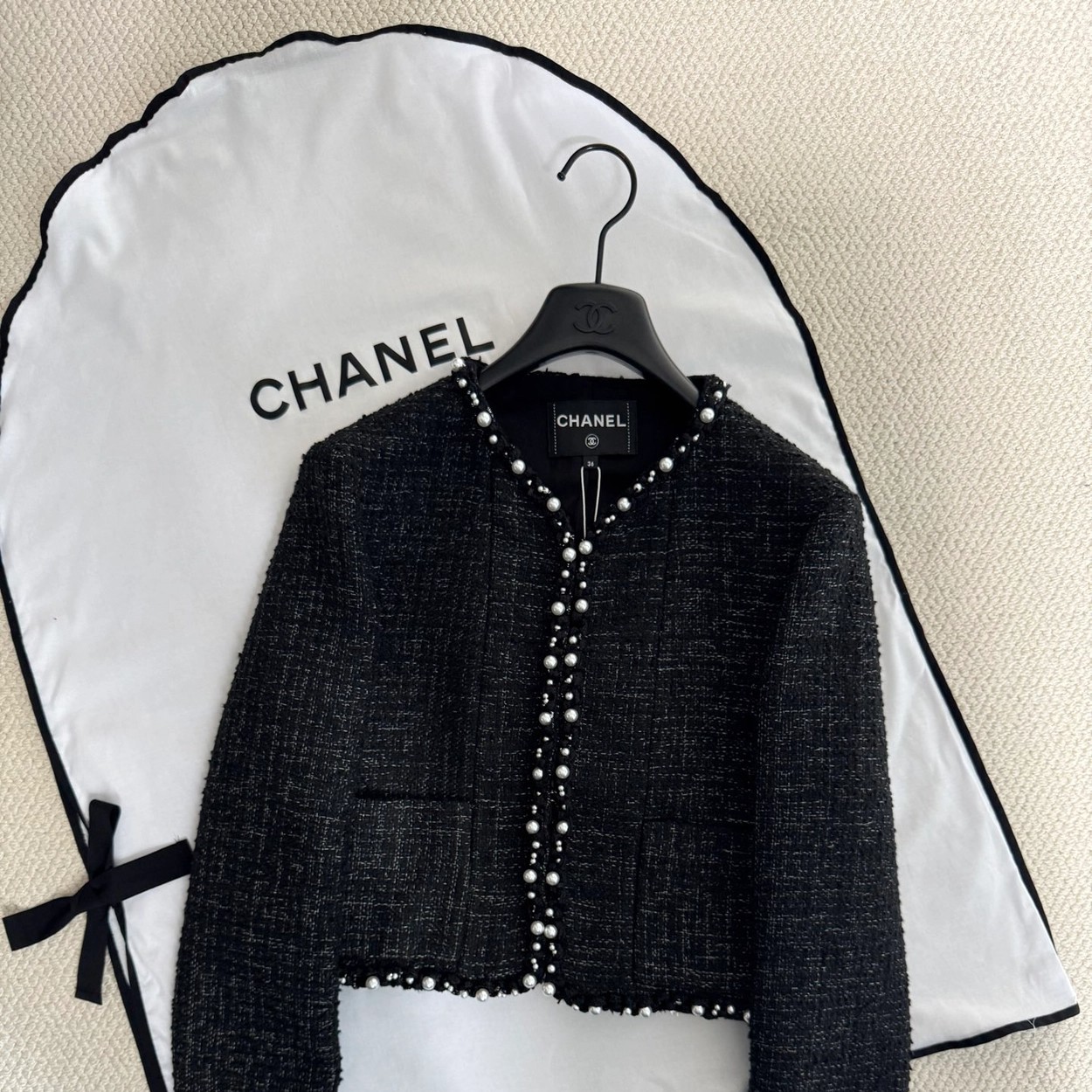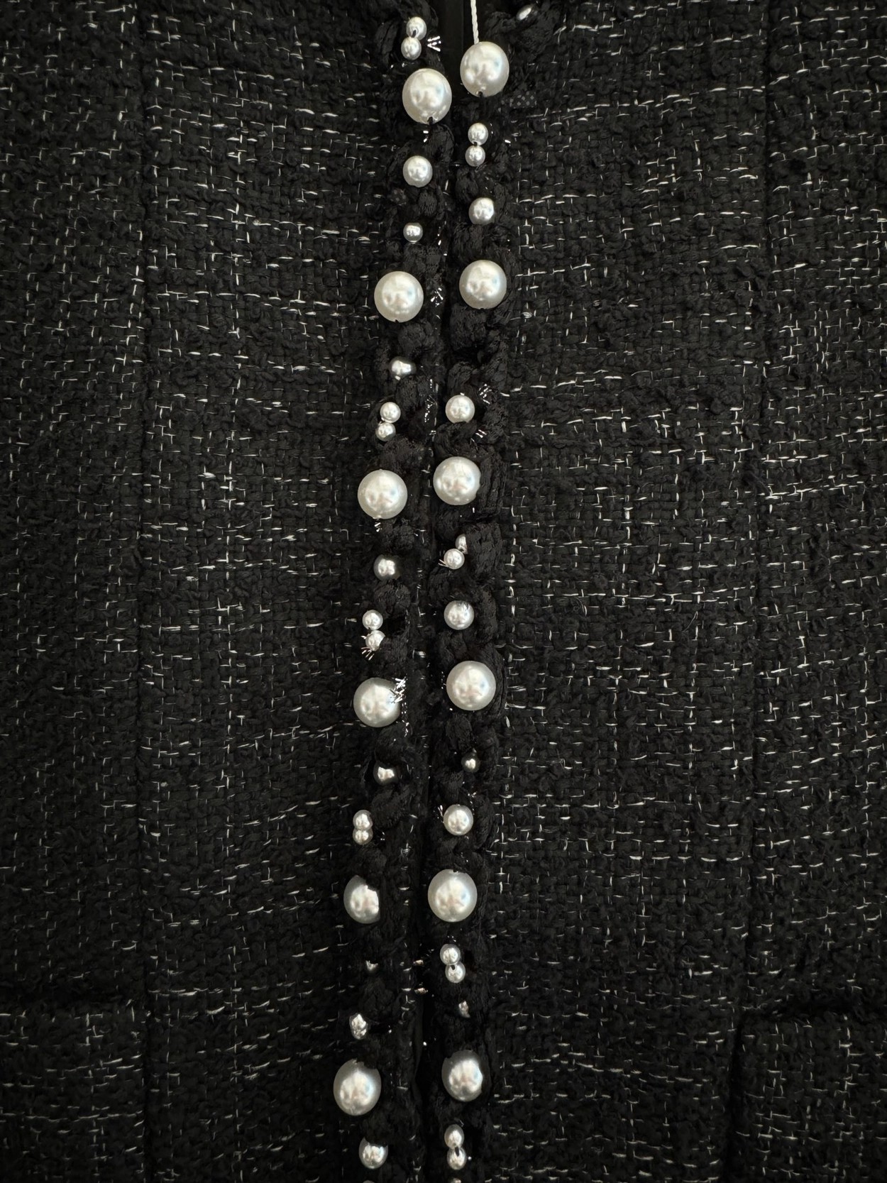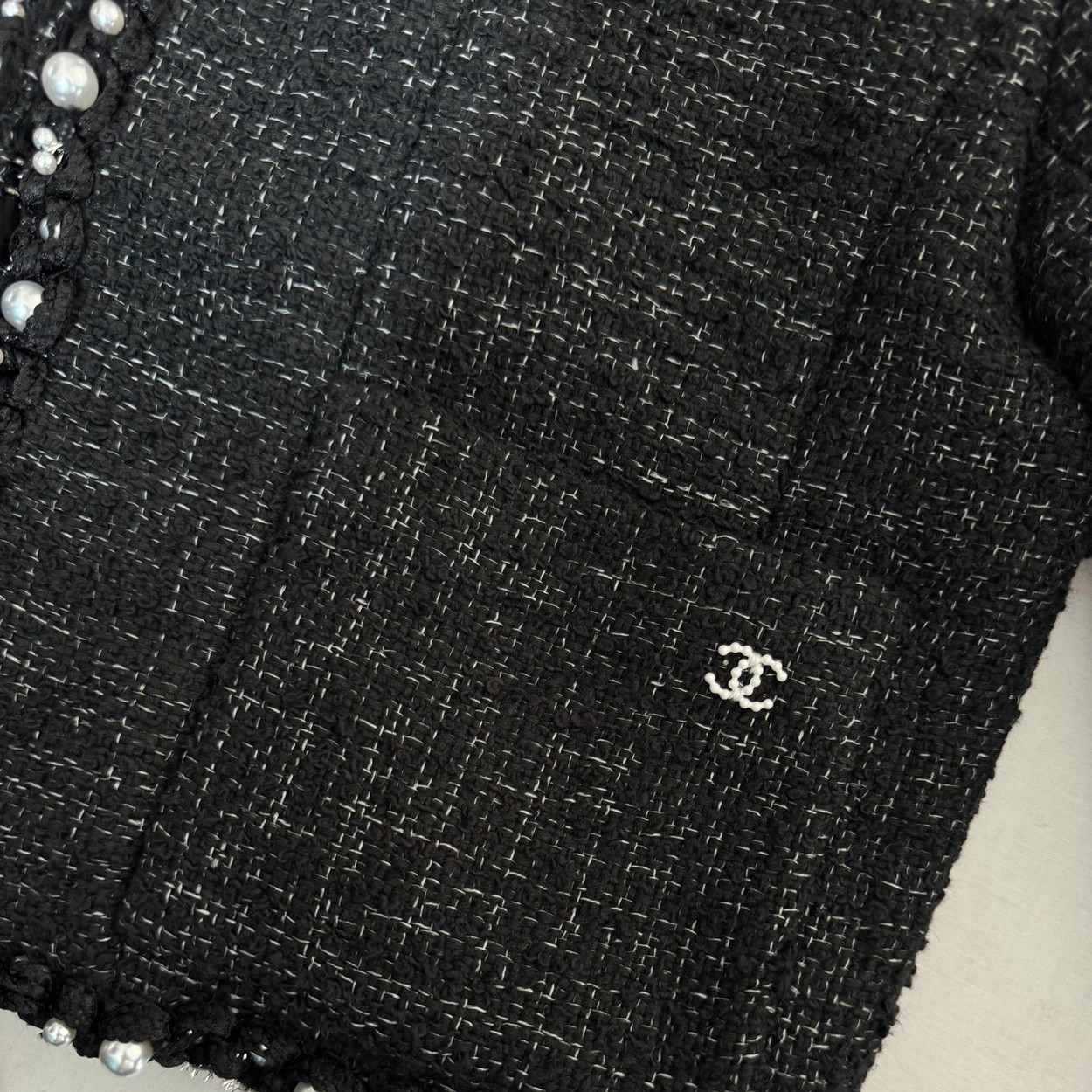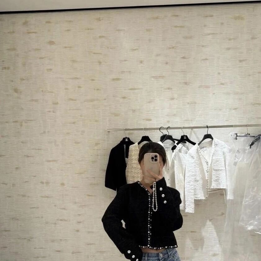 🛒Chane* 25p新款黑色珍珠外套。精美绝伦,名媛格调,优雅千金感知性温柔必入时尚单品!Y版定制棉纱和圈圈纱黑白编织面料,配合细腻的银丝纱线交织出纹理满铺于全身,细节精美绝伦。V领落肩袖短版型,全手工大小珍珠编制条装饰,腰侧口袋双C标点亮细节。常规版型超显气质,无论是聚会还是上班都能轻松驾驭!