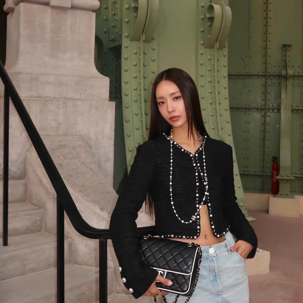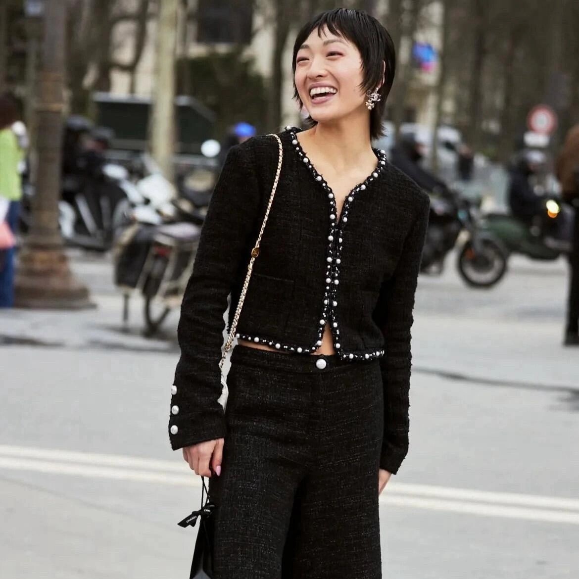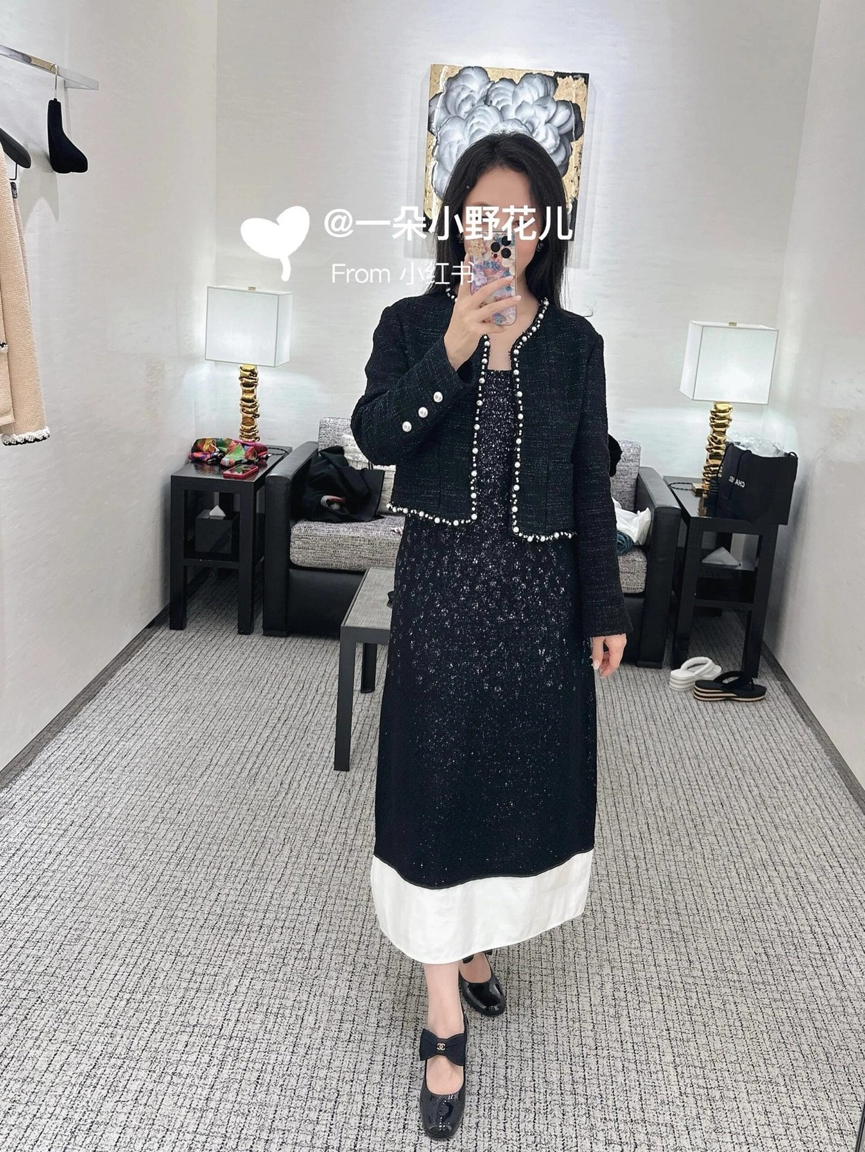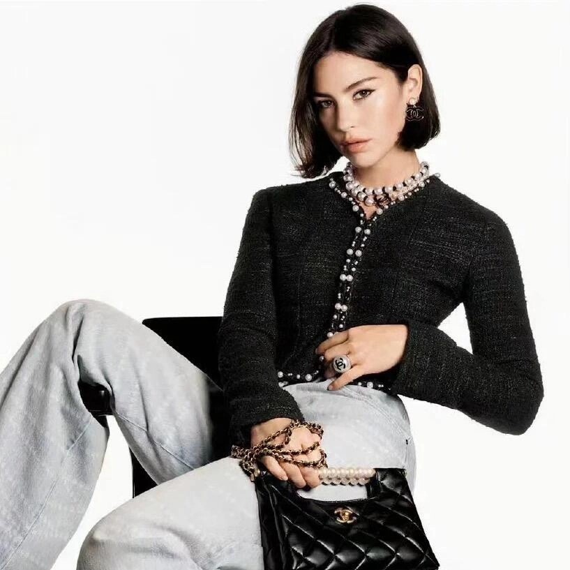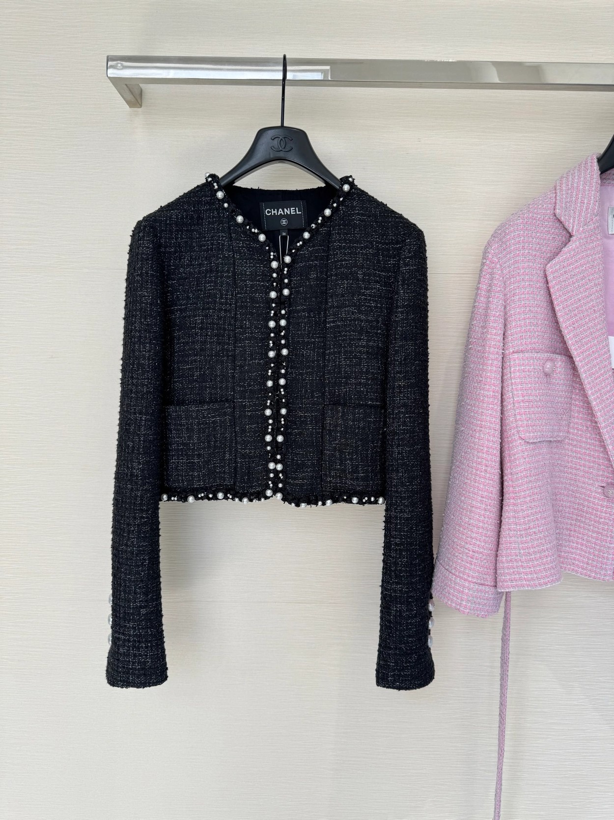 🛒Chane* 25p新款黑色珍珠外套。精美绝伦,名媛格调,优雅千金感知性温柔必入时尚单品!Y版定制棉纱和圈圈纱黑白编织面料,配合细腻的银丝纱线交织出纹理满铺于全身,细节精美绝伦。V领落肩袖短版型,全手工大小珍珠编制条装饰,腰侧口袋双C标点亮细节。常规版型超显气质,无论是聚会还是上班都能轻松驾驭!