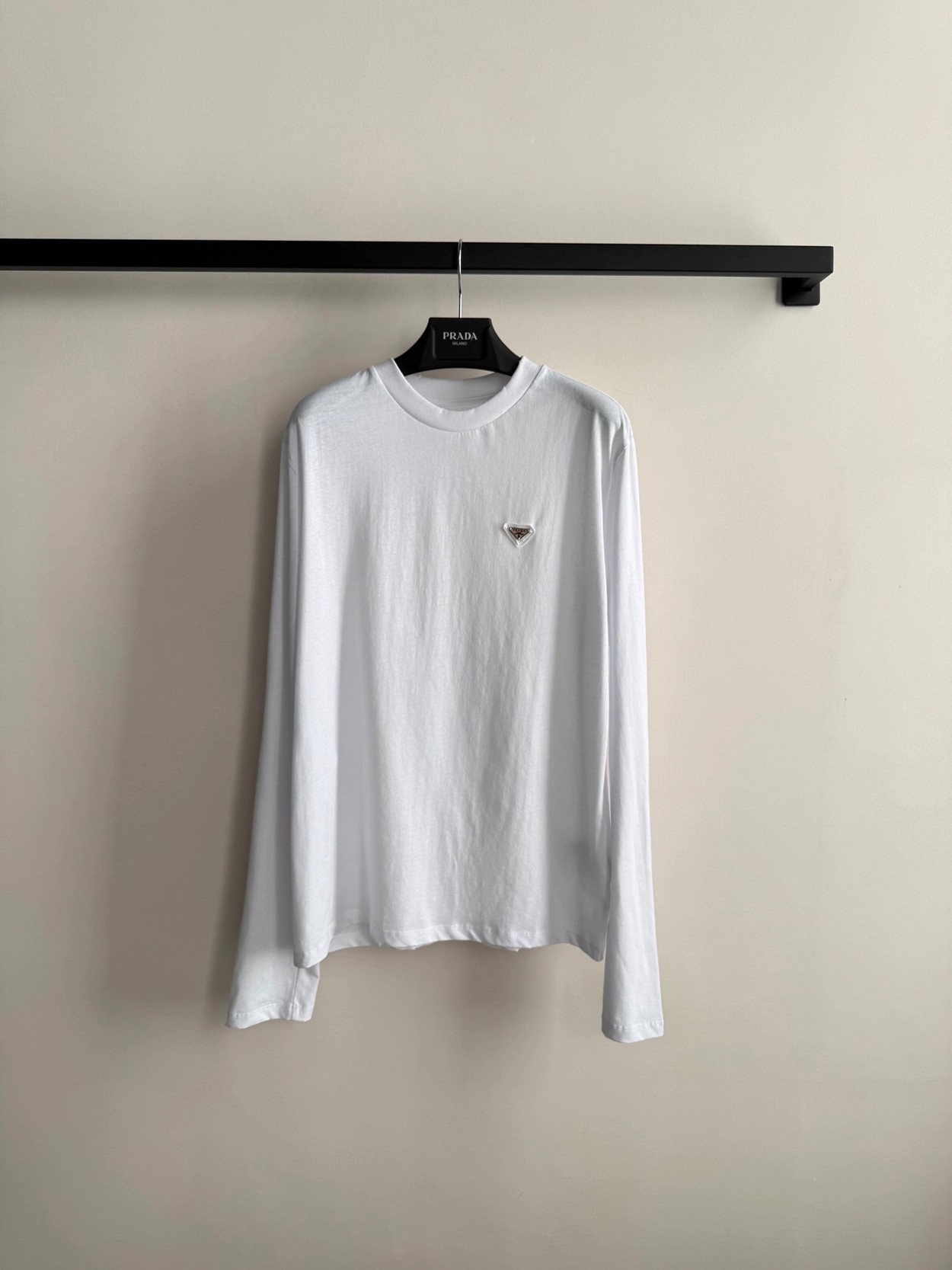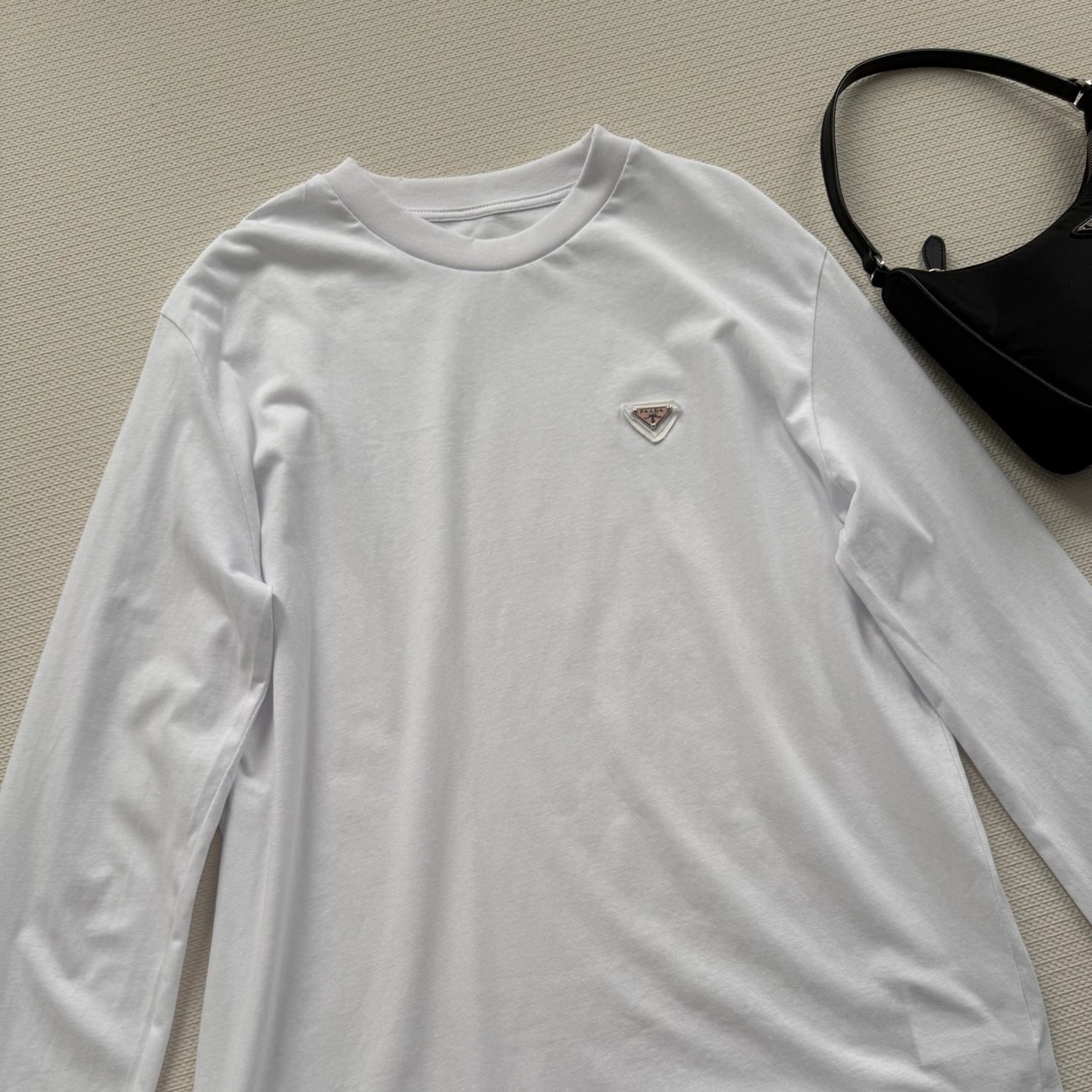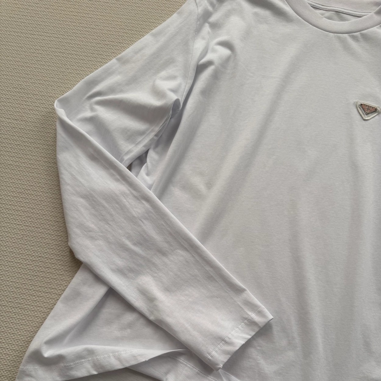Prad*经典三角标(粉色标)白色长袖T恤,采用高品质棉料,柔软亲肤,穿着超舒适!胸前倒三角徽标低调又有辨识度✨,简约百搭,单穿或内搭都很OK。宽松版型,包容多种身材,白色清爽,牛仔裤、半裙随意搭配,轻松切换慵懒or通勤风~日常、聚会都能轻松驾驭,是衣橱必备实用单品SML.AE0666270