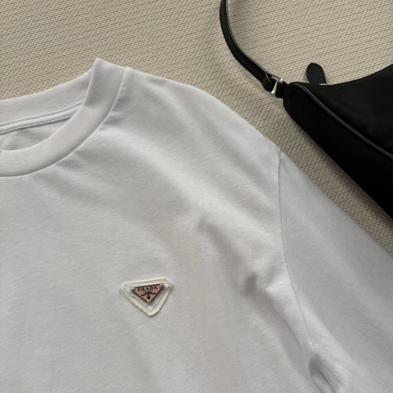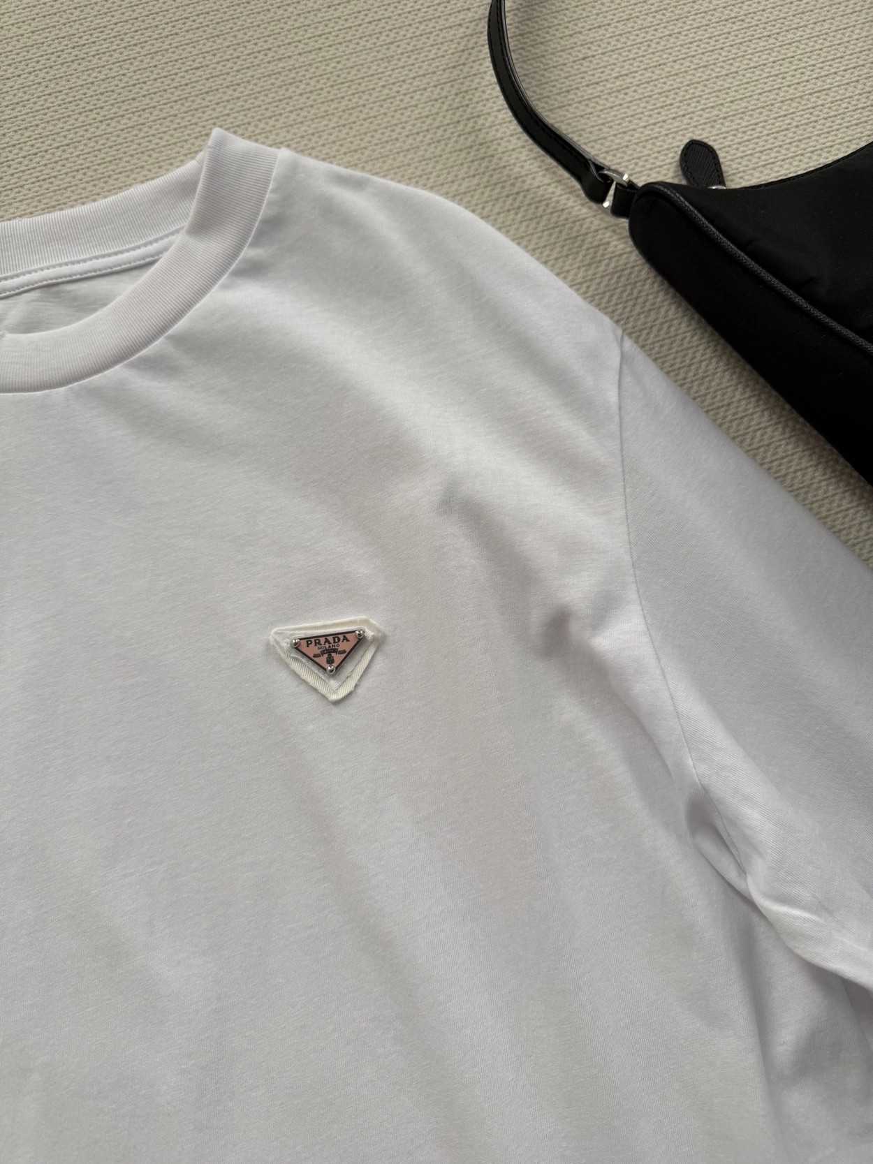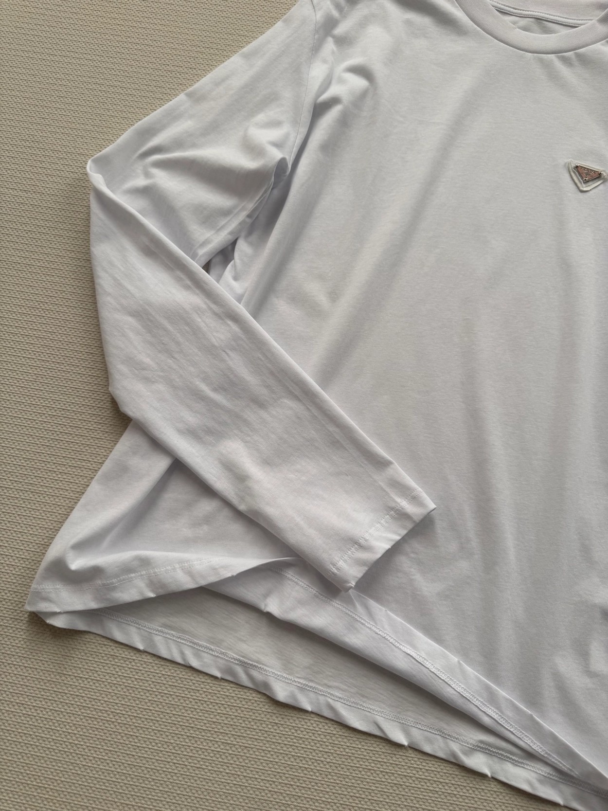 Prad*经典三角标(粉色标)白色长袖T恤,采用高品质棉料,柔软亲肤,穿着超舒适!胸前倒三角徽标低调又有辨识度✨,简约百搭,单穿或内搭都很OK。宽松版型,包容多种身材,白色清爽,牛仔裤、半裙随意搭配,轻松切换慵懒or通勤风~日常、聚会都能轻松驾驭,是衣橱必备实用单品SML.AE0666270