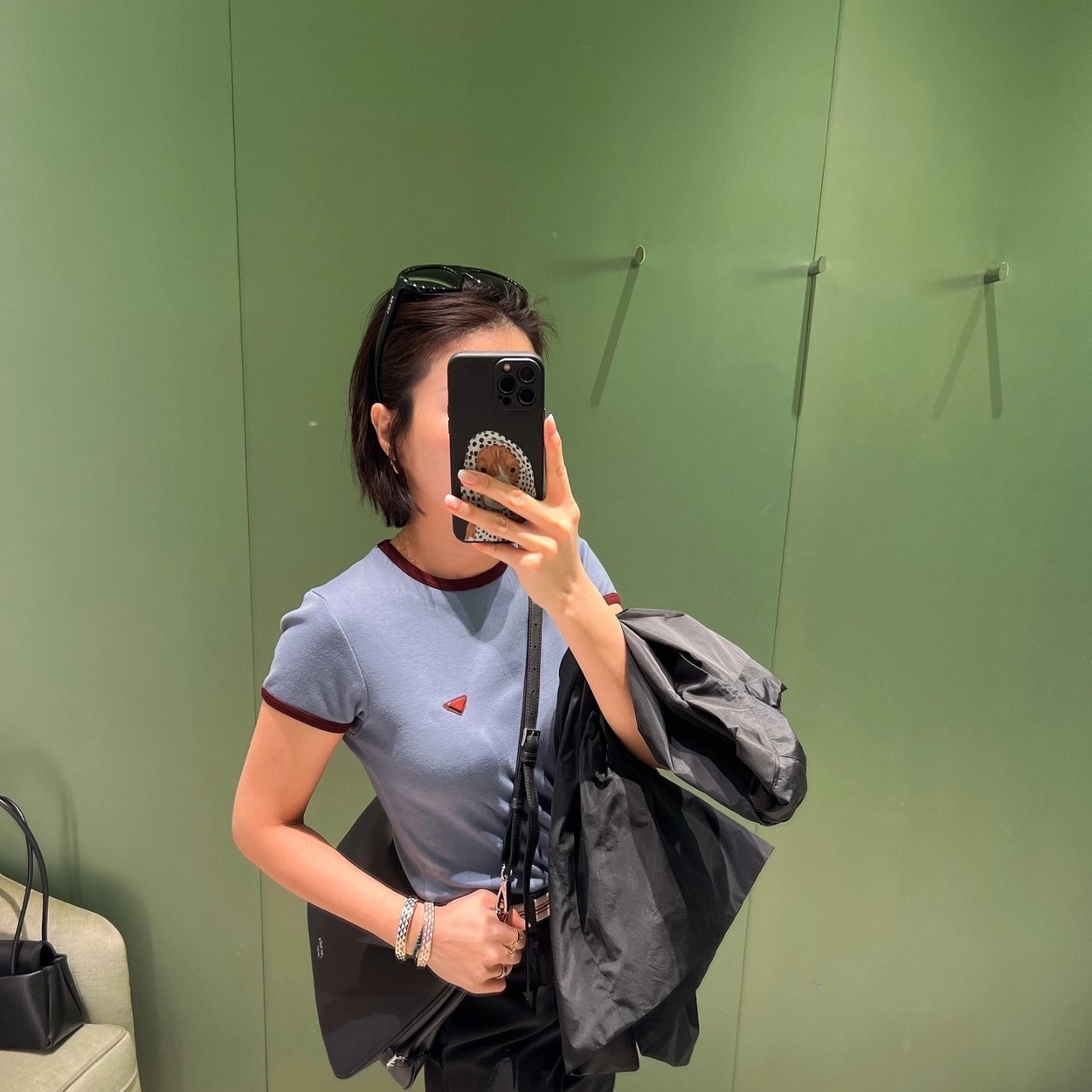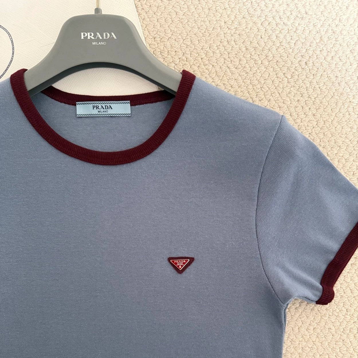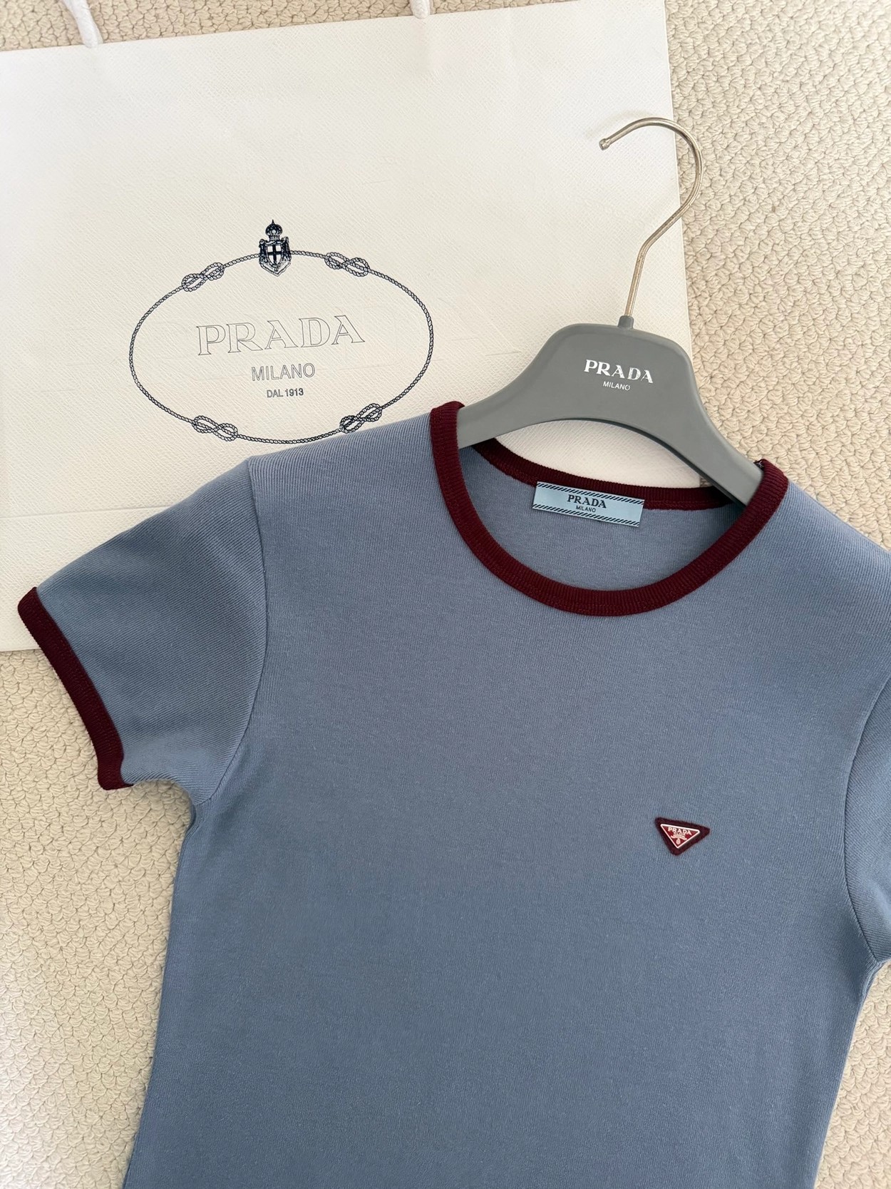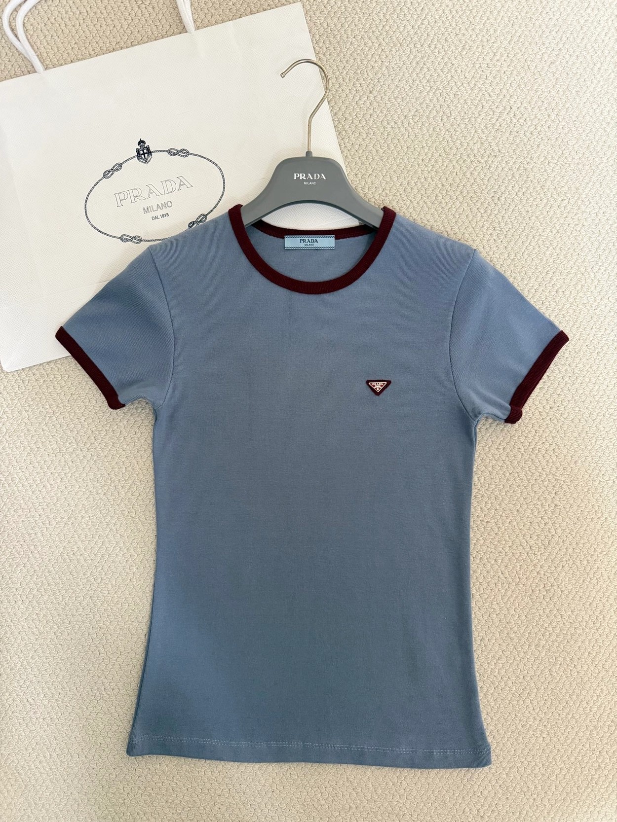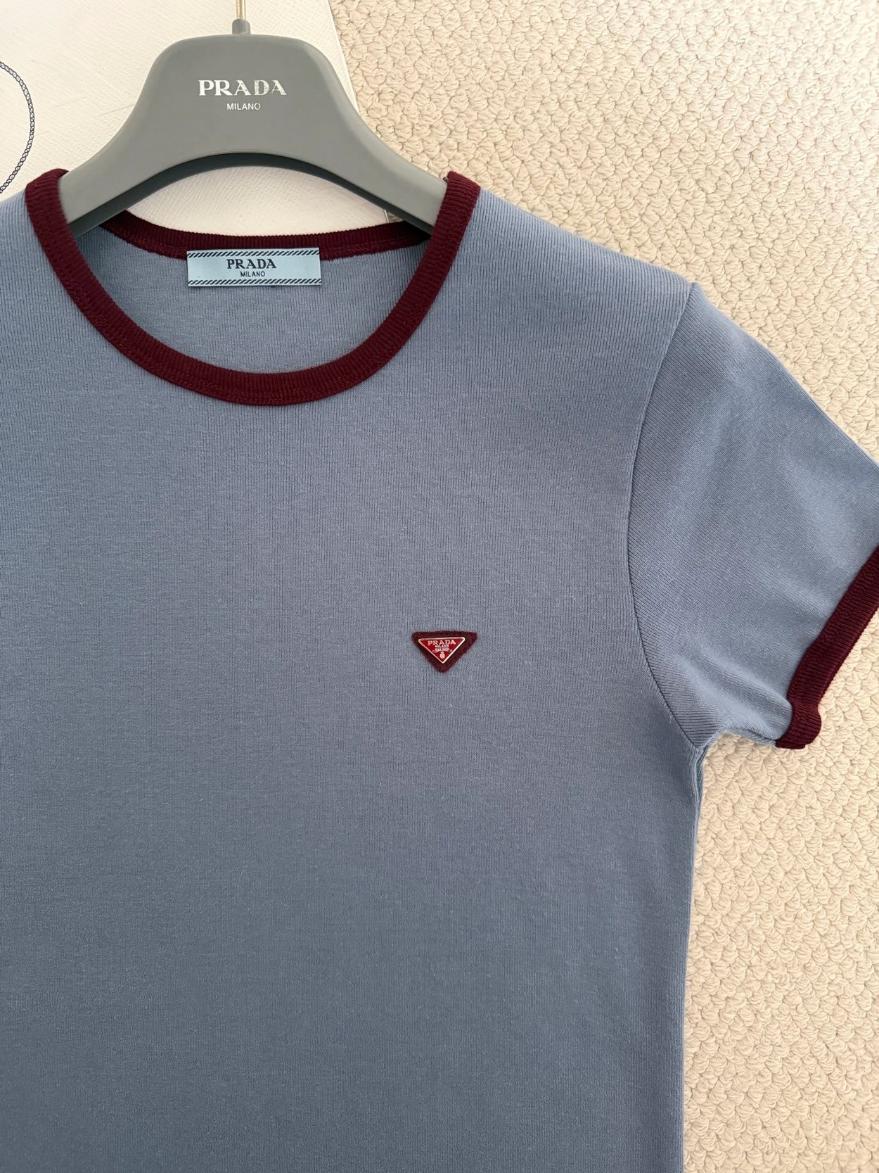 🛒Prad* 26s春夏新款撞色圆领短袖t。Y版定制高克重纯棉材质,厚度适中柔软自然垂坠质感。酒红边饰设计超有辨识度,胸前三角Logo铭牌装饰。修身弹力,上身复古时尚显瘦又气质,单穿打底都适合。